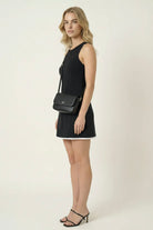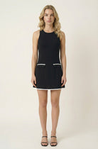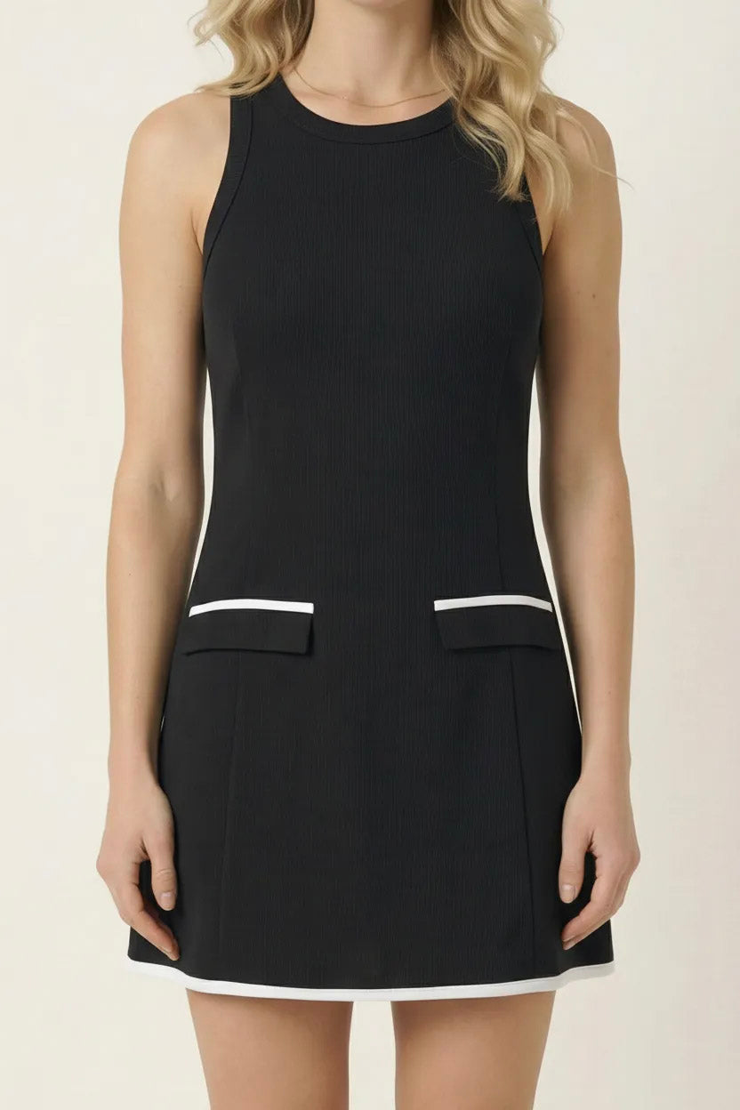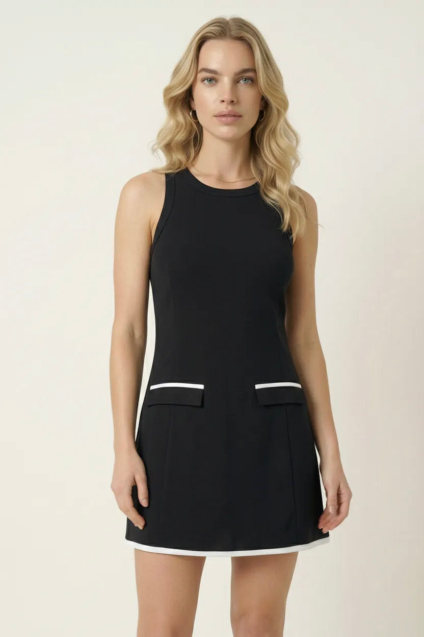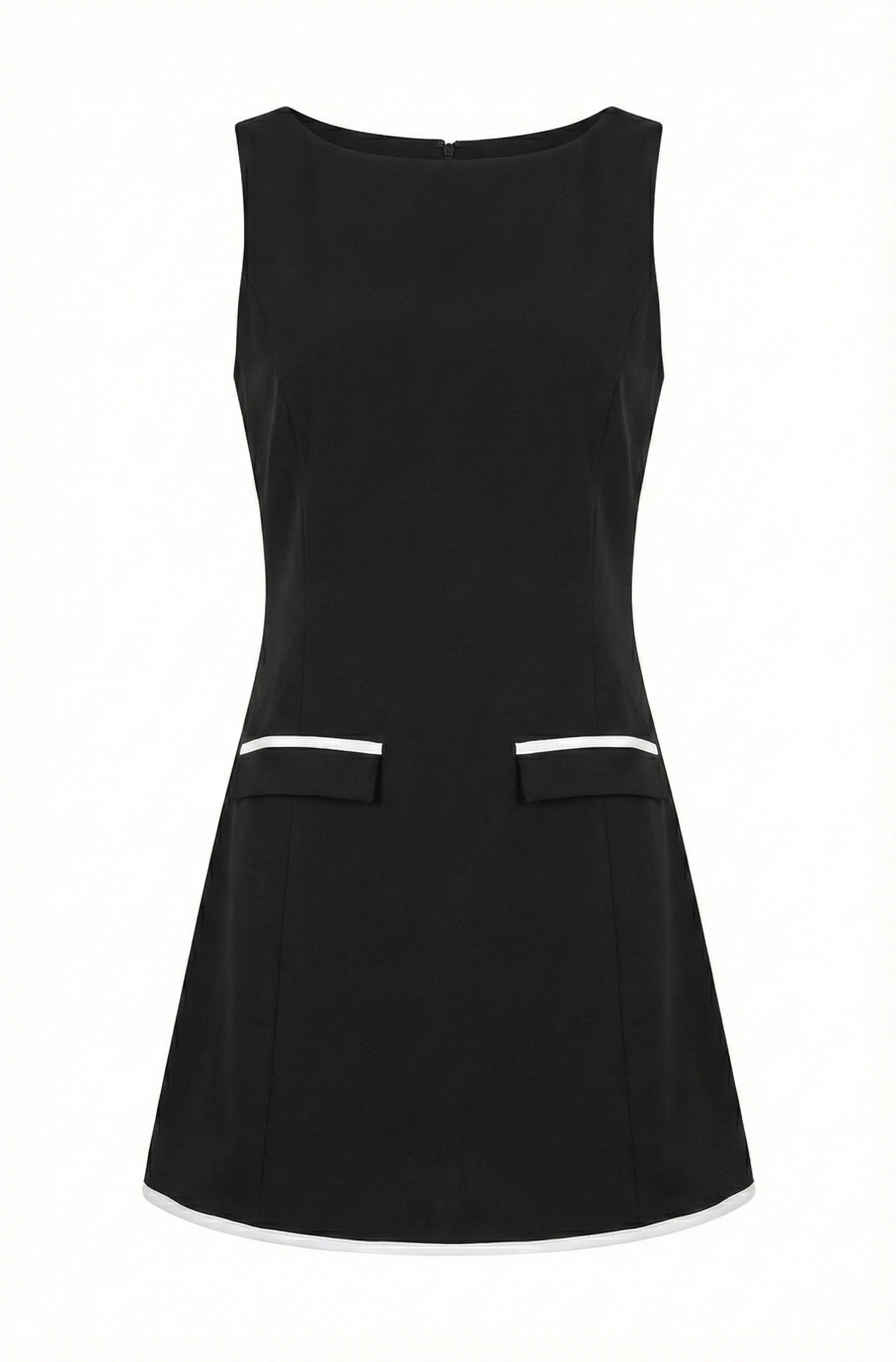 Sleeveless Mini Shift Dress with Crew Neckline Contrast Trim Pocket Detail and Clean Tailored Silhouette