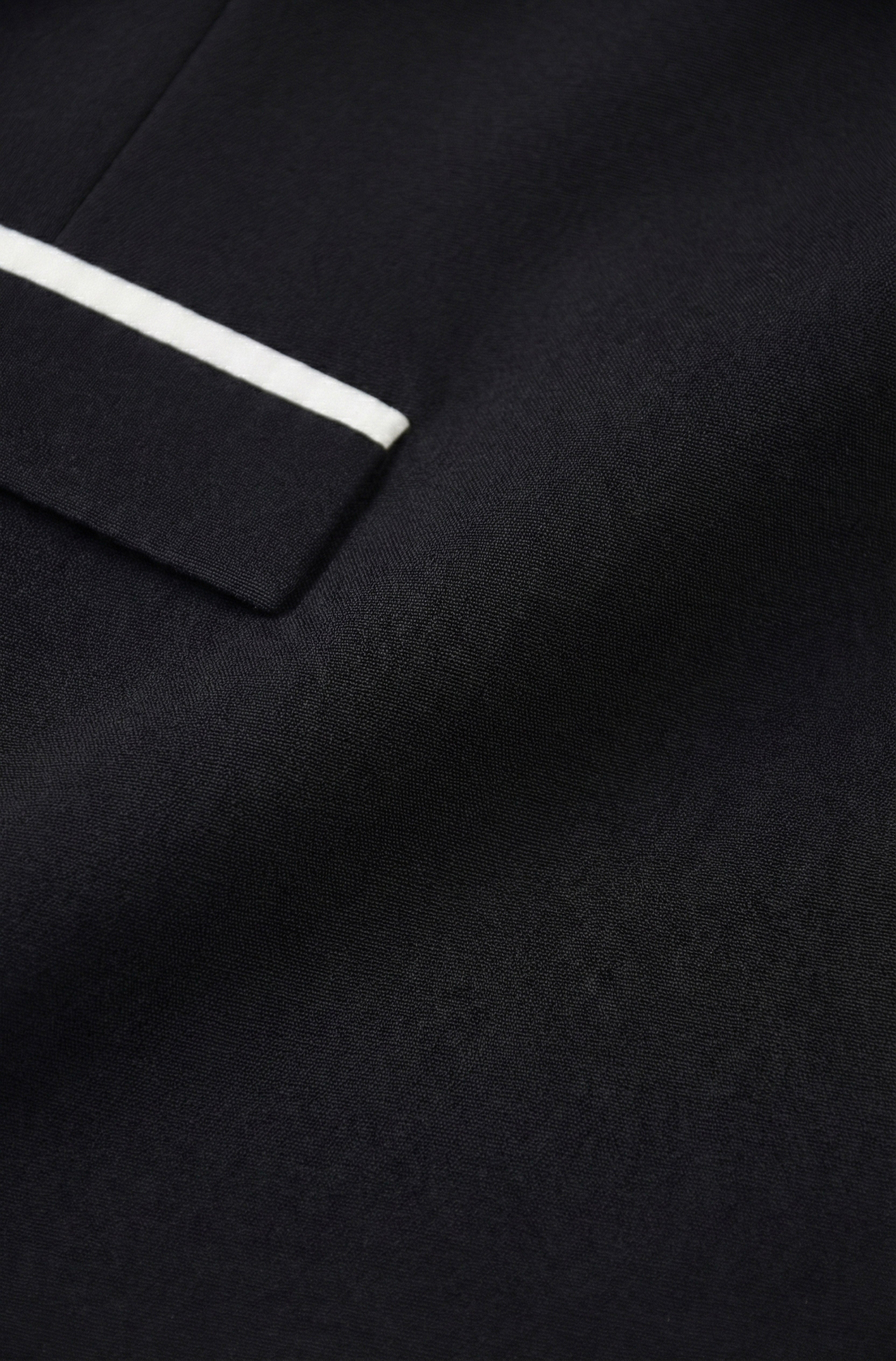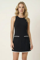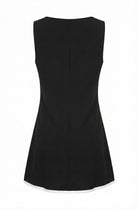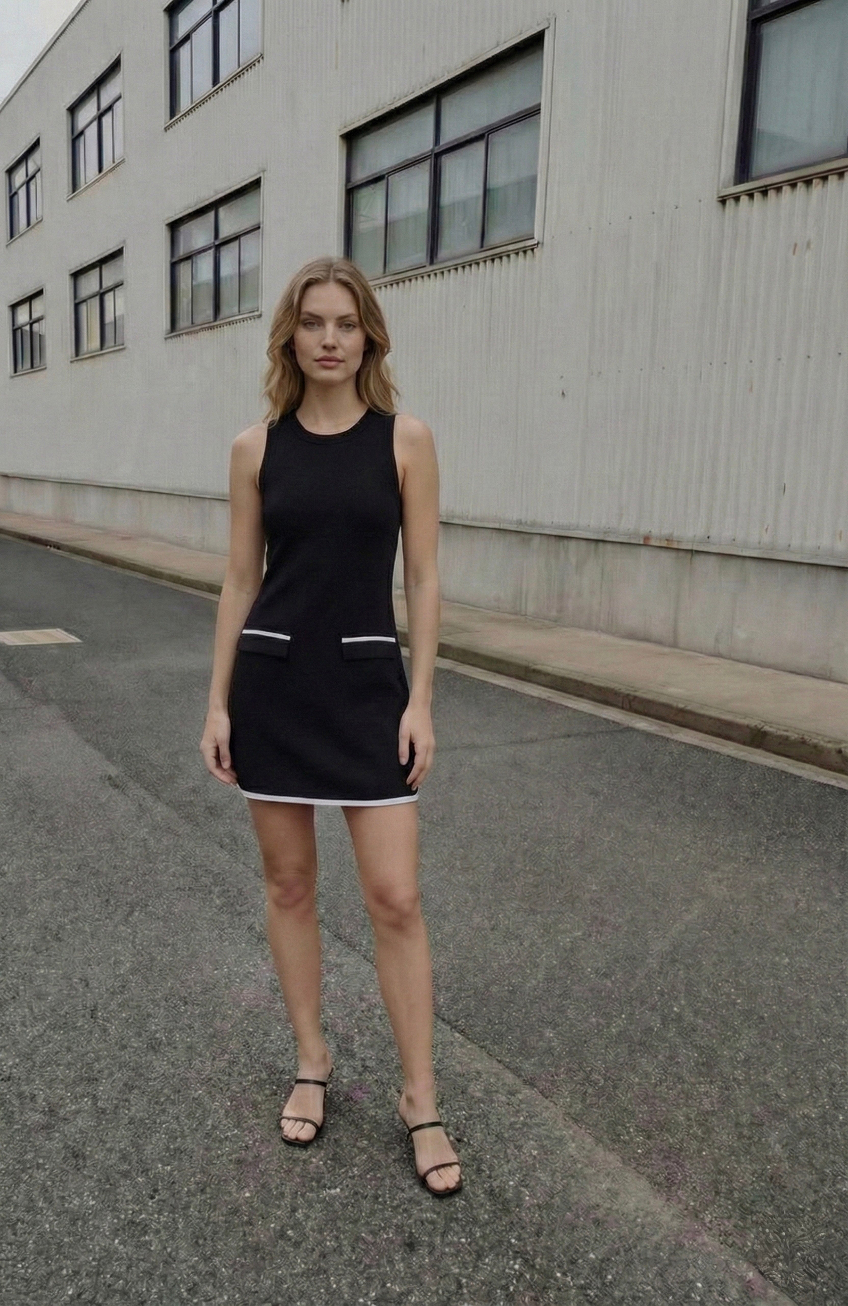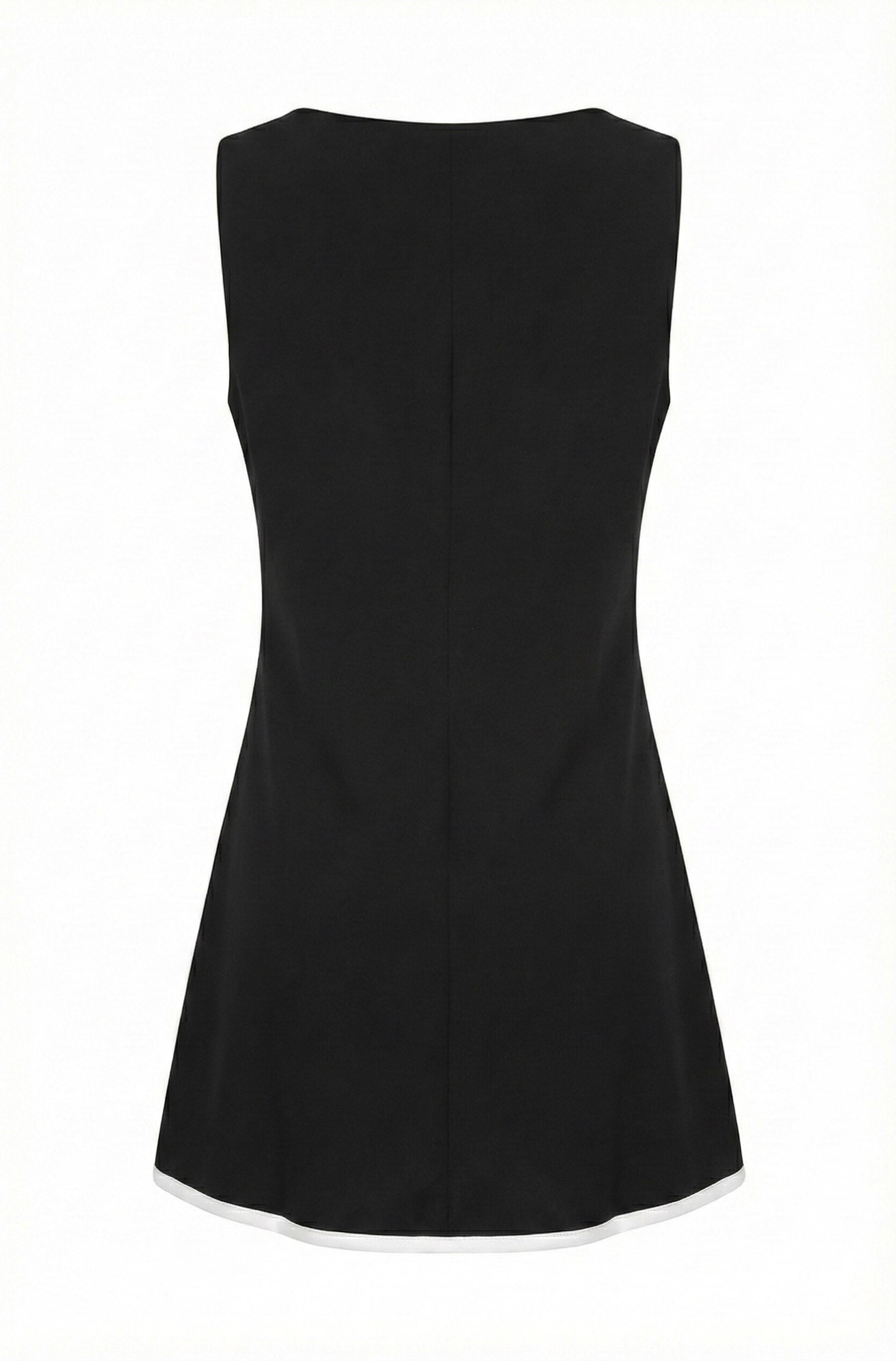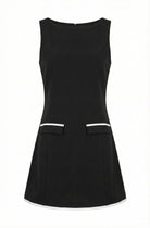 This tailored mini dress features a structured sleeveless silhouette with sleek contrast piping along the neckline, hem, and faux pocket flaps for a polished finish. The fitted bodice and subtle A-line skirt create a flattering shape, while the decorative flaps add a playful yet refined touch. Perfect for daytime events or elevated casual outings, this dress blends modern minimalism with timeless charm.