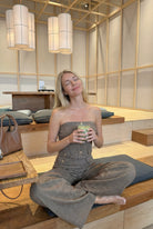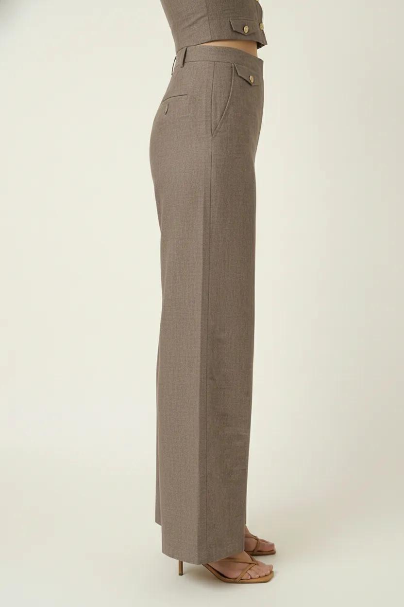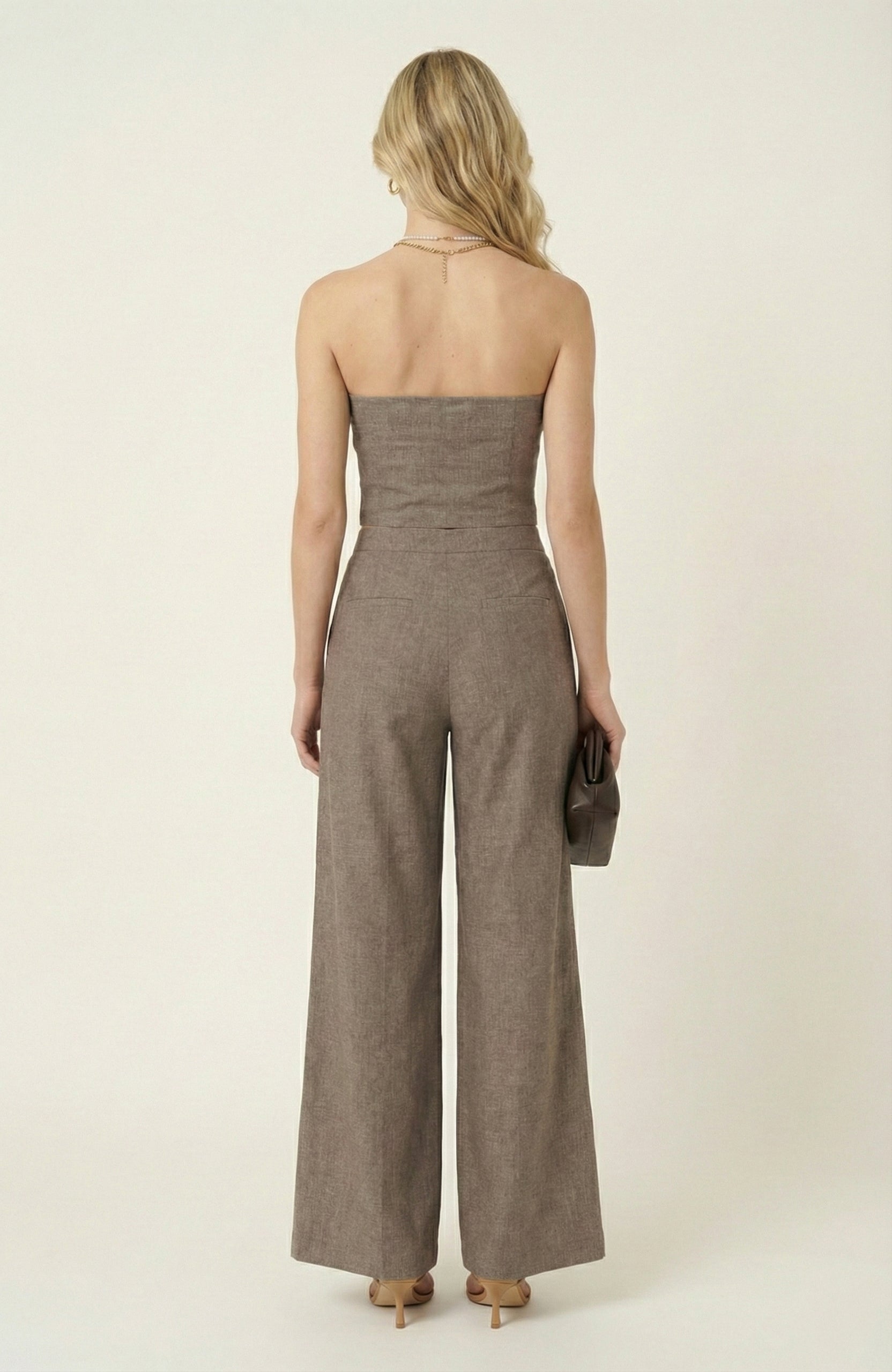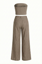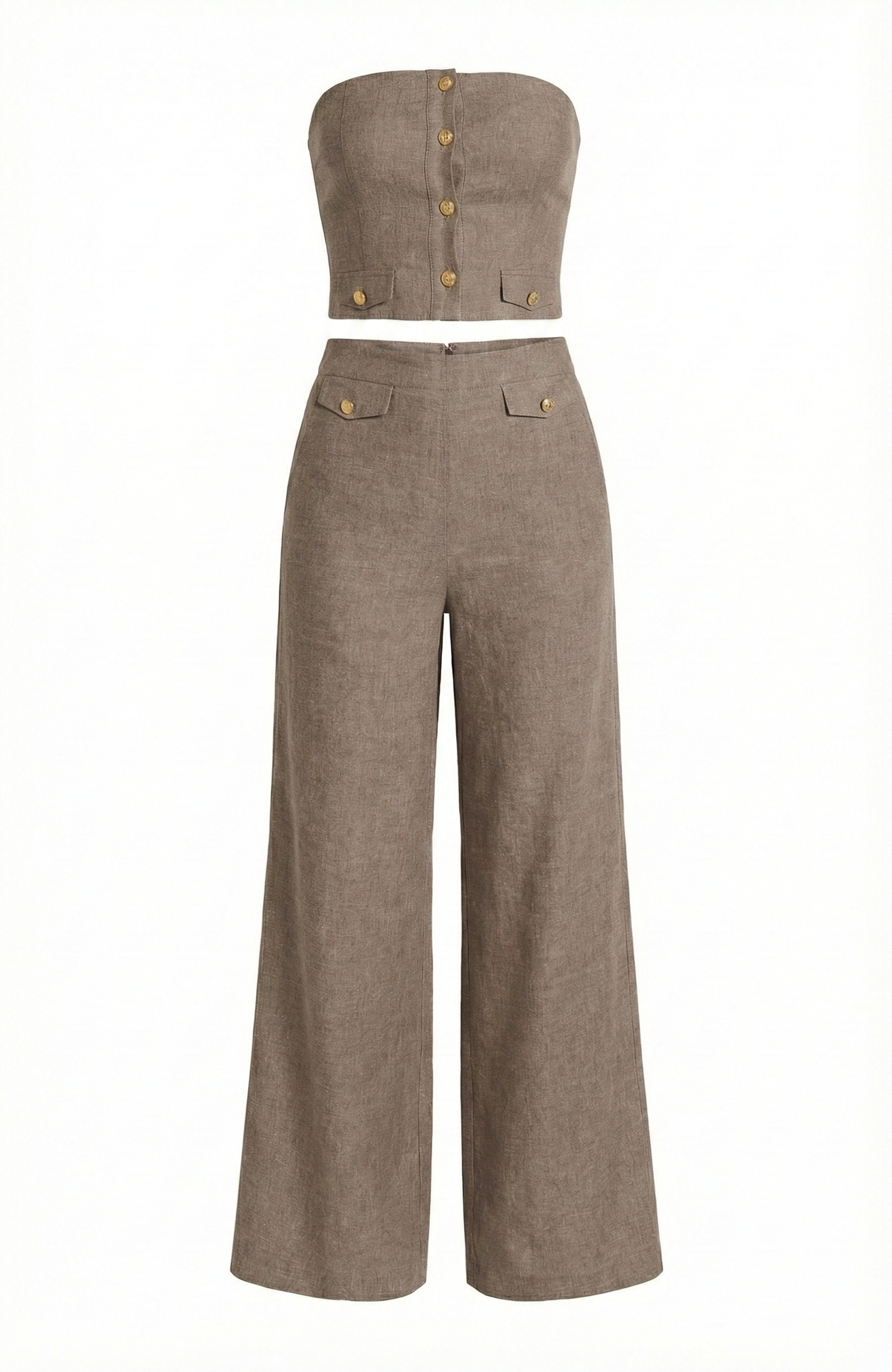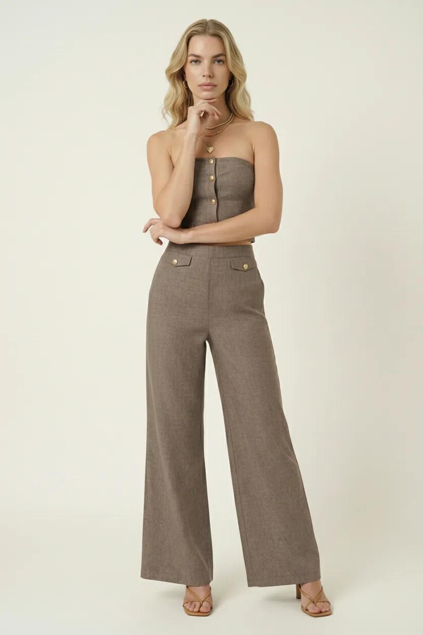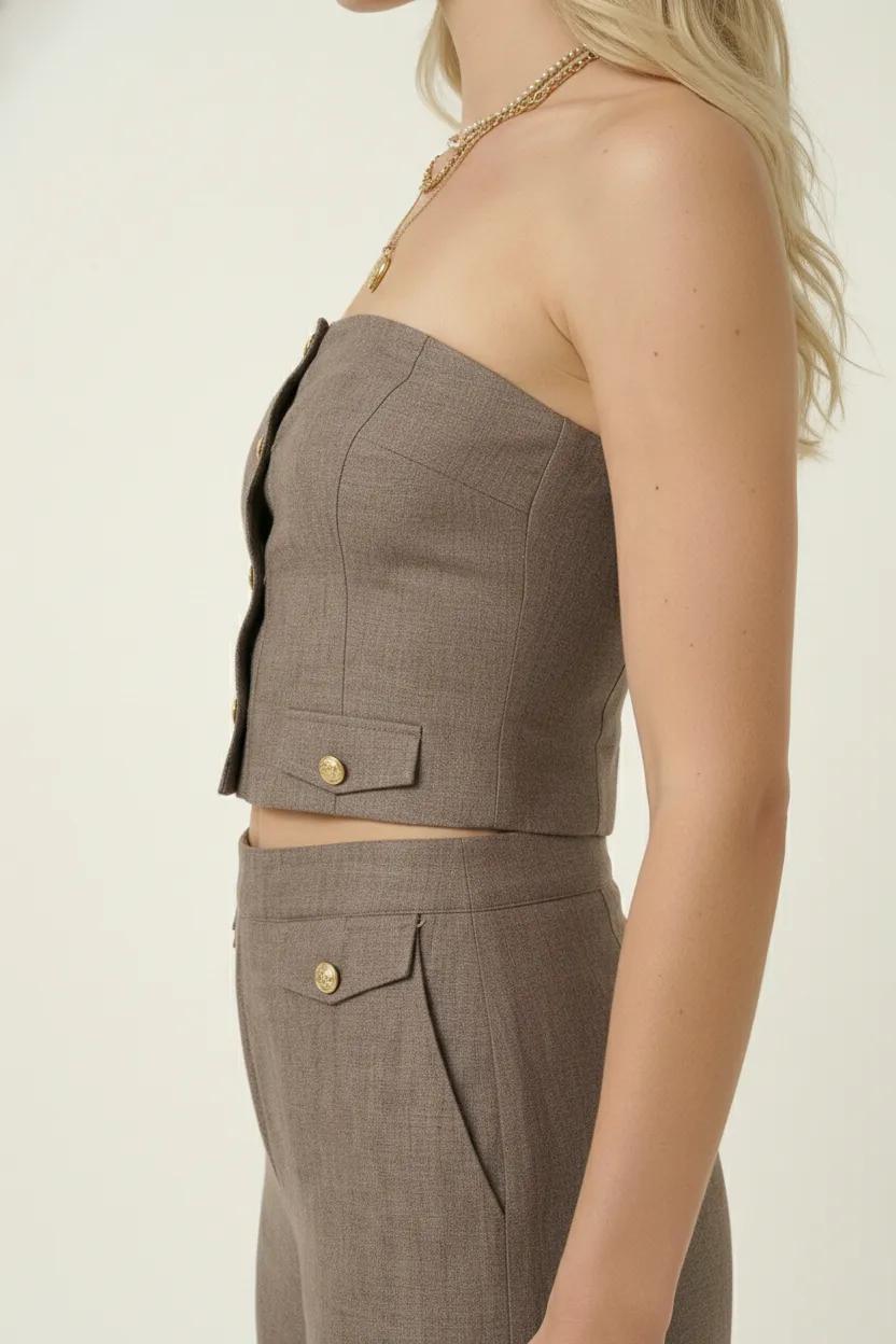 This strapless two-piece set offers a modern take on tailoring with a sleek, fitted crop top and coordinating wide-leg pants. The crop top features a button-front design with gold-tone detailing, adding a polished accent to its structured silhouette. Matching pants with a high waist and buttoned flap accents create a balanced, elongated look. Perfect for versatile styling, this set transitions seamlessly from day to night.