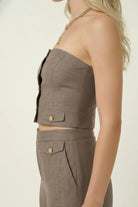 Strapless Button Front Crop Top and High Waist Wide Leg Pant Set with Tailored Silhouette and Gold Tone Button Details