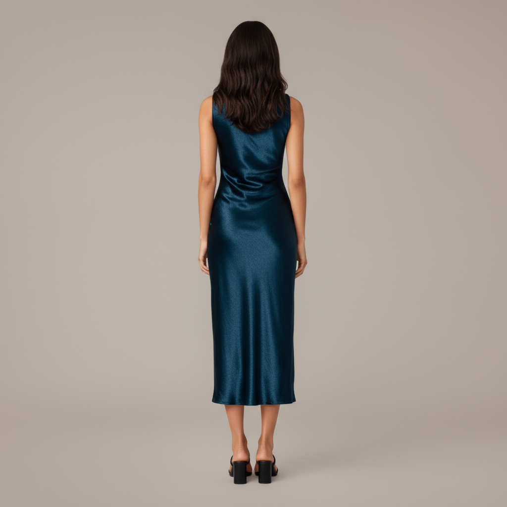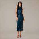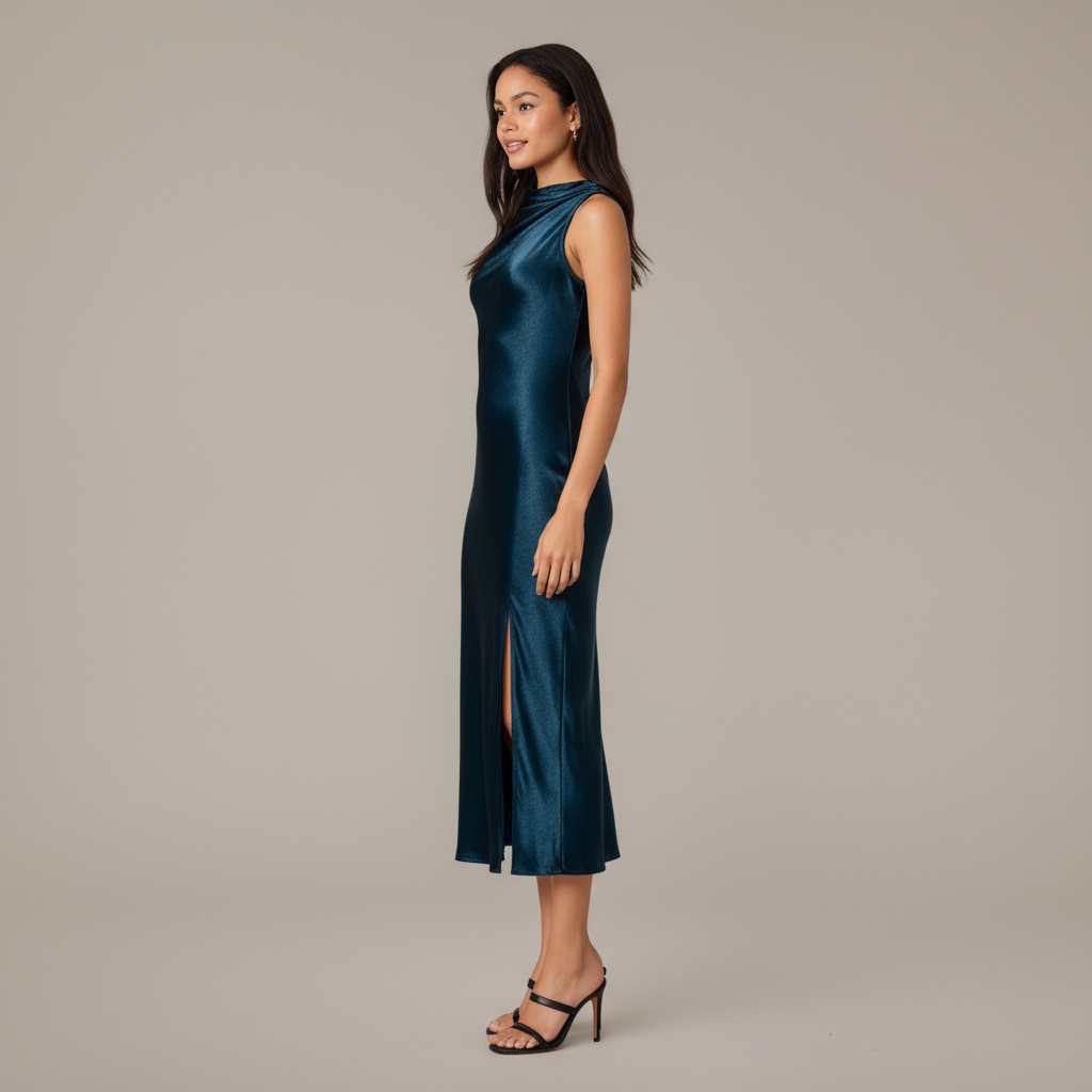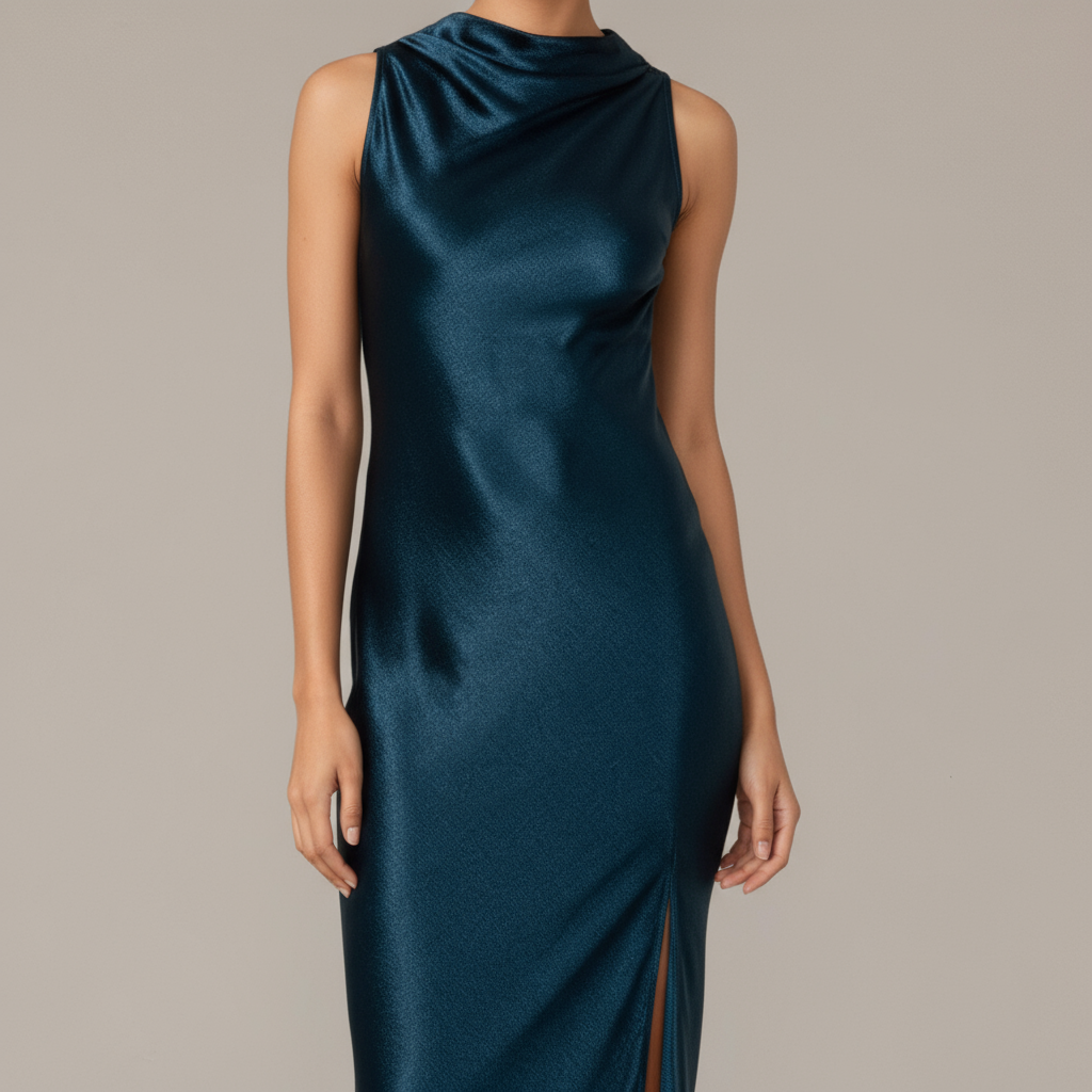 This sleek midi dress is crafted from lustrous satin that glides effortlessly over the body, creating a polished, sculpted silhouette. The soft draped neckline adds gentle volume and elegance, while a high side slit offers just the right amount of allure. Sleeveless styling balances the shine of the fabric, making it perfect for elevated evening occasions. An effortlessly refined piece designed to make a statement with minimal effort.