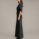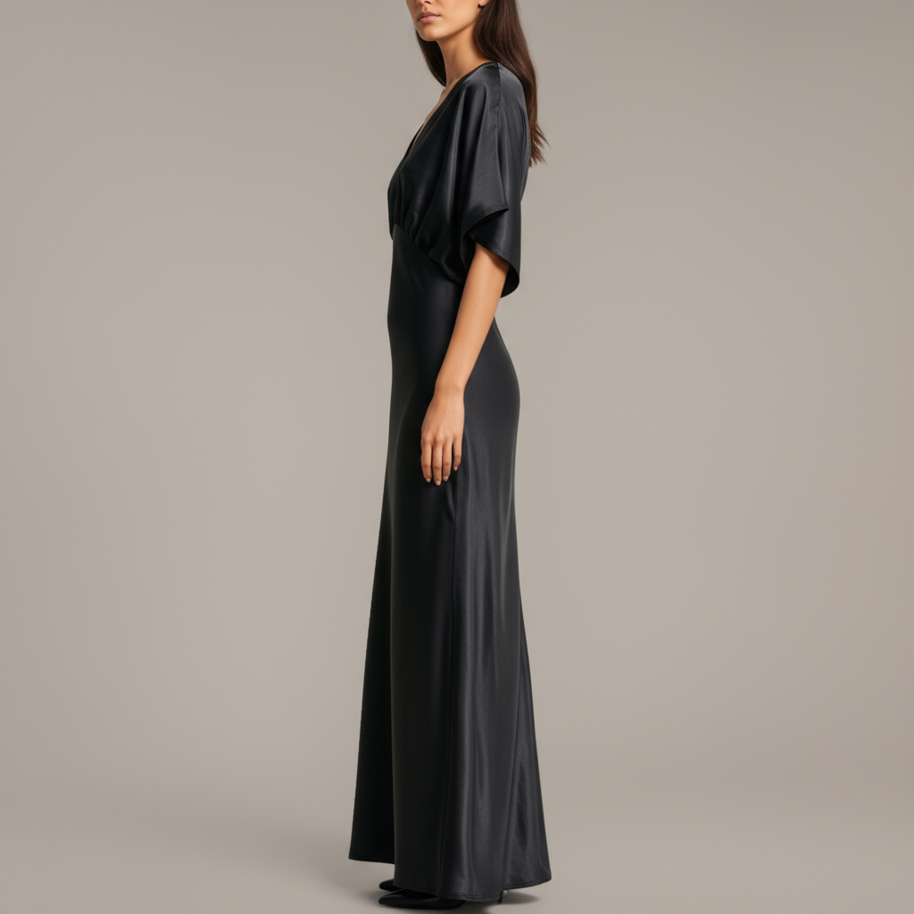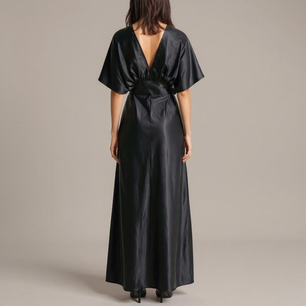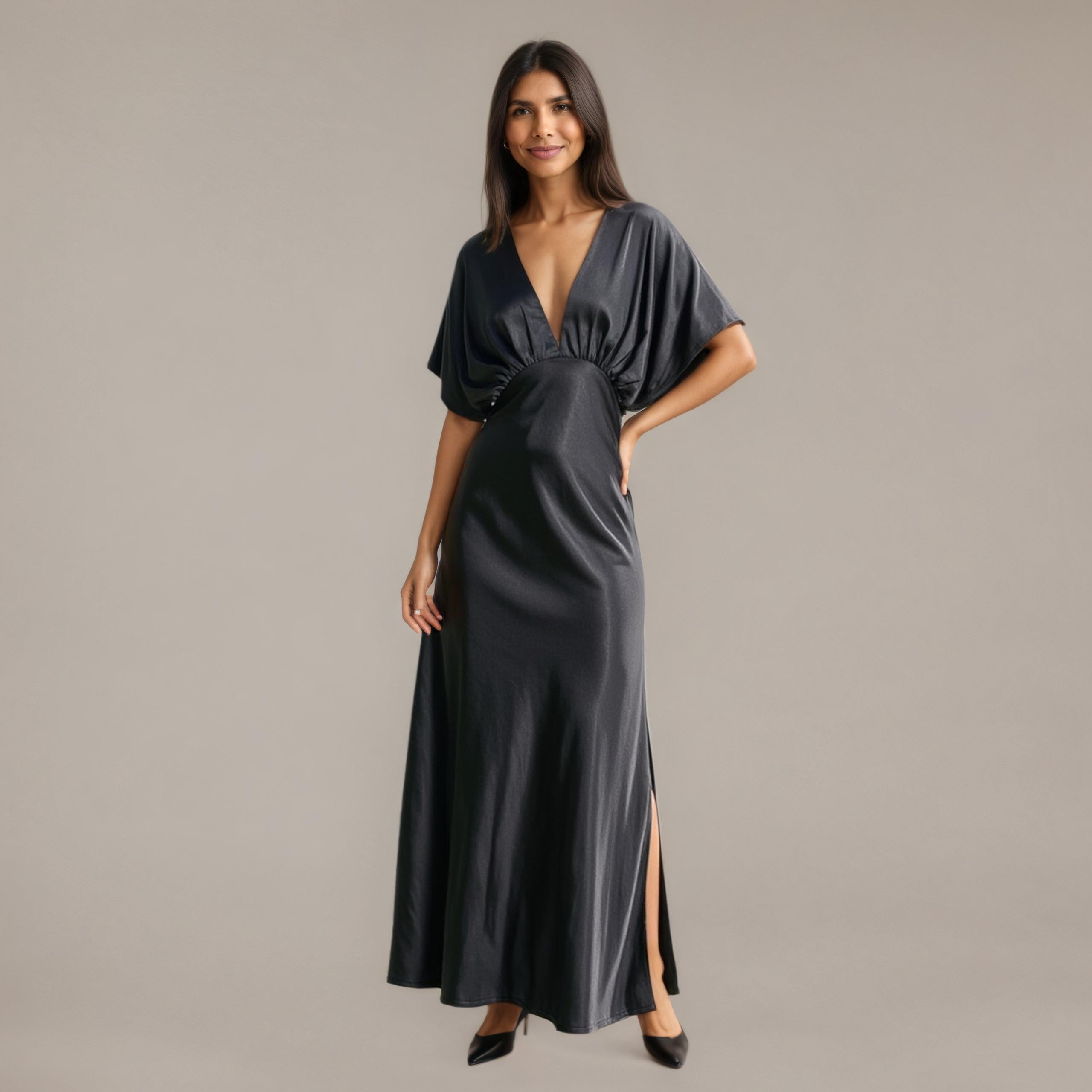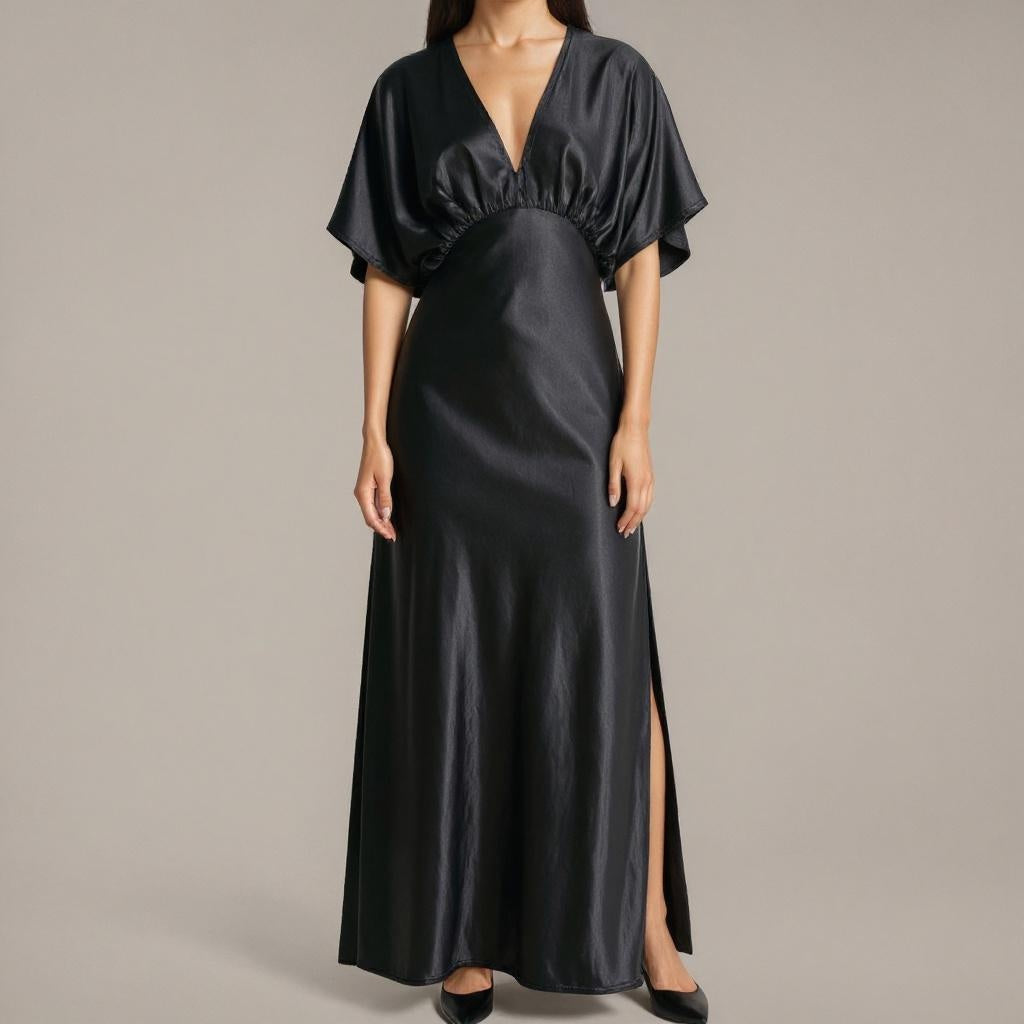 Designed for ease and elegance, this flowing maxi dress features a deep V-neckline and gathered empire waist that flatters the silhouette. The soft flutter sleeves add a breezy, feminine touch, while the long skirt falls gracefully to the floor with a subtle side slit. Made for movement and comfort, this piece pairs effortlessly with heels or flats. Ideal for both casual elegance and evening sophistication.