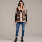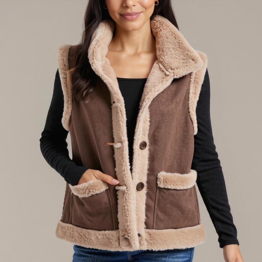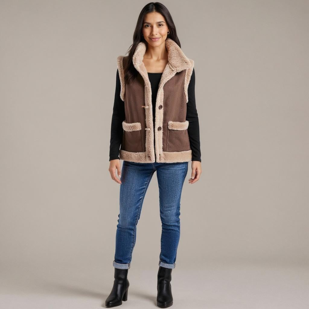 This faux shearling trim vest offers a cozy yet polished touch to your seasonal wardrobe. Designed with a stand collar, button-front closure, and soft faux shearling lining, it delivers both warmth and style. Patch pockets add functional charm, while the tailored fit makes it ideal for layering over sweaters or tees for an effortlessly chic look.
