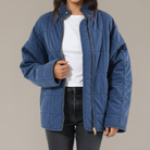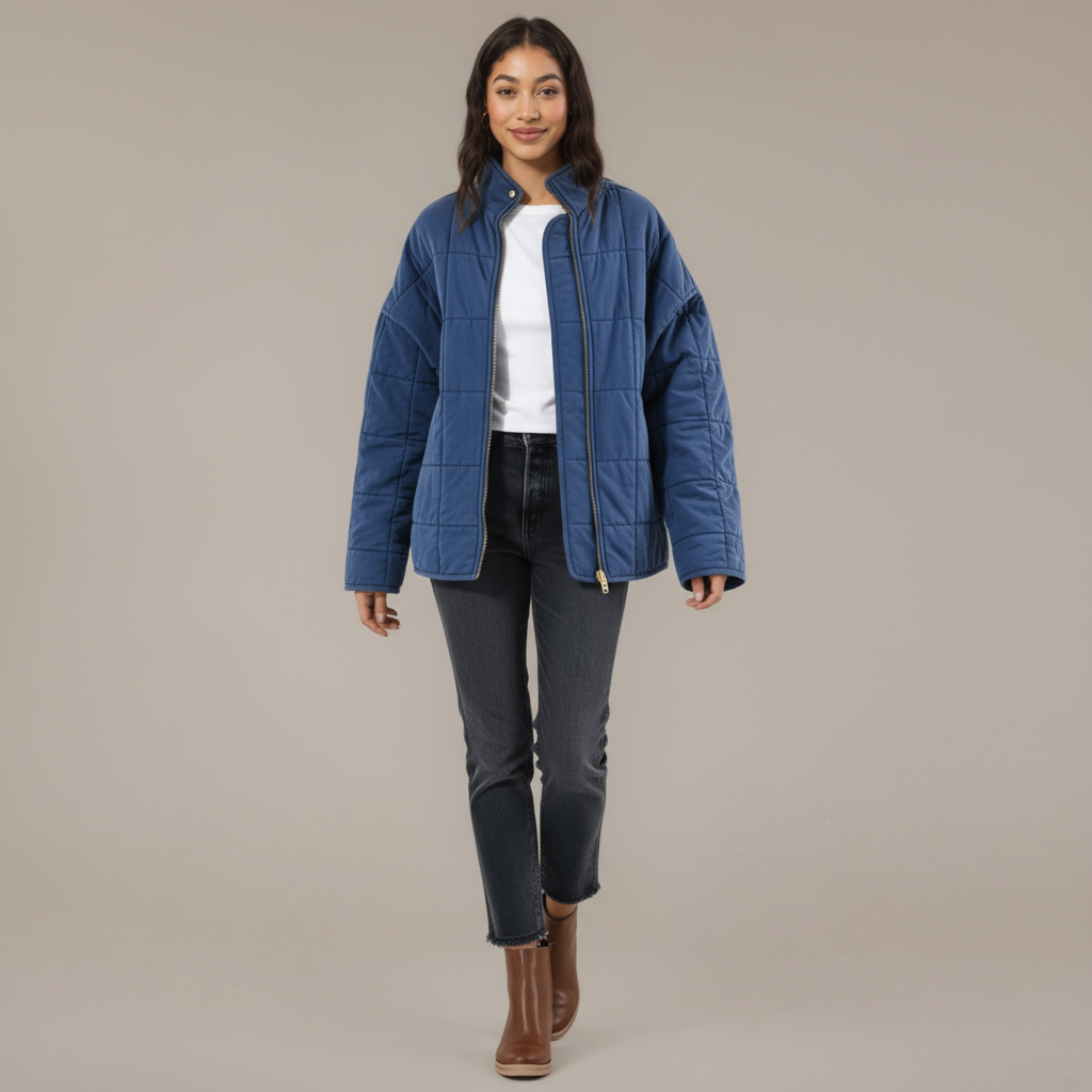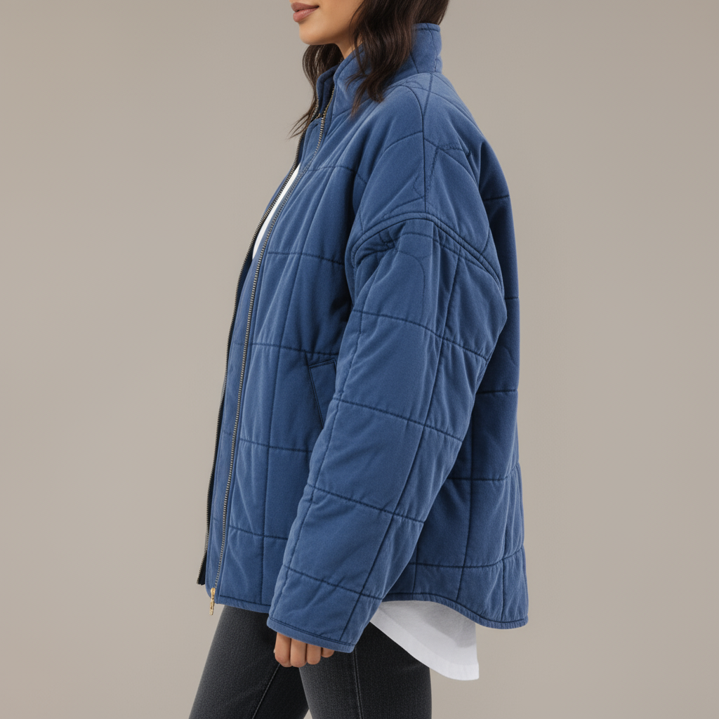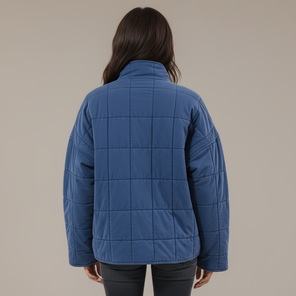 This cozy quilted jacket is crafted from ultra-soft fleece and finished with structured square stitching for a modern, utility-inspired look. Designed with a stand collar, full zip front, and drop shoulders, it offers both comfort and a clean silhouette. Side pockets add function while maintaining the streamlined shape. Ideal for layering on brisk days, this jacket blends practical warmth with elevated everyday style.