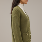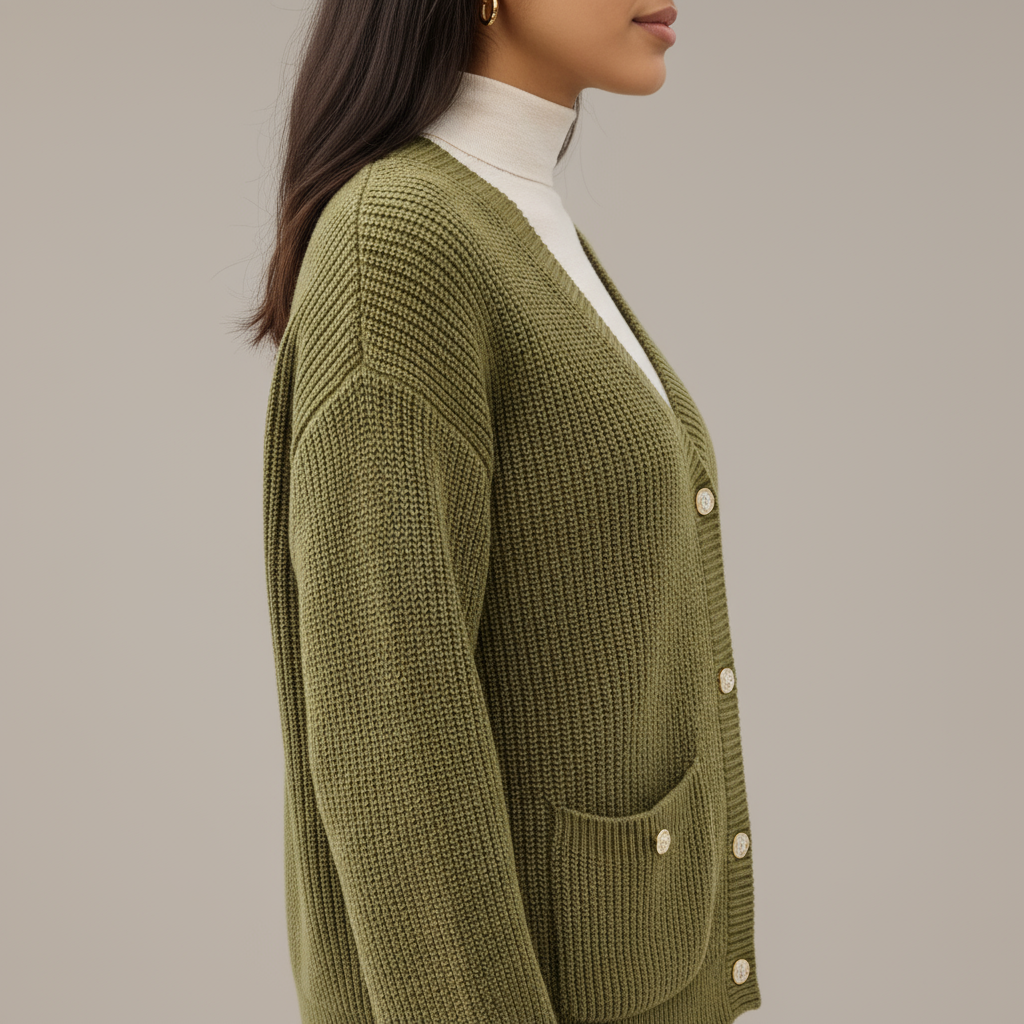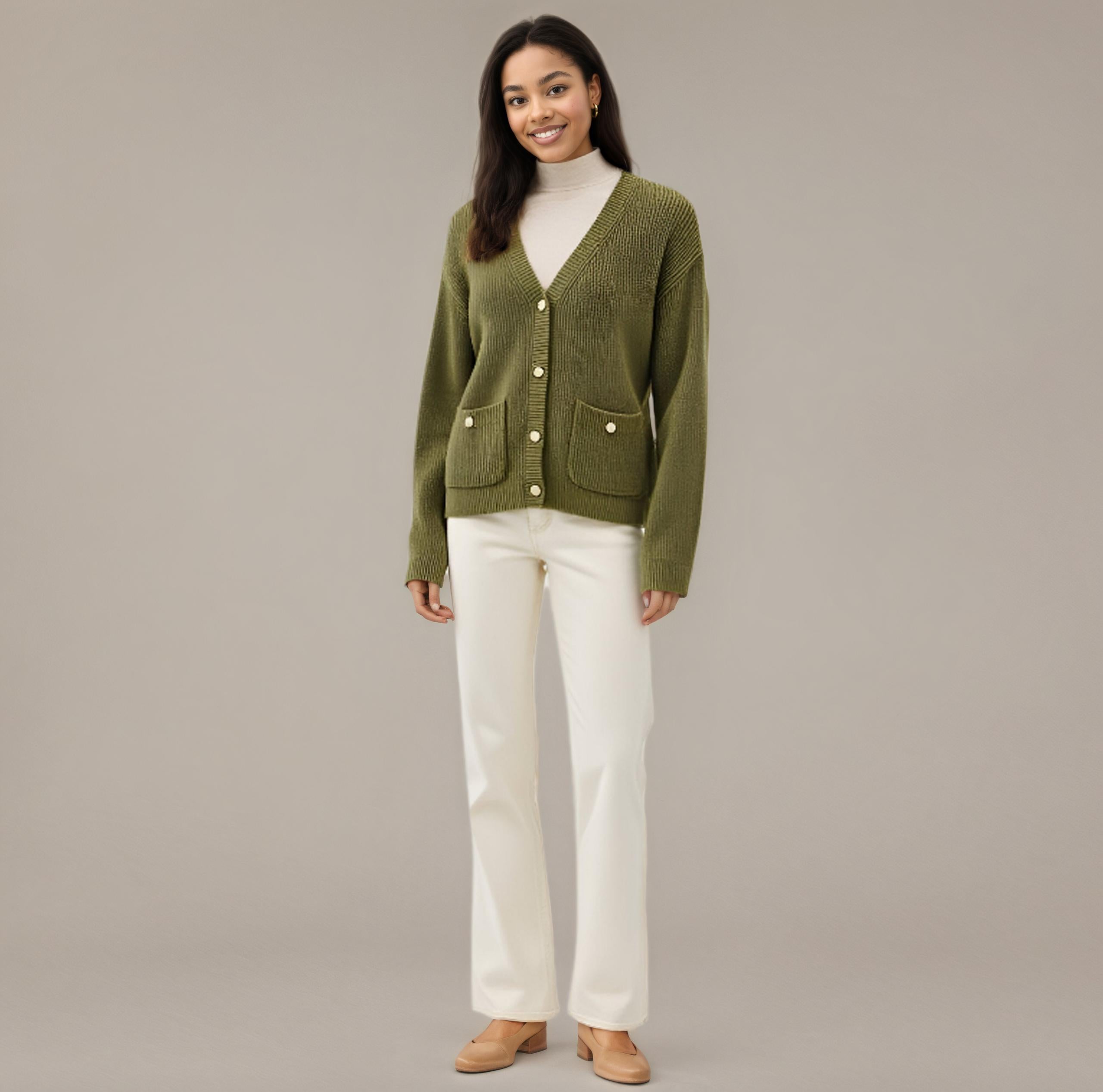 This ribbed knit cardigan is designed in a boxy fit with drop shoulders for a relaxed, modern feel. Featuring a flattering V-neckline, gold-tone button closure, and practical front pockets, it’s the perfect layering piece for cooler days. Crafted with a soft, cozy texture, this fall-to-winter essential offers effortless style and comfort for any casual or polished look.