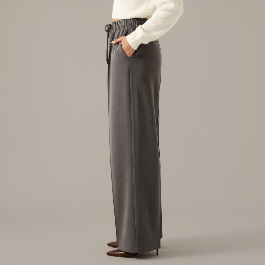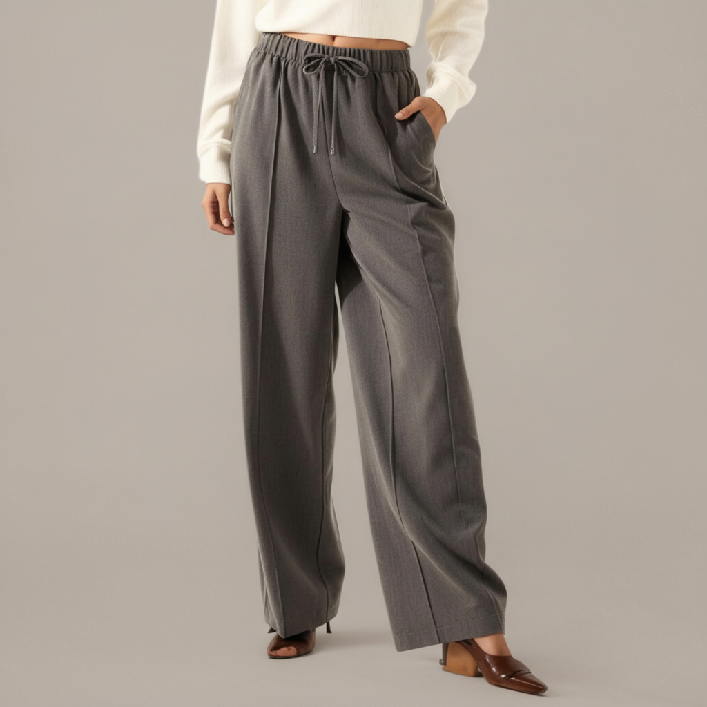 These wide leg trousers are designed in a soft, fluid fabric with subtle stretch for all-day ease and elegance. The high-rise elastic waistband is detailed with a functional drawstring and belt loops for customizable styling. Front center seams add polished structure, while the wide leg cut enhances movement and comfort. Perfect for pairing with fitted knits, tucked blouses, or relaxed tees, these trousers balance laid-back ease with refined appeal.