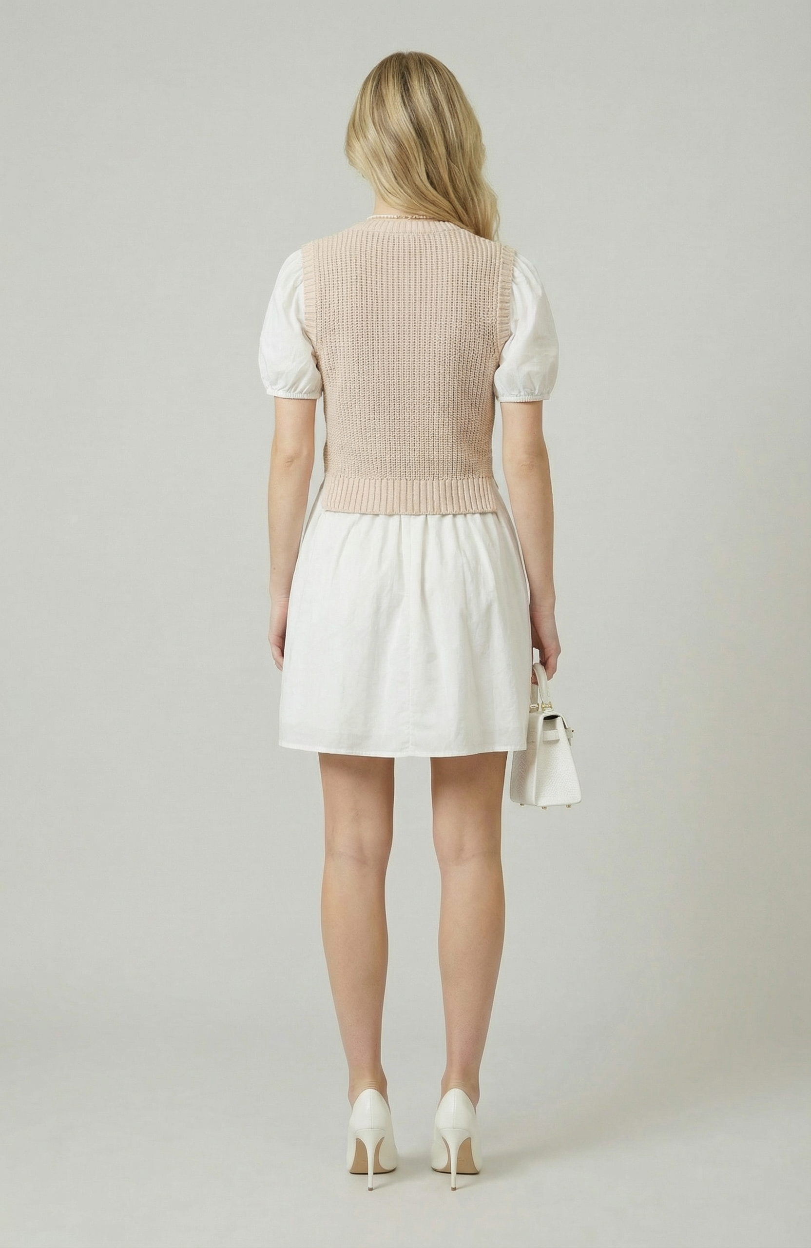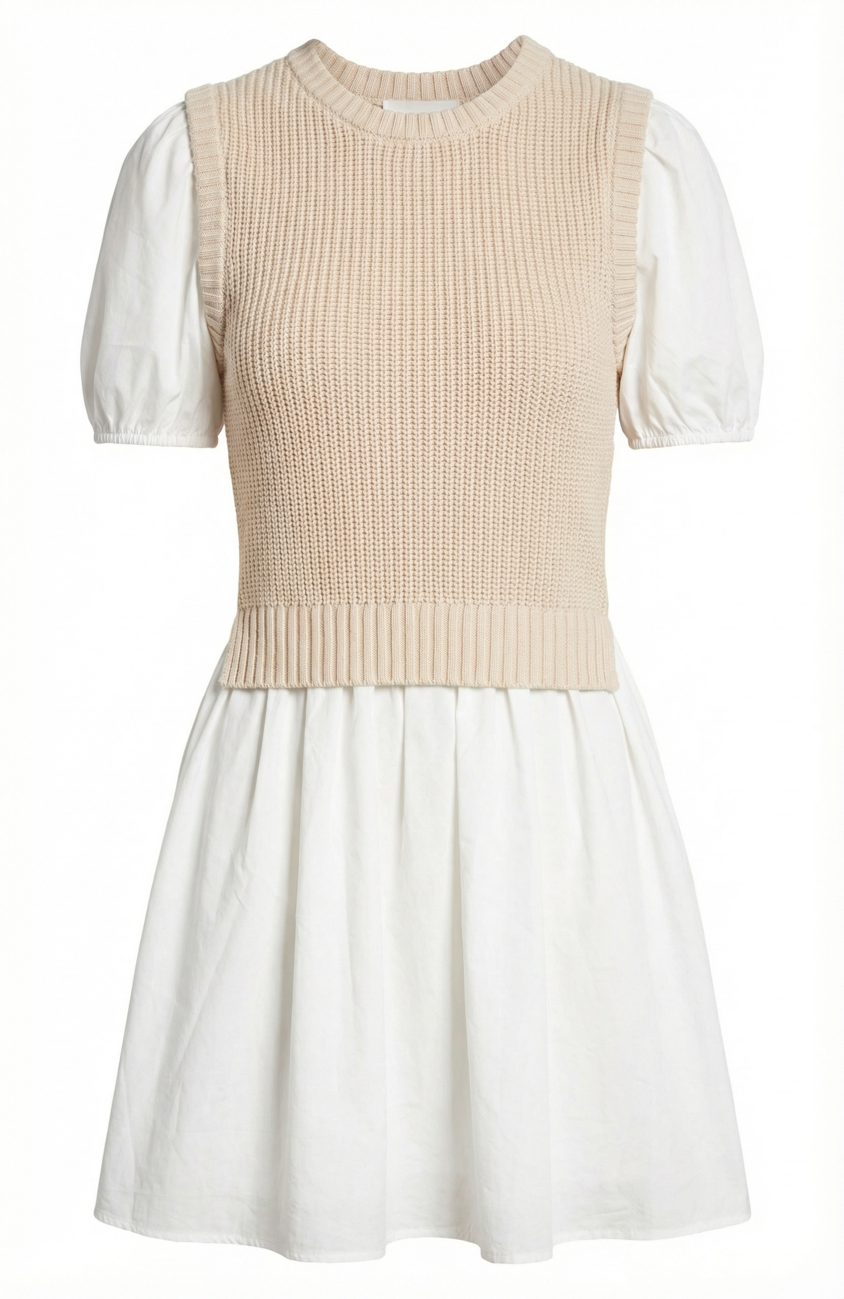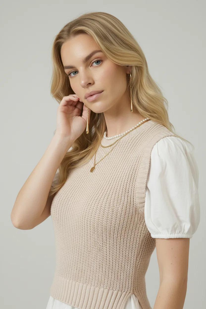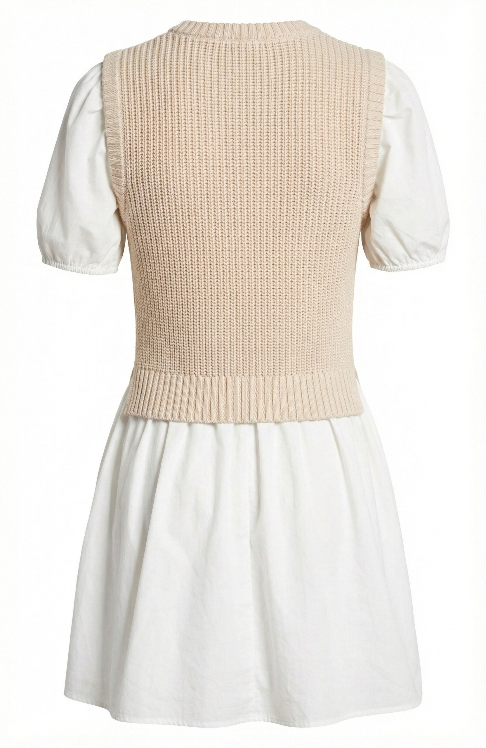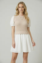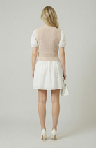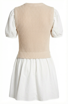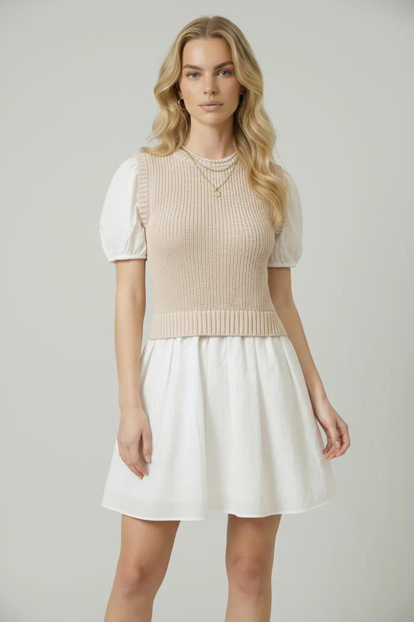 This two-in-one design blends a cozy knitted sleeveless sweater top with crisp cotton puff sleeves for a playful yet polished look. The flared mini skirt adds feminine movement, creating a flattering and youthful silhouette. Crafted from 100% cotton, it offers breathable comfort with a soft hand feel. Perfect for transitional dressing, this style pairs effortlessly with boots or flats for a versatile day-to-night look.