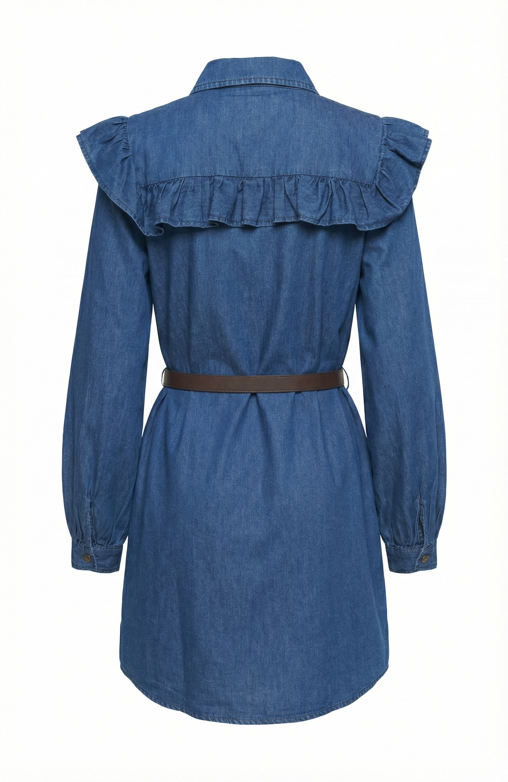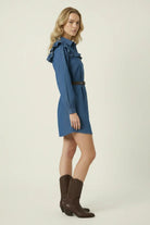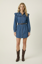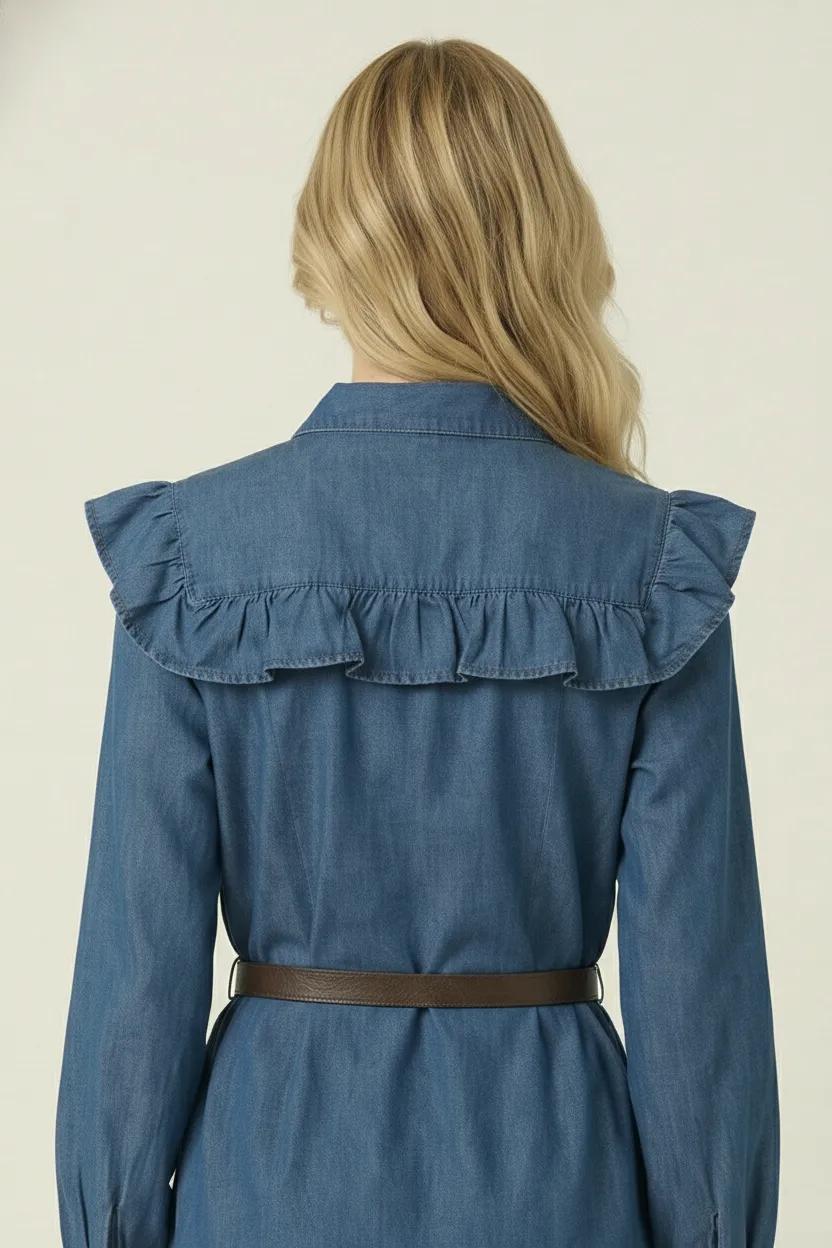 This denim shirt dress combines soft structure with feminine charm, featuring a wide ruffle yoke that extends over the shoulders. Designed with a full button-down front, collared neckline, and voluminous long sleeves with gathered cuffs, it creates a balanced silhouette. The removable belt cinches the waist for a flattering shape, while the washed denim offers an effortlessly cool finish. Style it with boots or flats for a polished yet relaxed look that transitions with the seasons.
