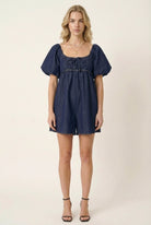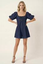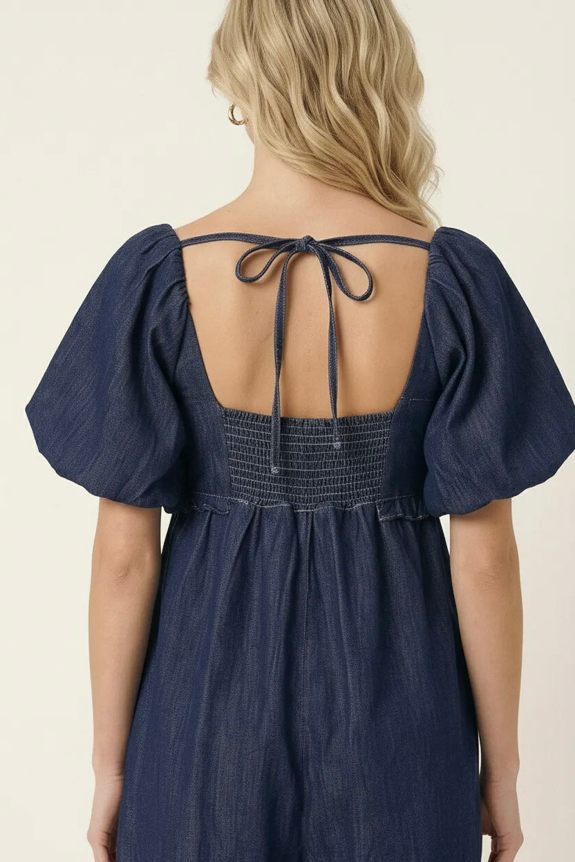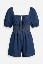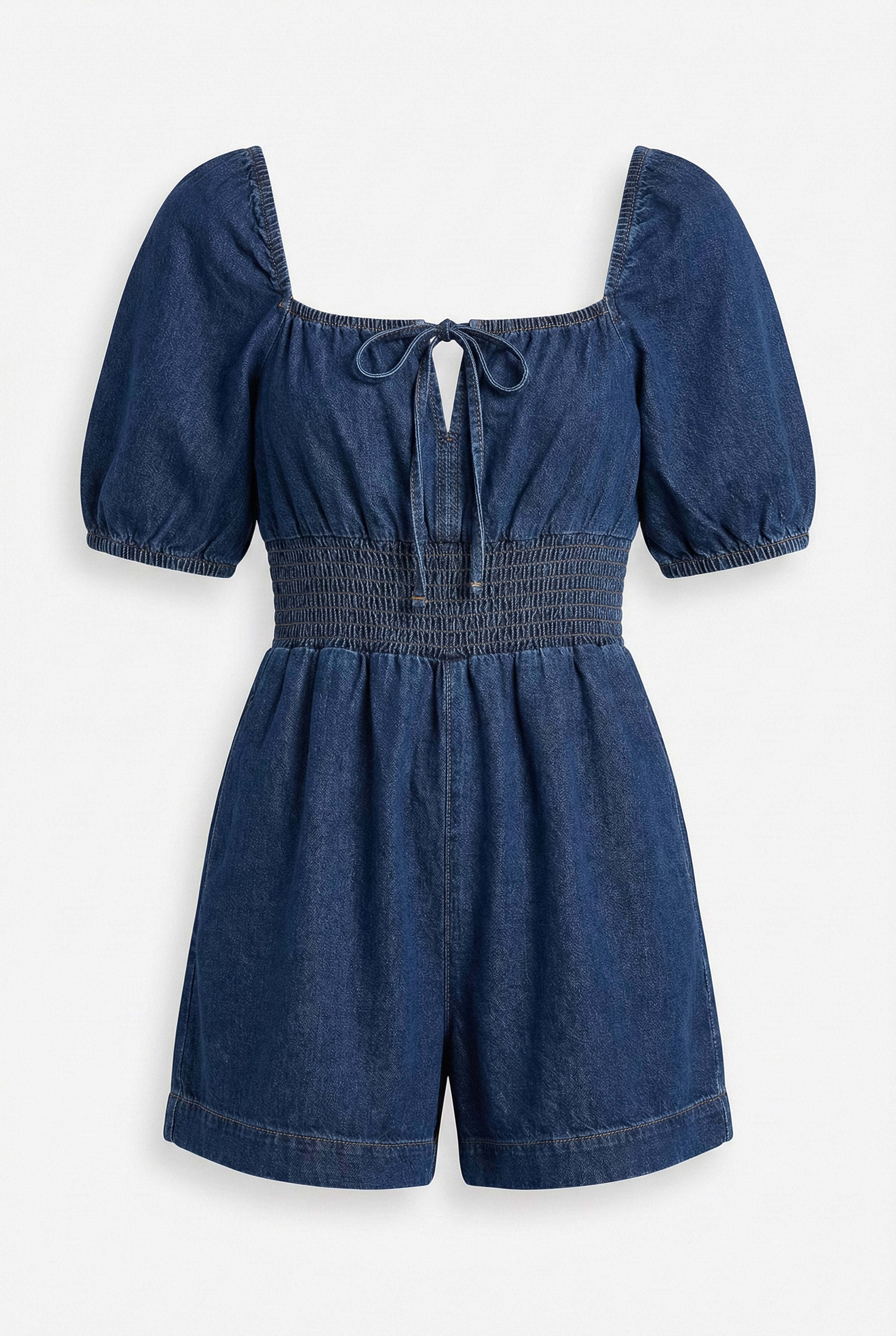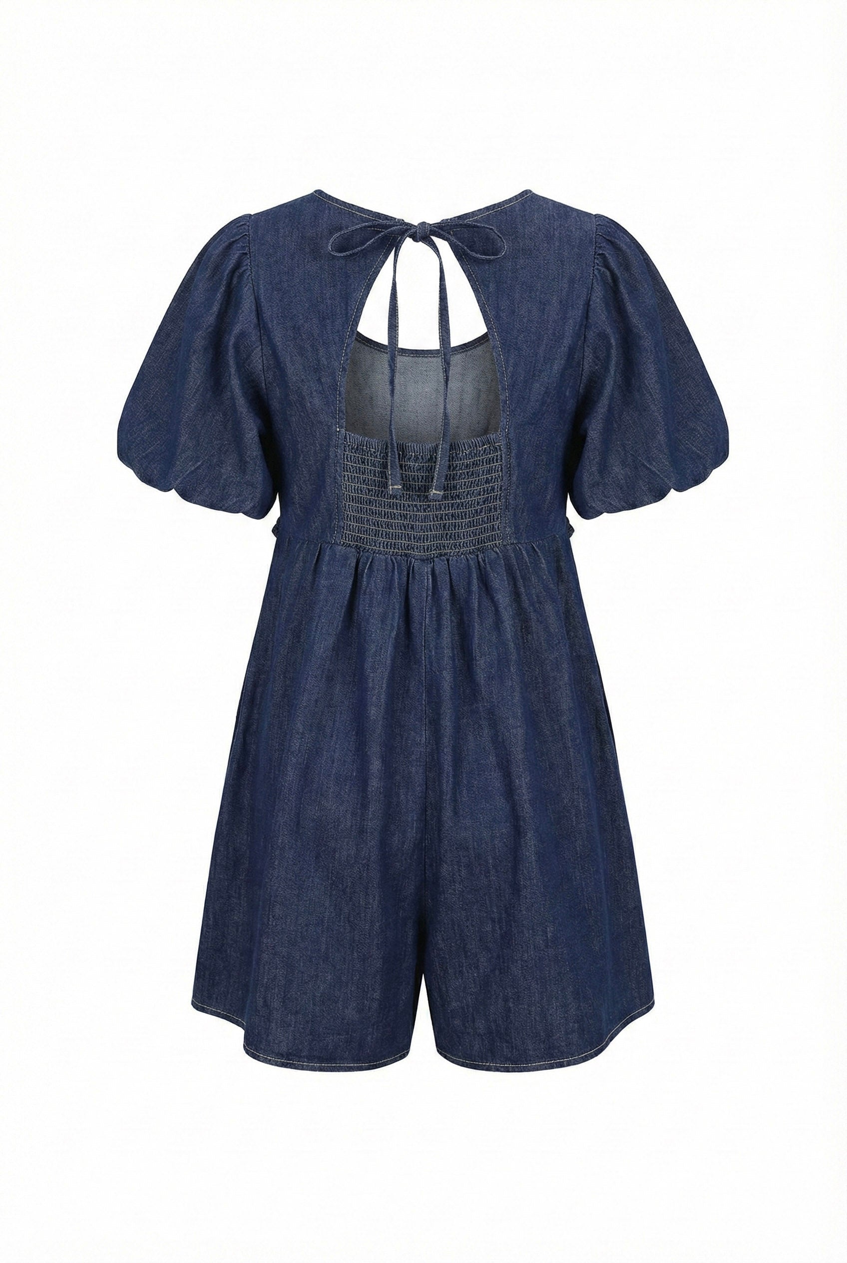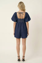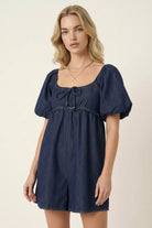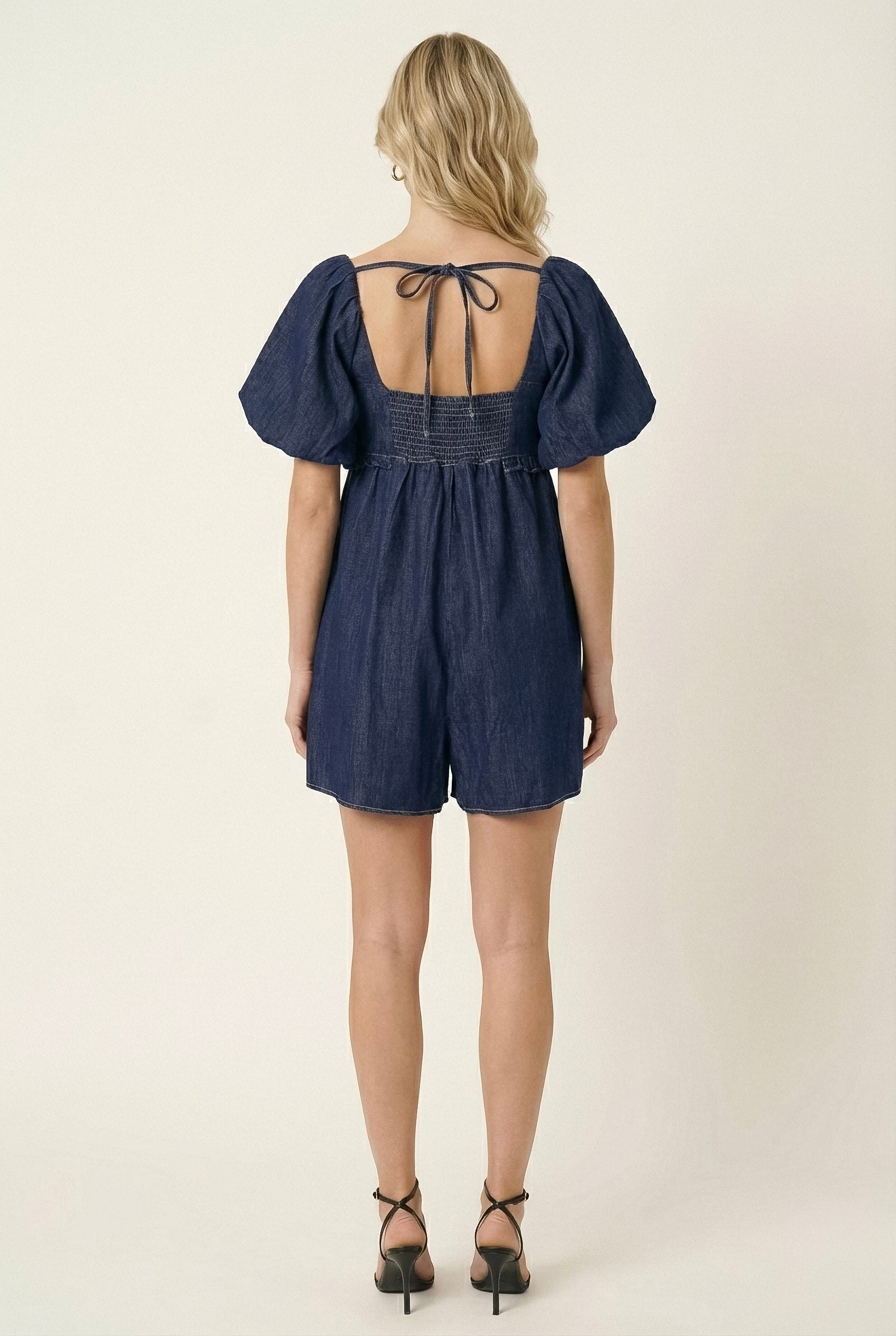 This light blue romper is effortlessly playful with its puff sleeves, empire waistline, and tie-front neckline that adds a delicate touch. The relaxed silhouette and soft, lightweight fabric make it perfect for sunny days, while the flowy shorts and functional side pockets add comfort and practicality. A dreamy one-piece for warm-weather styling that pairs perfectly with sandals or sneakers.