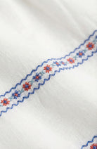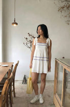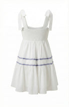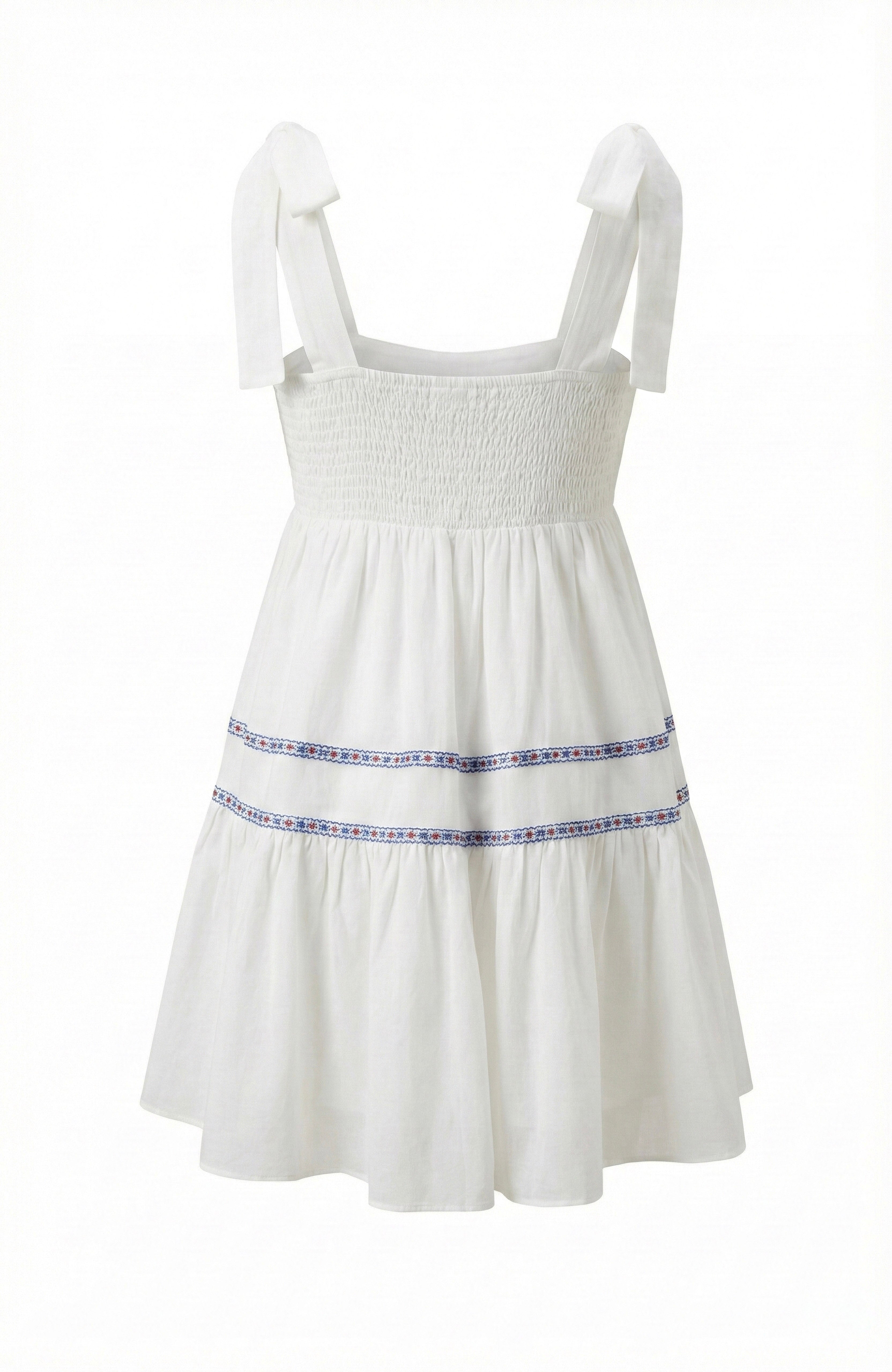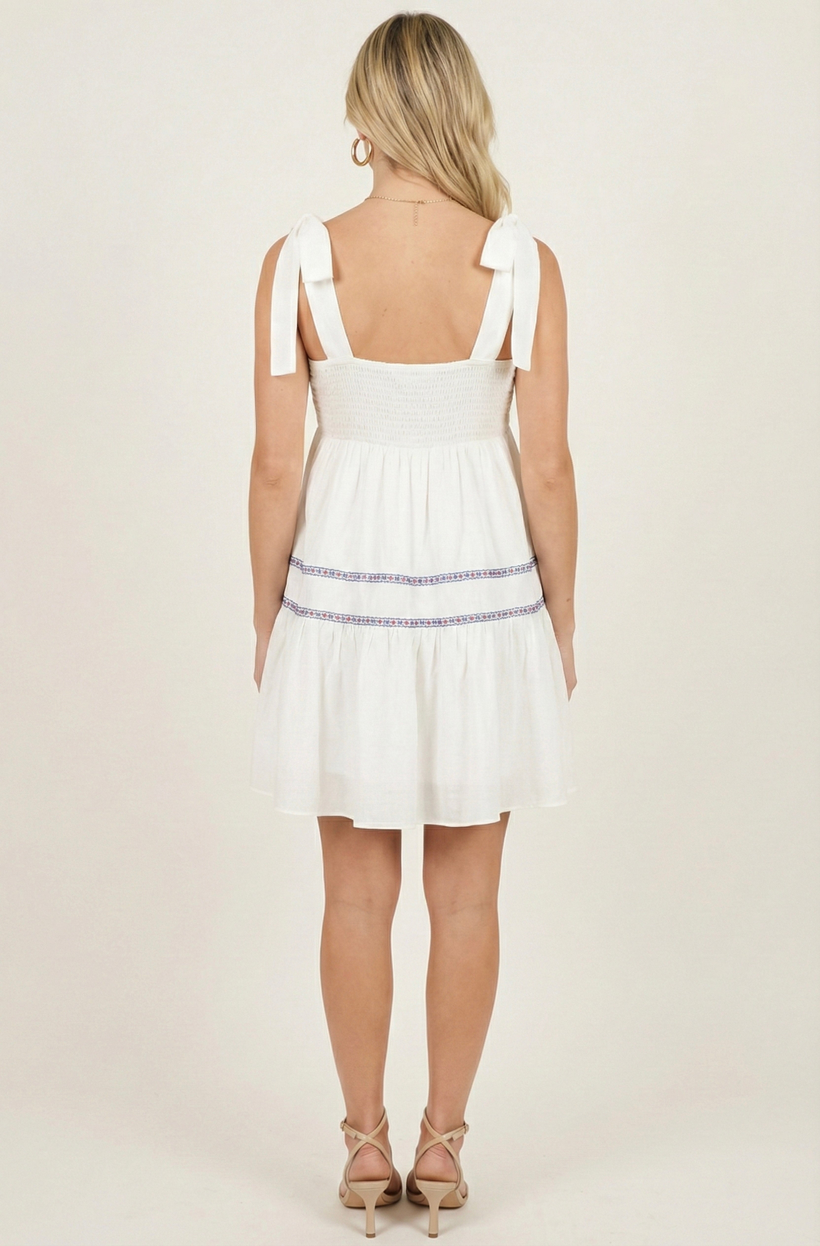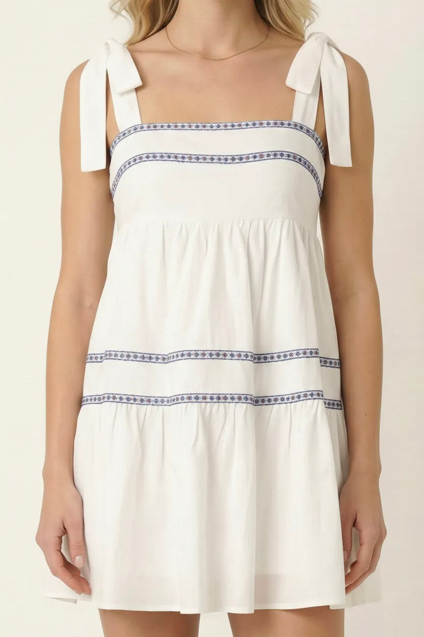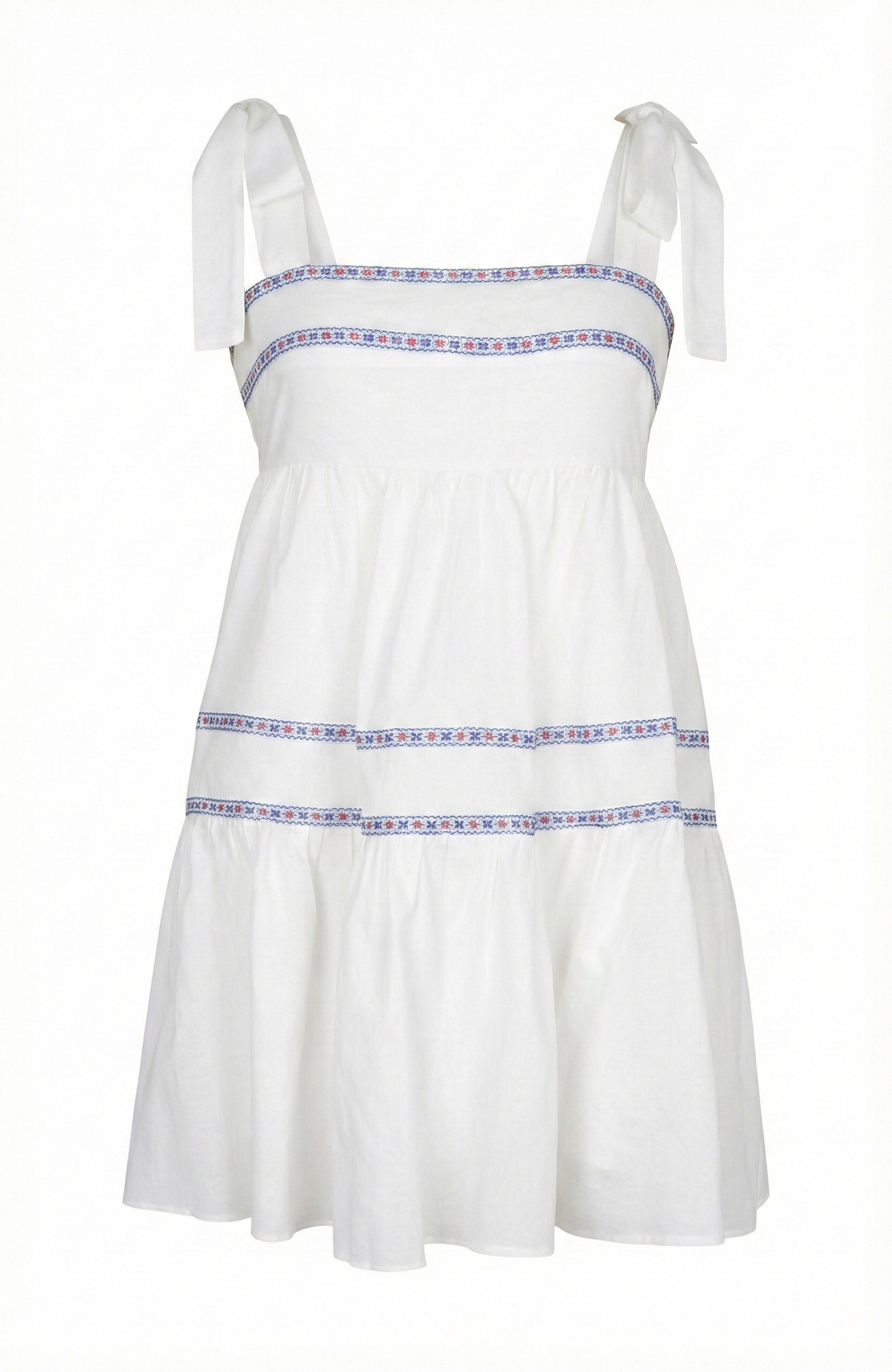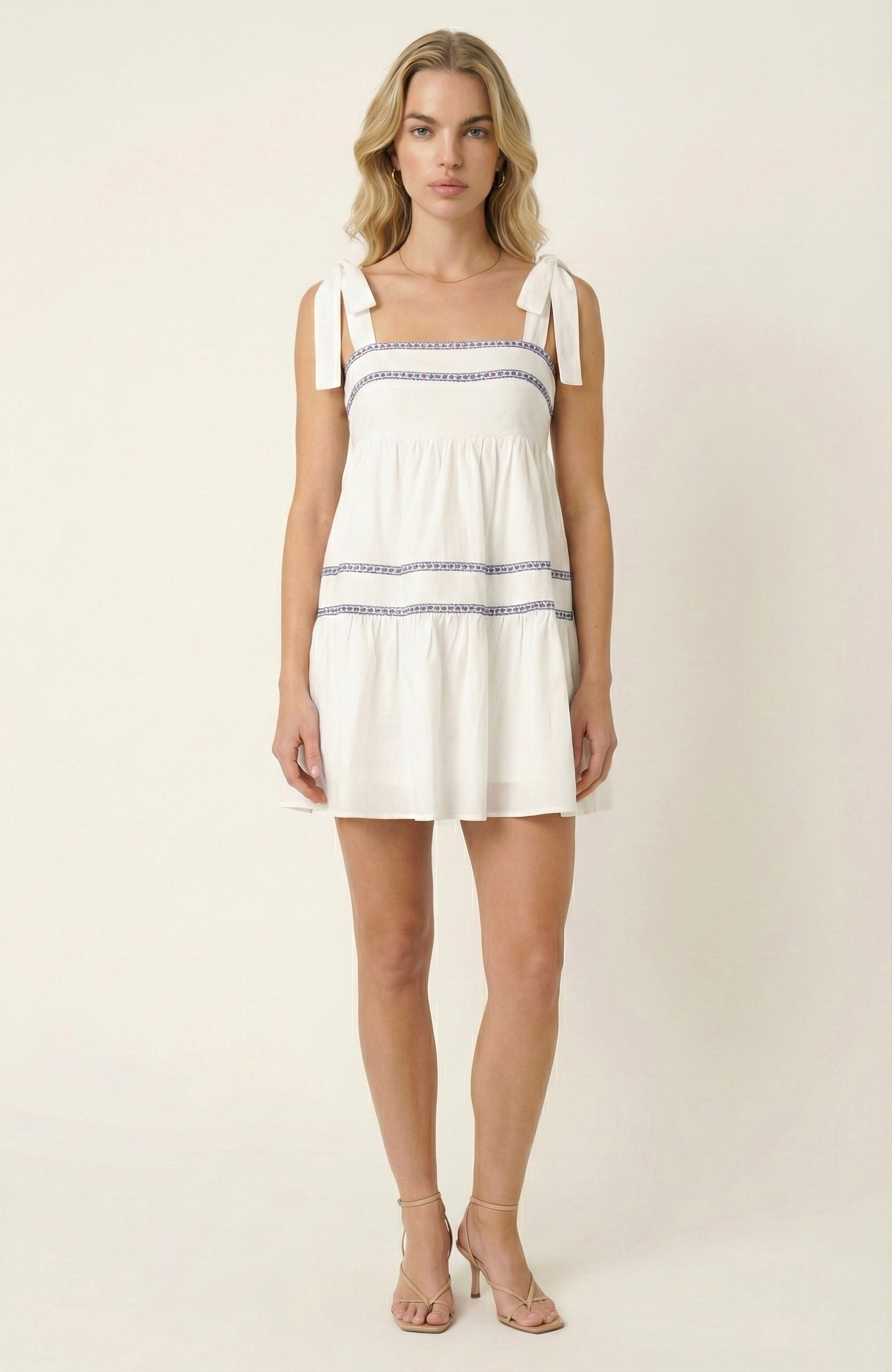 This effortlessly chic mini dress features delicate embroidered trim along the tiered silhouette for a subtle yet eye-catching detail. Adjustable tie straps allow for a customizable fit, while the relaxed shape ensures all-day comfort. Crafted from a lightweight fabric, this dress is perfect for warm-weather occasions, from casual brunches to beachside getaways. Pair with sandals or wedges for a breezy, feminine look.