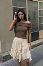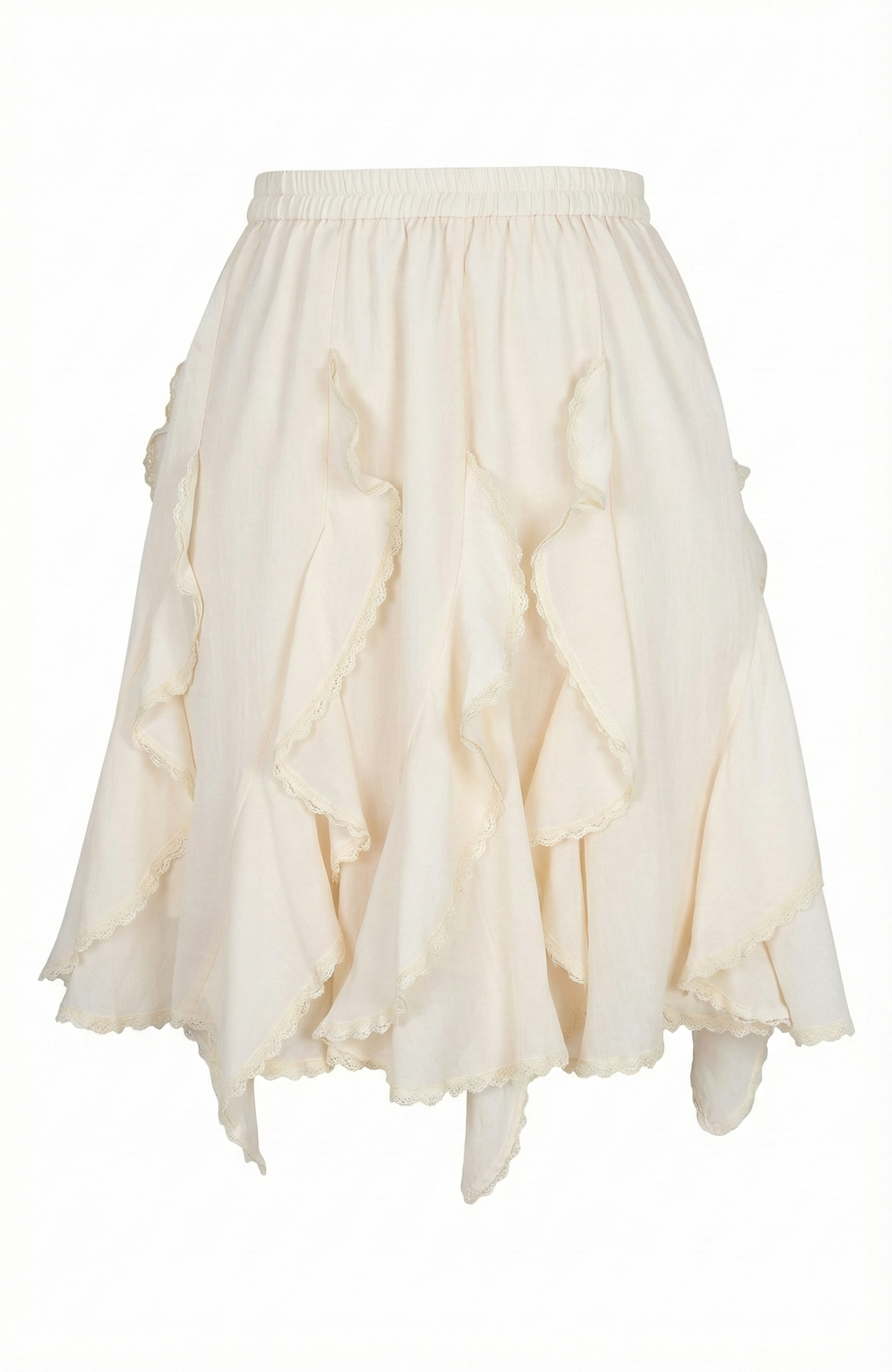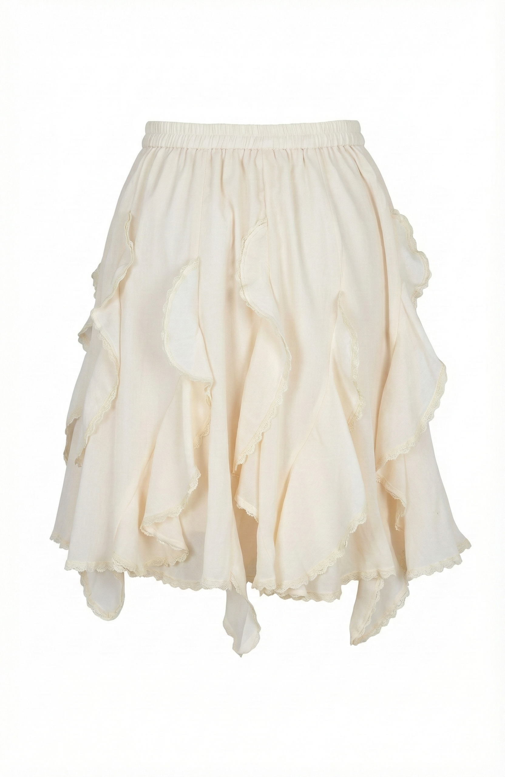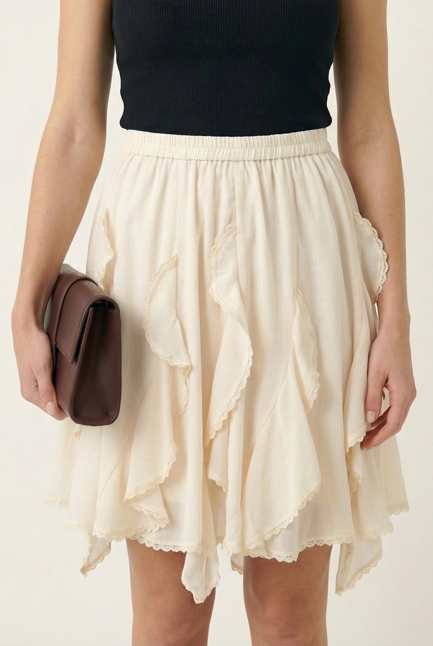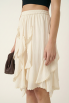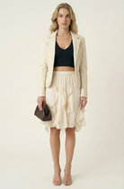 This tiered mini skirt features a lightweight, airy silhouette with cascading ruffle layers that create soft movement and dimension. Designed with an elastic waistband, it offers an easy, pull-on fit that sits comfortably at the waist. The subtly textured fabric enhances the romantic feel while keeping the look relaxed and modern. Style it with a fitted tank or knit top for a balanced silhouette that feels effortless yet elevated.