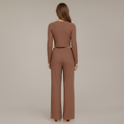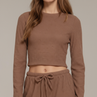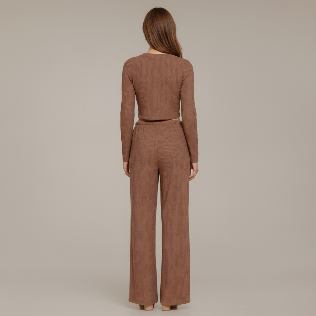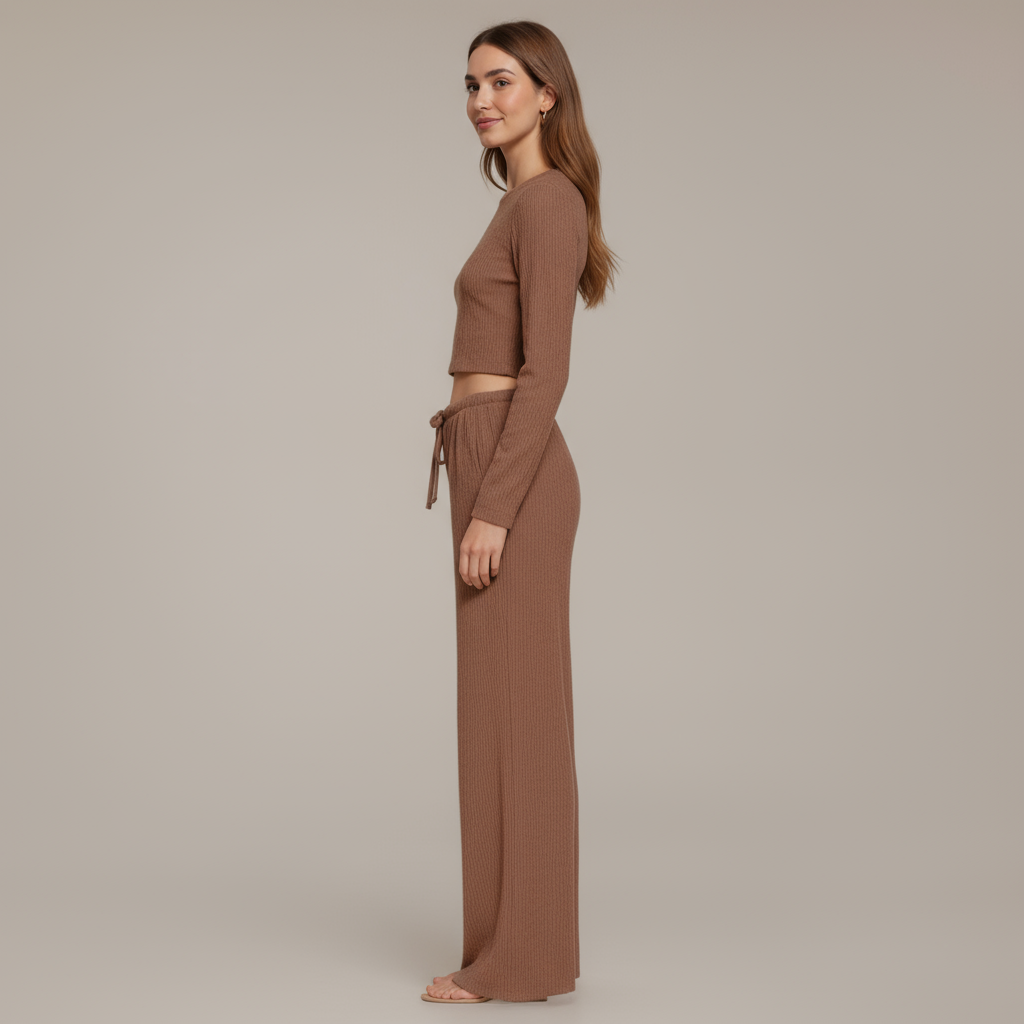 This ribbed lounge set combines a fitted long sleeve crop top with relaxed, wide leg pants for a modern take on cozy essentials. The soft, stretchy knit ensures all-day comfort, while the pants feature a flattering high rise and adjustable drawstring waist for a personalized fit. Designed with functional side pockets, this set offers an effortless look that moves seamlessly from lounging at home to casual outings.