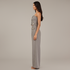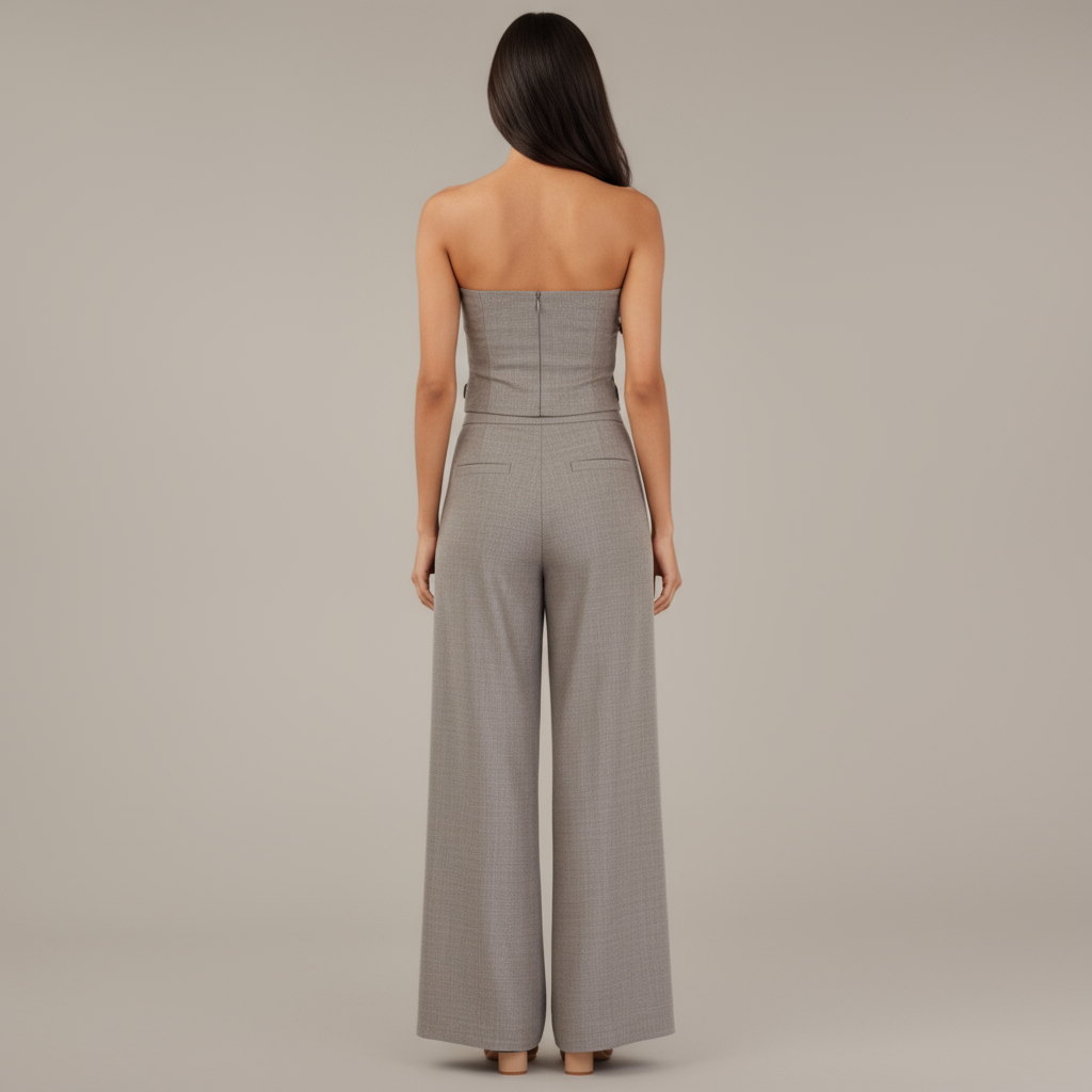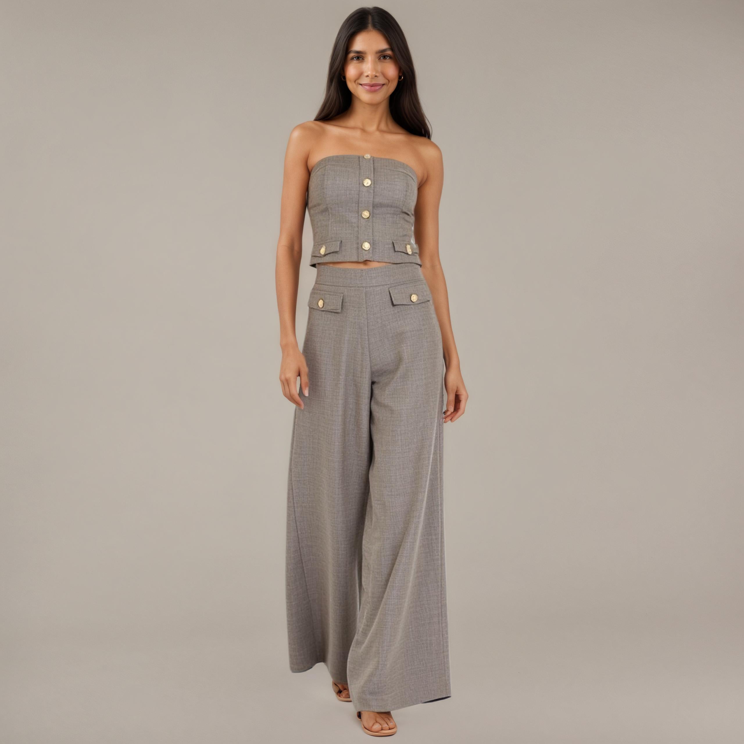 This strapless two-piece set offers a modern take on tailoring with a sleek, fitted crop top and coordinating wide-leg pants. The crop top features a button-front design with gold-tone detailing, adding a polished accent to its structured silhouette. Matching pants with a high waist and buttoned flap accents create a balanced, elongated look. Perfect for versatile styling, this set transitions seamlessly from day to night.