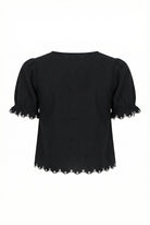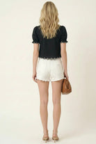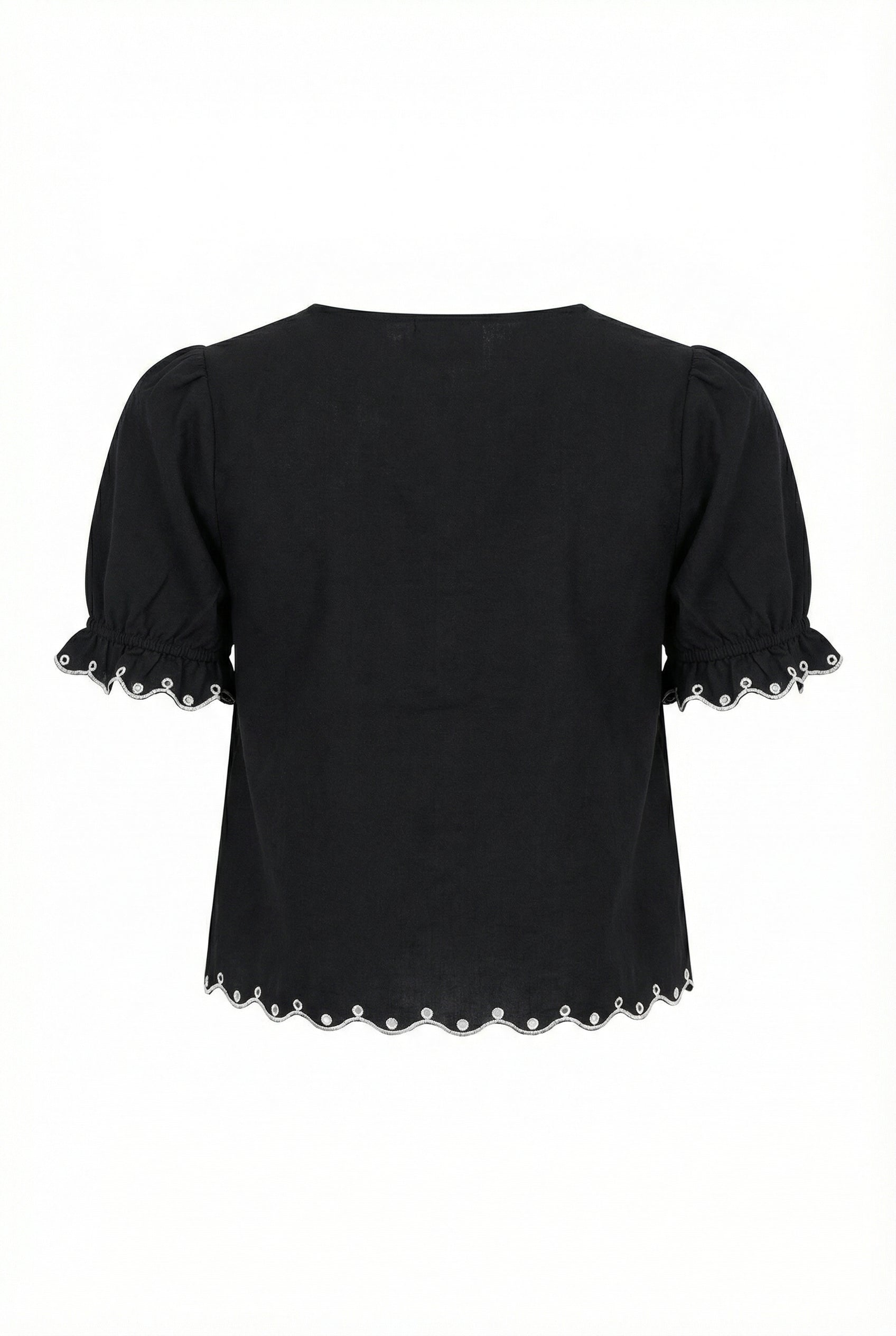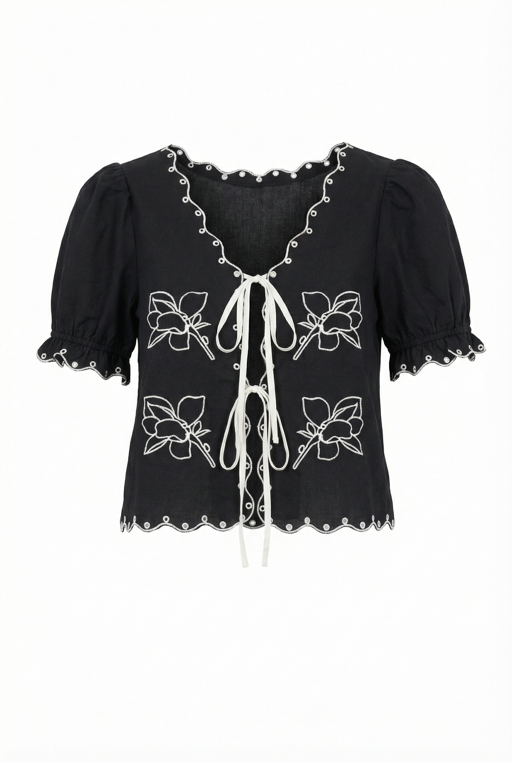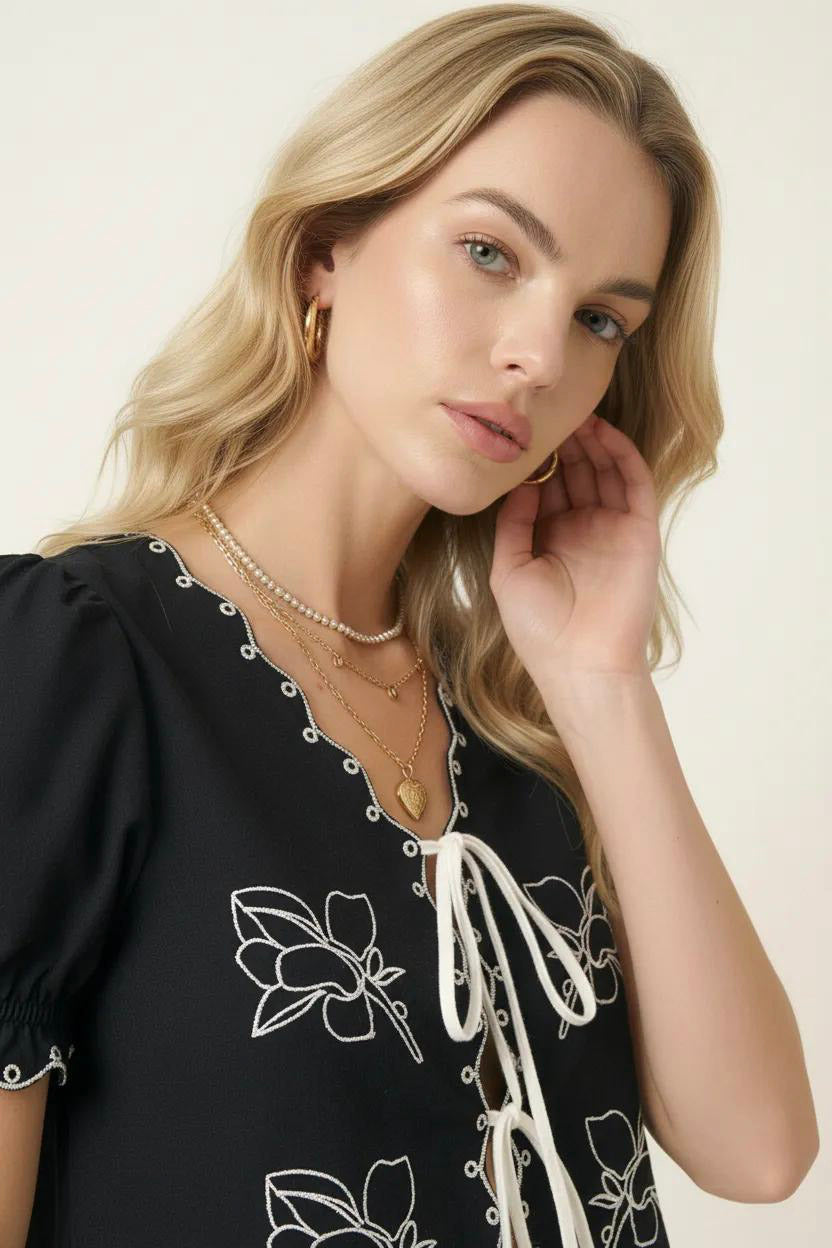 This charming puff sleeve blouse features a double tie-front design with intricate floral embroidery that adds a soft, feminine touch. The scalloped hem and eyelet trim detail enhance its playful yet polished look, making it perfect for pairing with high-rise denim or summer skirts. A versatile warm-weather staple that balances sweet and statement.