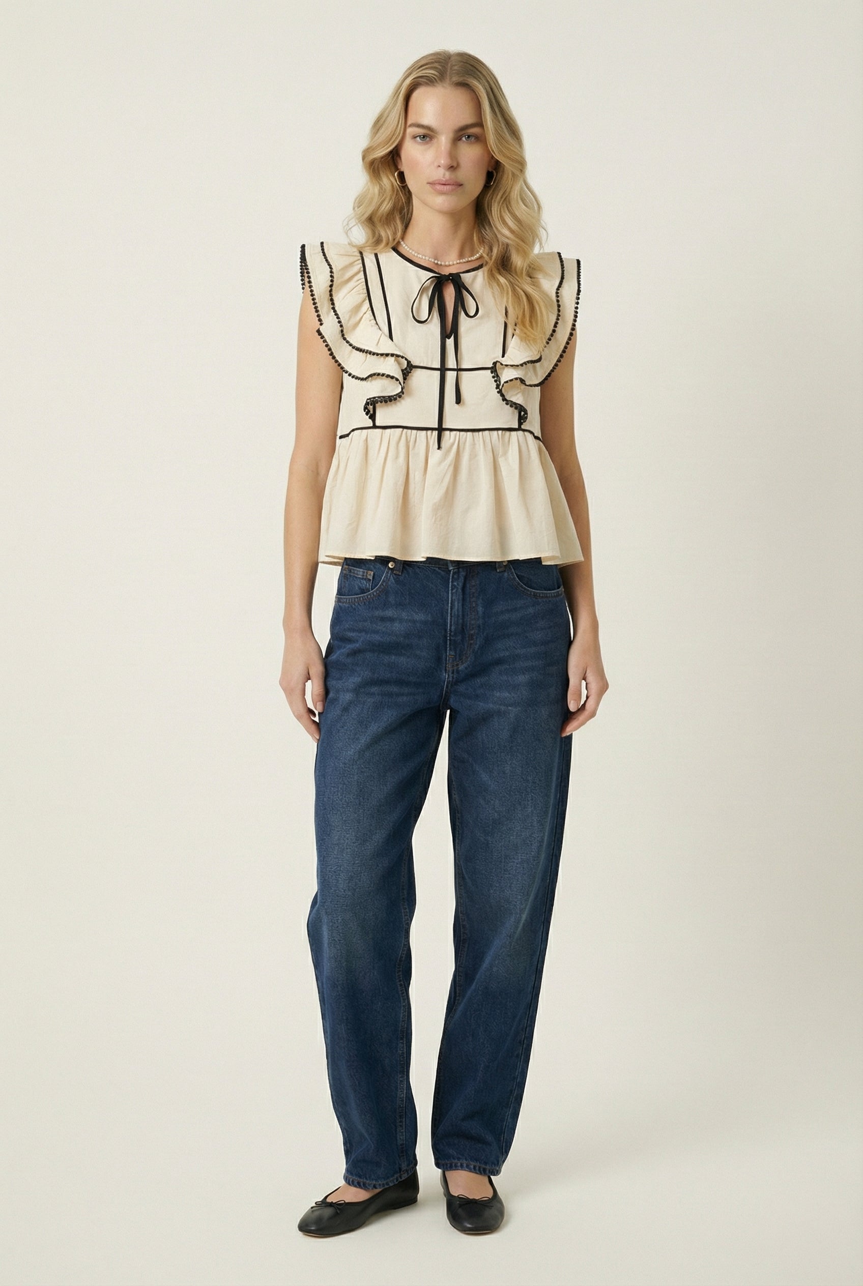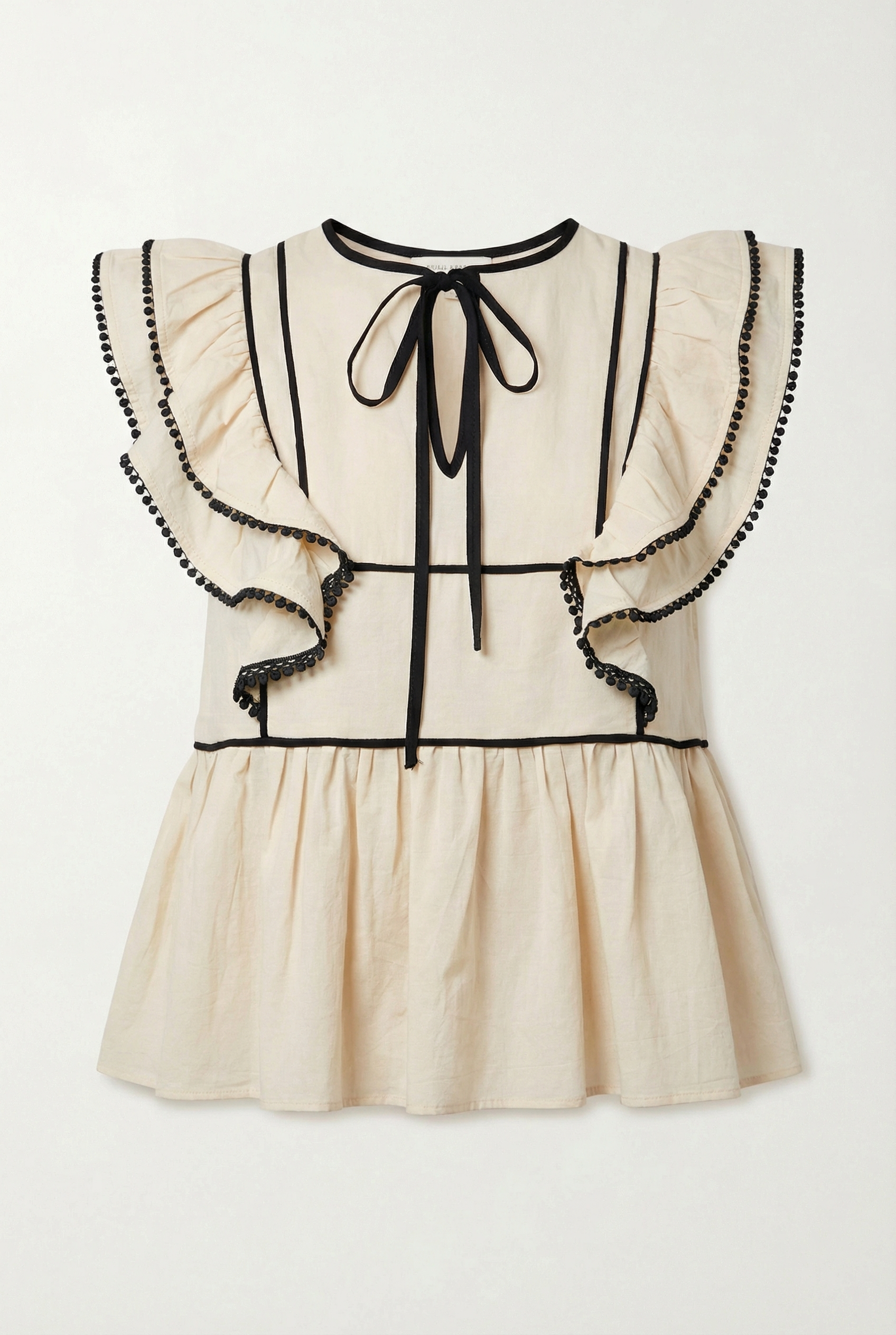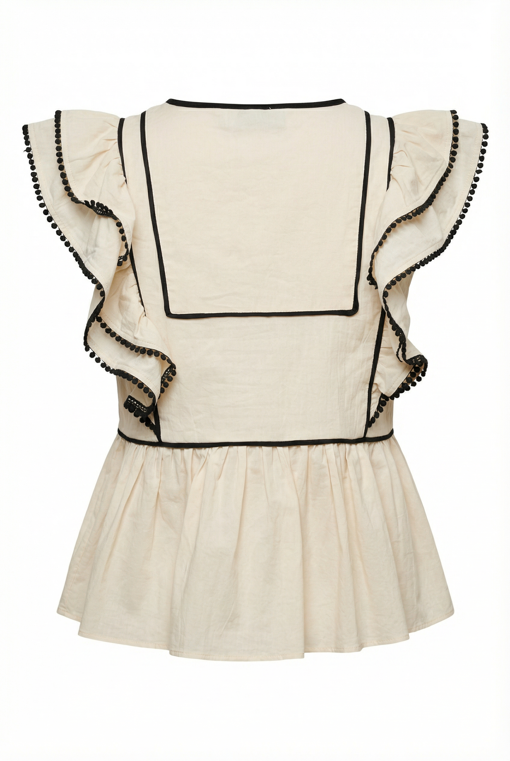 Charming and structured, this sleeveless peplum top is framed with ruffled sleeves trimmed in bold contrast piping and delicate pom-pom edging. A front keyhole tie adds a touch of femininity, while the peplum hem creates a flattering silhouette. Pair it with denim for a playful weekend look or style it with trousers for a polished outfit.