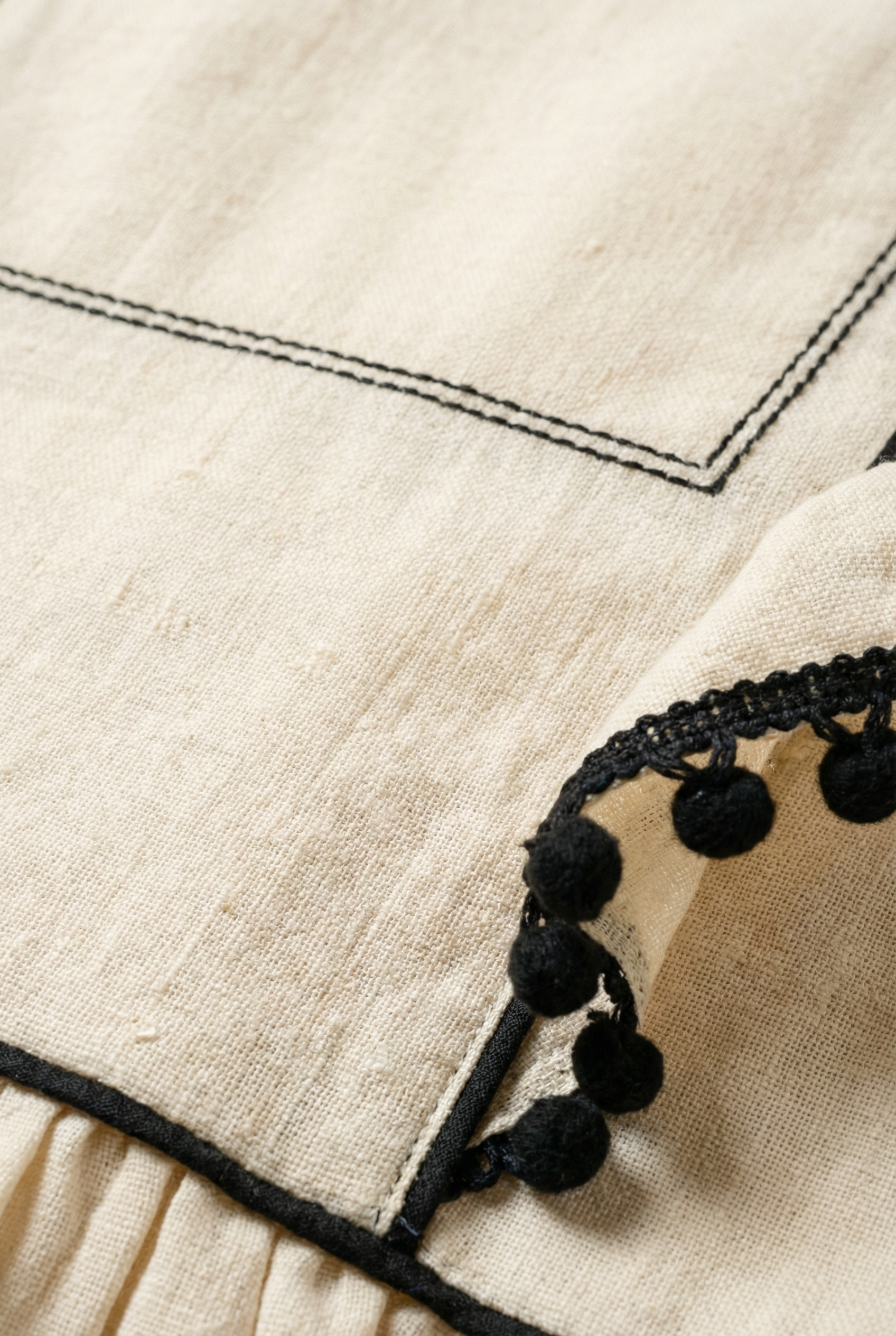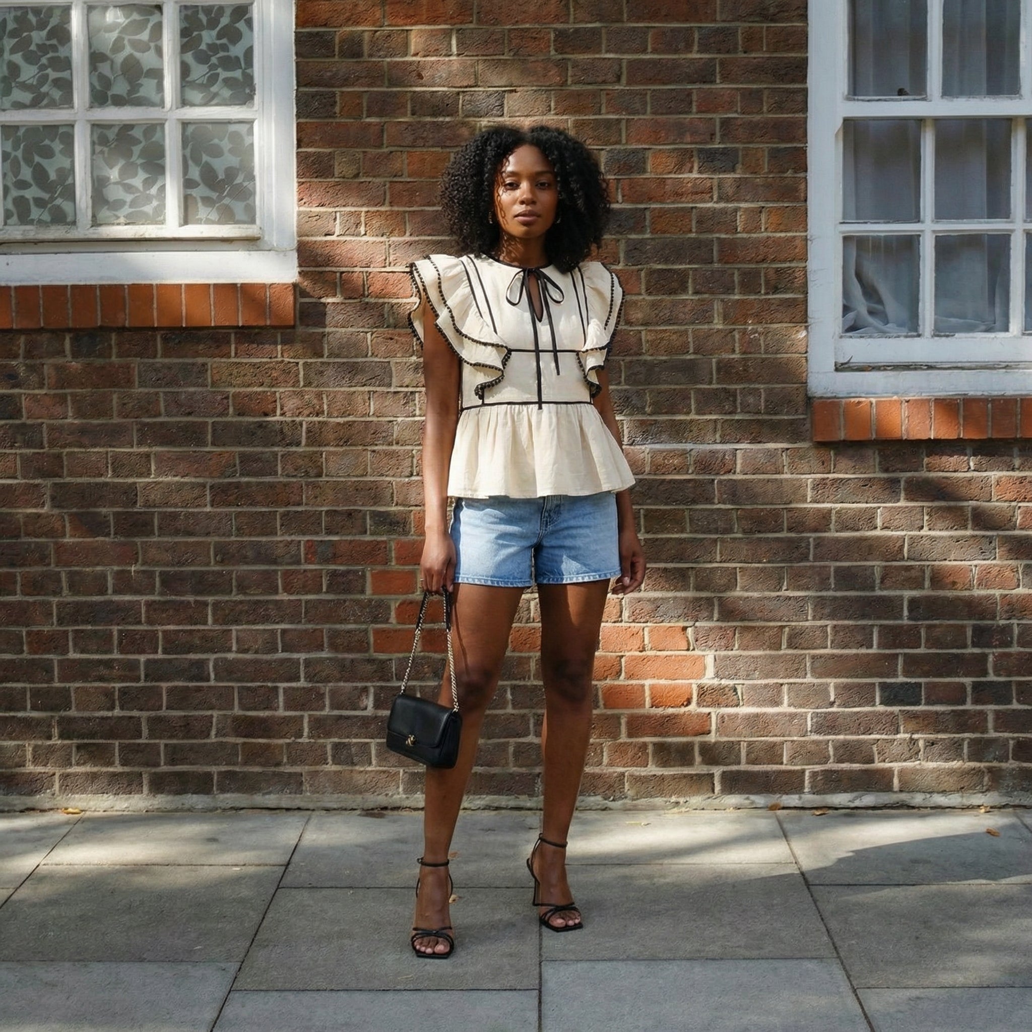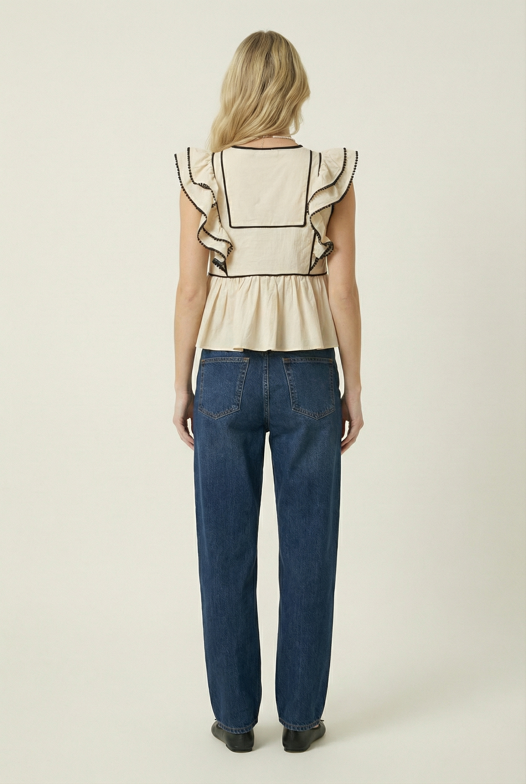 Charming and structured, this sleeveless peplum top is framed with ruffled sleeves trimmed in bold contrast piping and delicate pom-pom edging. A front keyhole tie adds a touch of femininity, while the peplum hem creates a flattering silhouette. Pair it with denim for a playful weekend look or style it with trousers for a polished outfit.