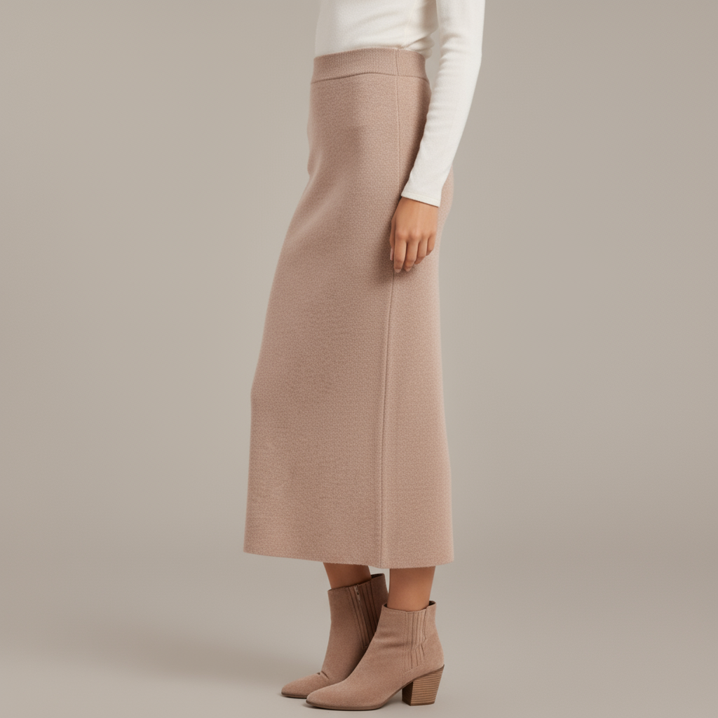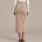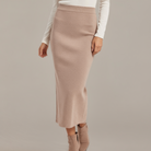 This elevated knit midi skirt is crafted from a soft, textured stretch fabric that molds comfortably to the body while maintaining its shape. The wide high-rise waistband creates a smooth, flattering fit through the waist and hips. Designed with a straight cut and clean finish, it offers an effortless silhouette ideal for day-to-night styling. Pair it with fitted tops or oversized knits to shift between polished and laid-back looks. A refined essential for every modern wardrobe.