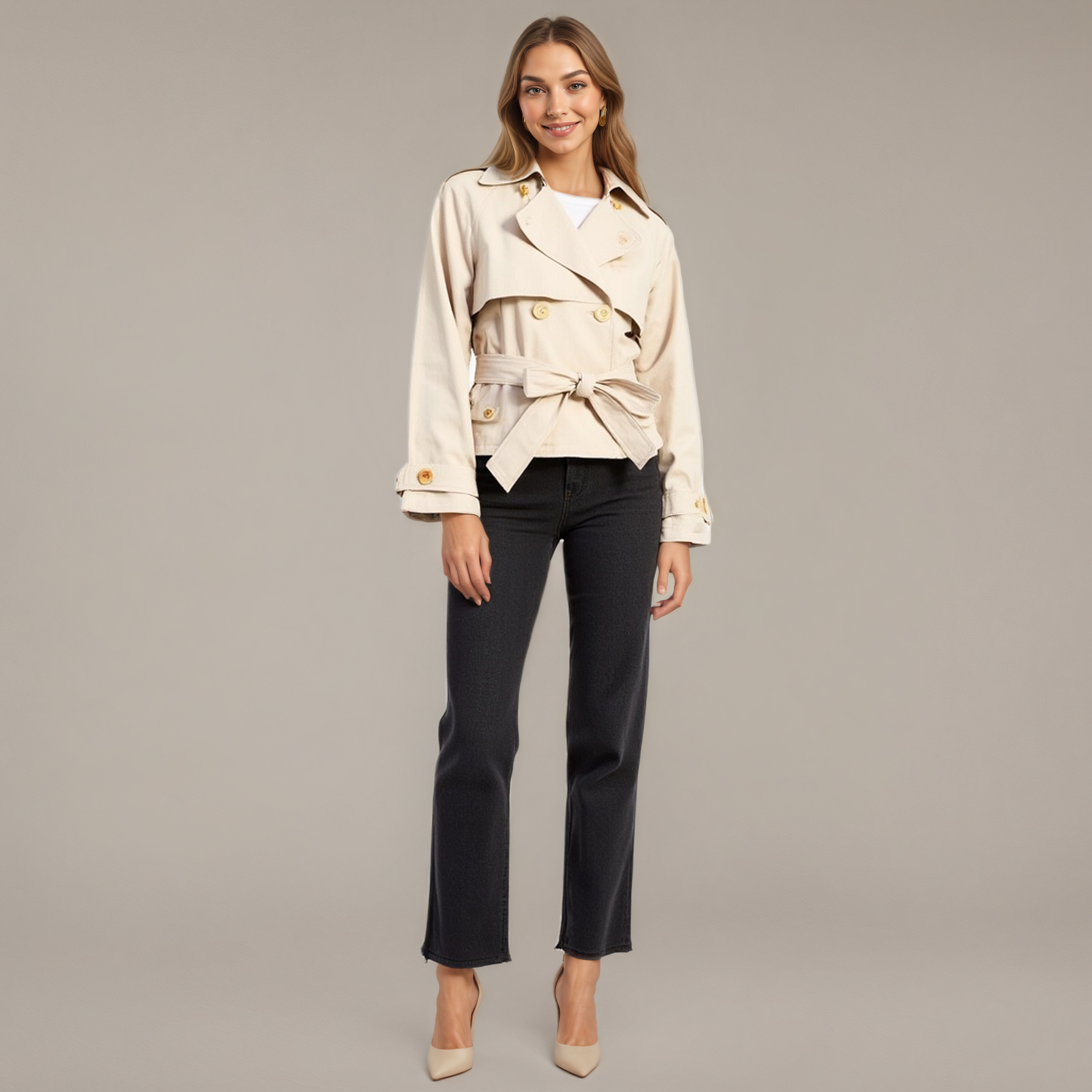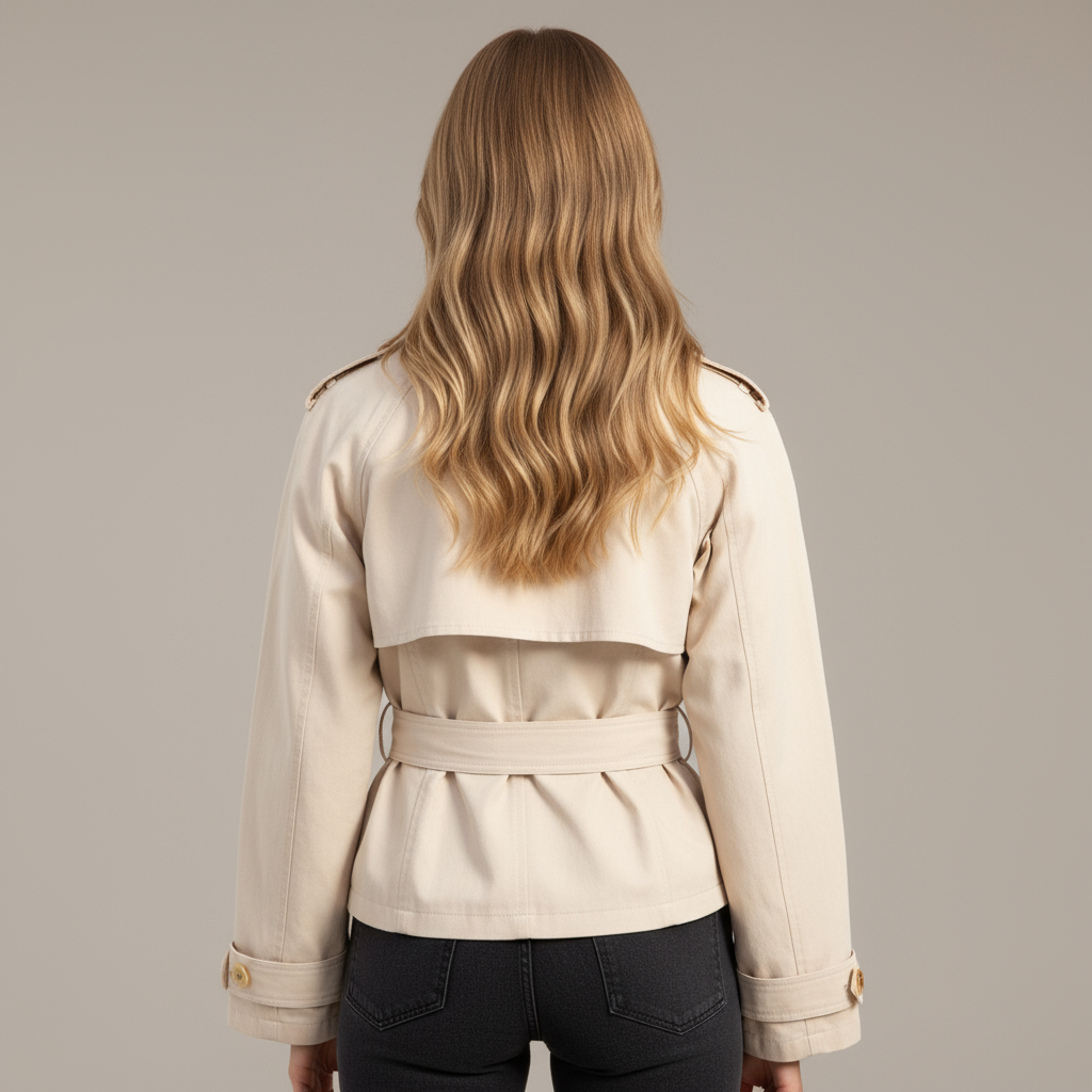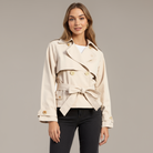 A modern take on the classic trench, this cropped jacket features a structured double-breasted front, epaulet shoulders, and a belted waist for a flattering fit. Decorative cuff tabs and sleek gold-tone buttons add tailored polish. The wide lapels and storm flap offer a timeless touch, while the cropped length keeps the silhouette fresh and versatile. Style it over slim pants or dresses for instant refinement.
