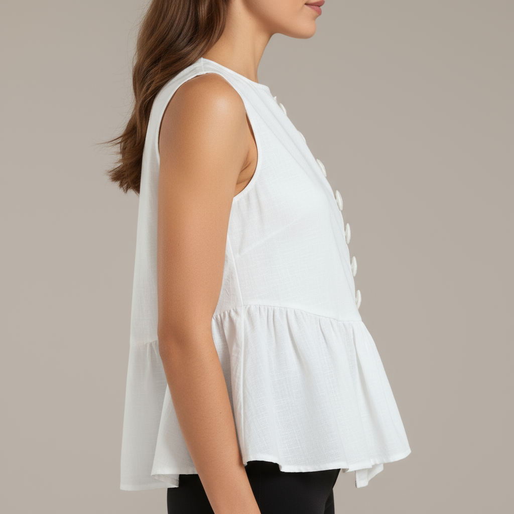 This sleeveless peplum top combines tailored elegance with playful detailing. The asymmetric pearl button front adds a refined focal point, while the peplum hem creates a flattering, feminine silhouette. Crafted from a smooth, structured fabric, it offers a polished look ideal for pairing with tailored pants or skirts.