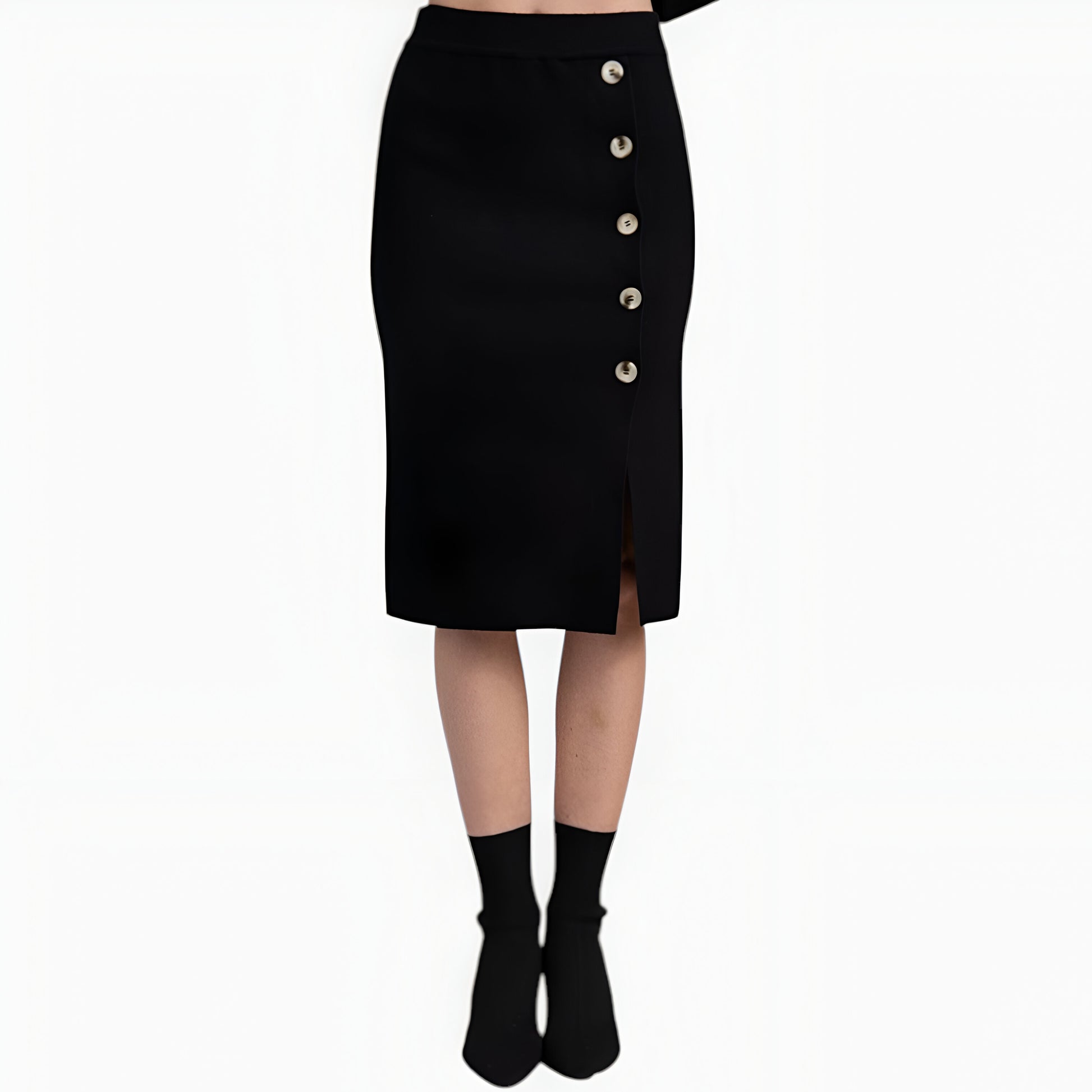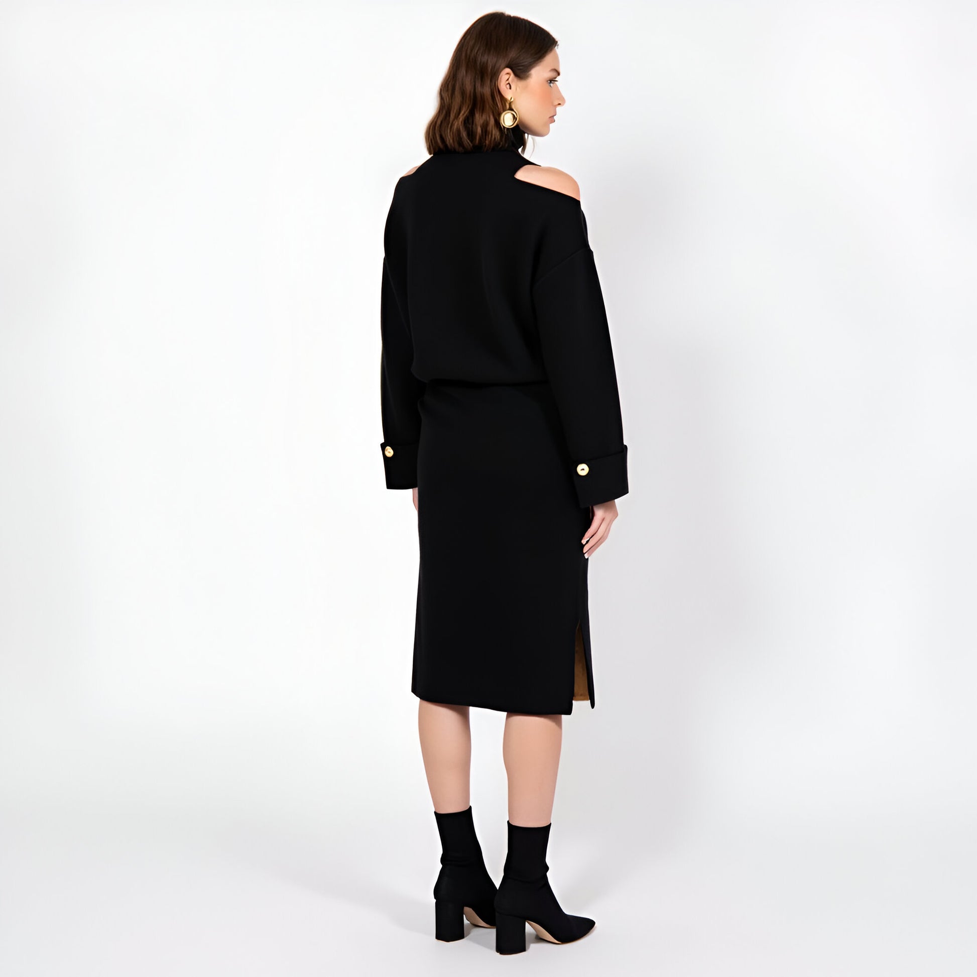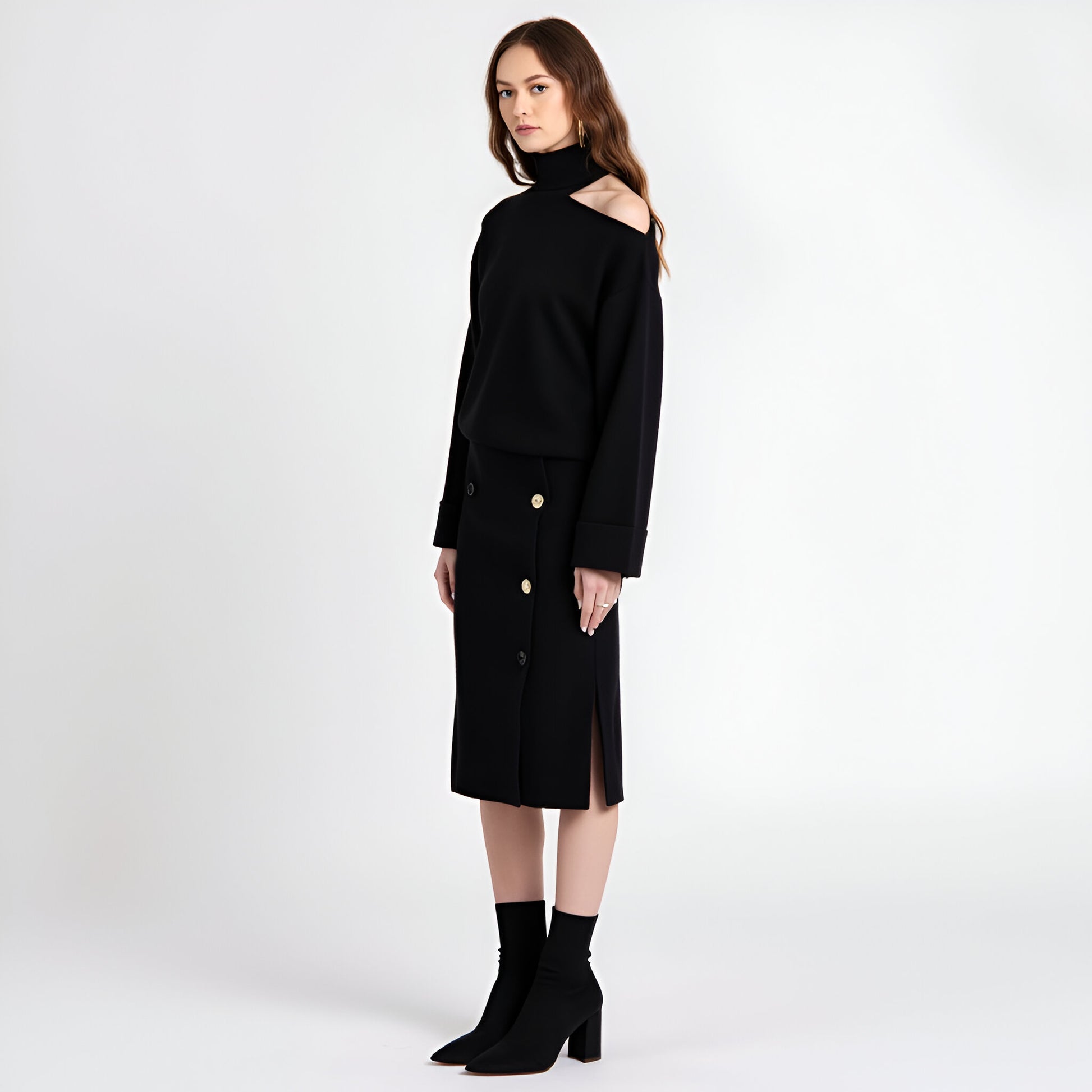 Modern, refined, and a little unexpected—this two-piece set pairs an asymmetric turtleneck pullover with a sleek midi skirt. The relaxed-fit top features a dramatic off-shoulder neckline and structured cuffs, creating a sculptural silhouette. The matching skirt sits high at the waist, accented with bold gold-tone buttons and a thigh-high front slit for just the right amount of edge. Crafted from a soft, structured knit, this set is perfect for dressing up or down with effortless confidence.