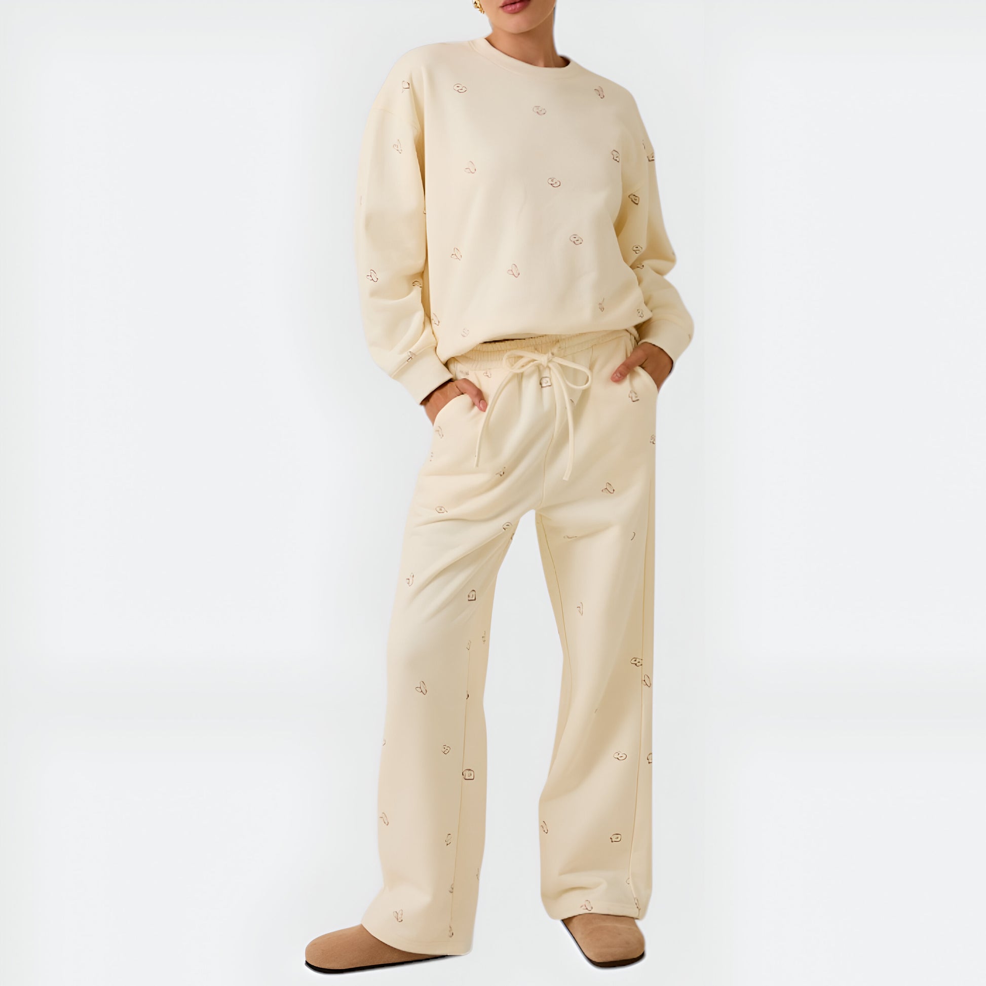 This embroidered lounge set combines easy comfort with playful charm, featuring a relaxed crewneck sweatshirt and wide leg pants. The subtle allover embroidery adds a sweet, whimsical detail to the buttery-soft knit fabric. With an elastic drawstring waist and roomy pockets, this set is perfect for unwinding at home or casual days out. Effortlessly stylish and cozy, it’s your new go-to for elevated loungewear.
