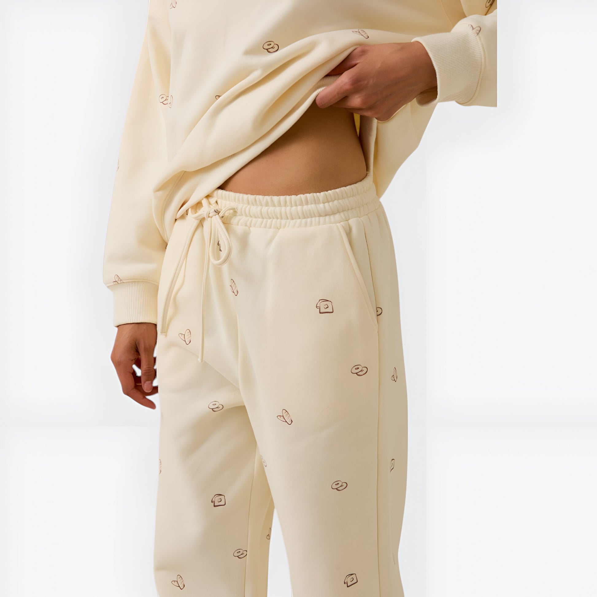 Bakery Embroidered Cream Lounge Set with Relaxed Fit Sweatshirt and Wide Leg Pants