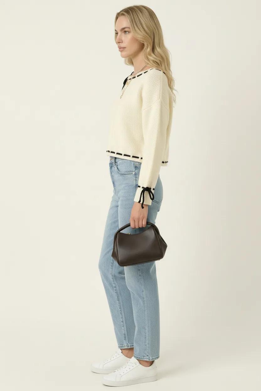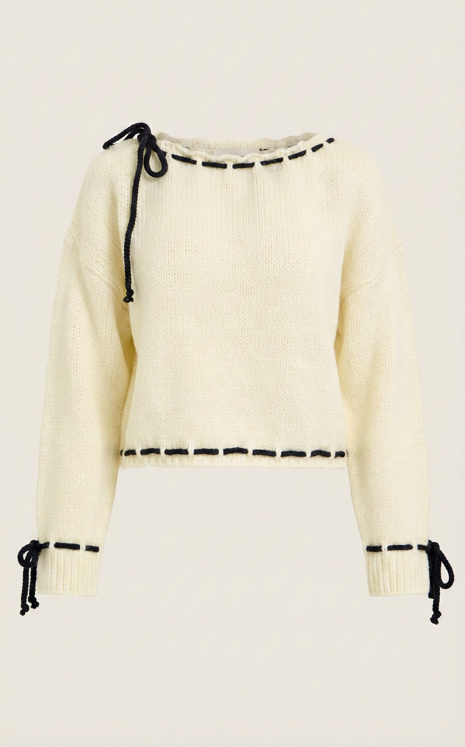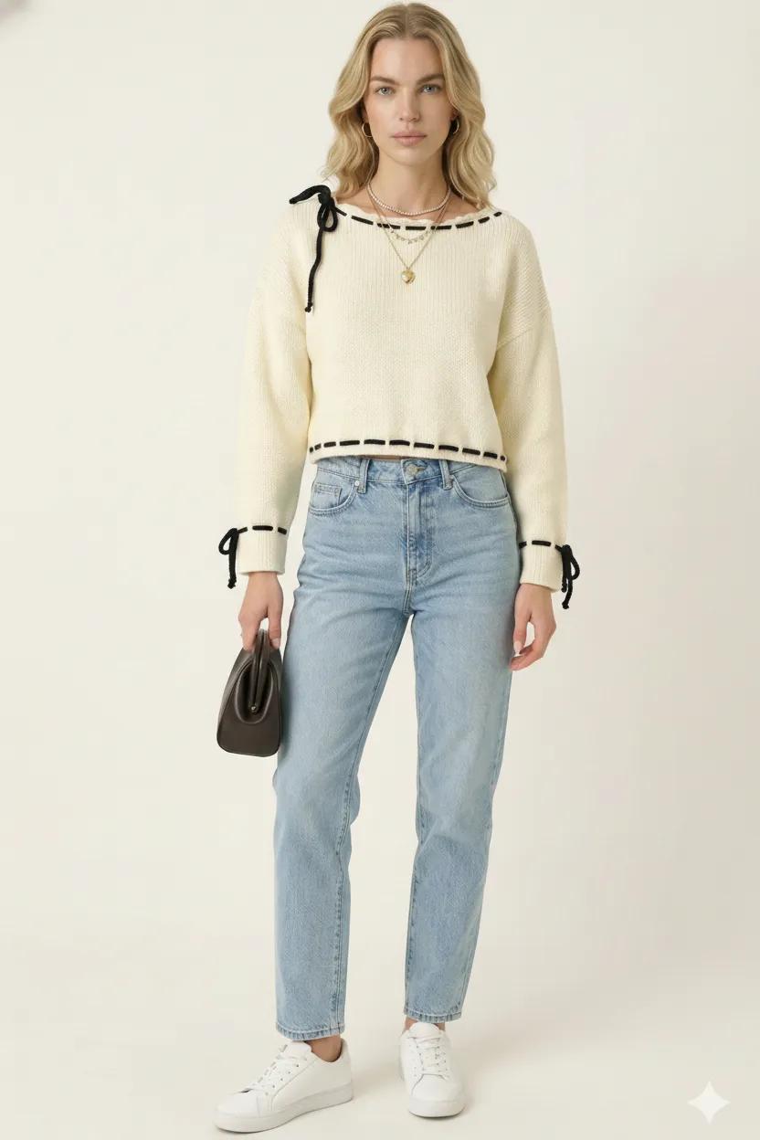 This cozy knit sweater features playful contrast ties woven through the scalloped boat neckline, cuffs, and hem for a touch of modern whimsy. The relaxed drop-shoulder fit and softly cropped length create a flattering, easygoing silhouette. Crafted from plush knit fabric, it’s warm yet breathable—perfect for transitional weather or layering. Style it with high-rise jeans or skirts for a chic, laid-back look.