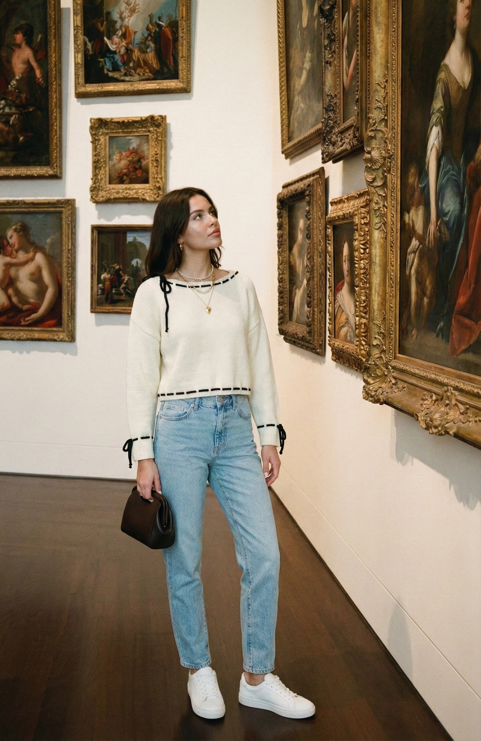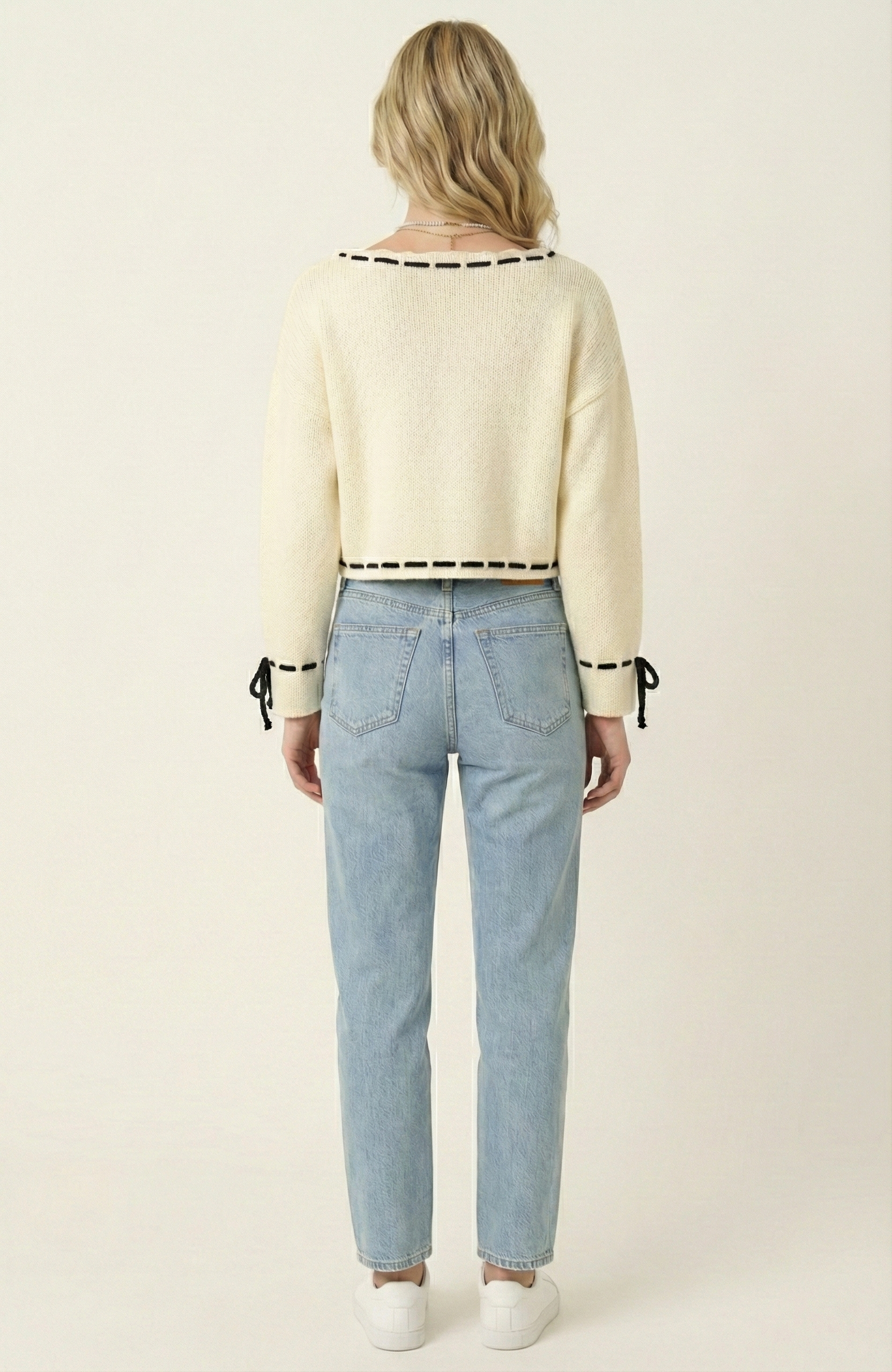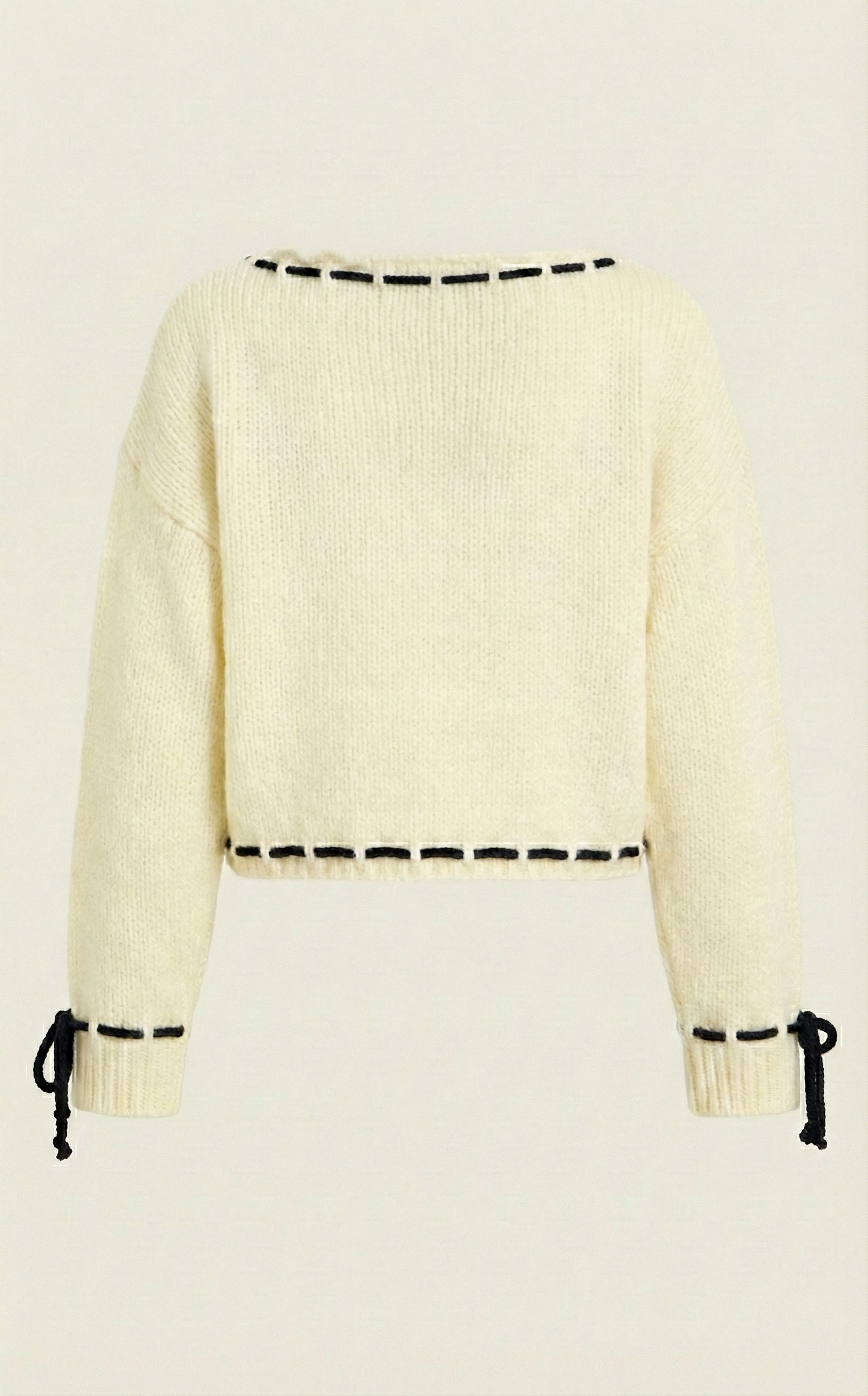 This cozy knit sweater features playful contrast ties woven through the scalloped boat neckline, cuffs, and hem for a touch of modern whimsy. The relaxed drop-shoulder fit and softly cropped length create a flattering, easygoing silhouette. Crafted from plush knit fabric, it’s warm yet breathable—perfect for transitional weather or layering. Style it with high-rise jeans or skirts for a chic, laid-back look.