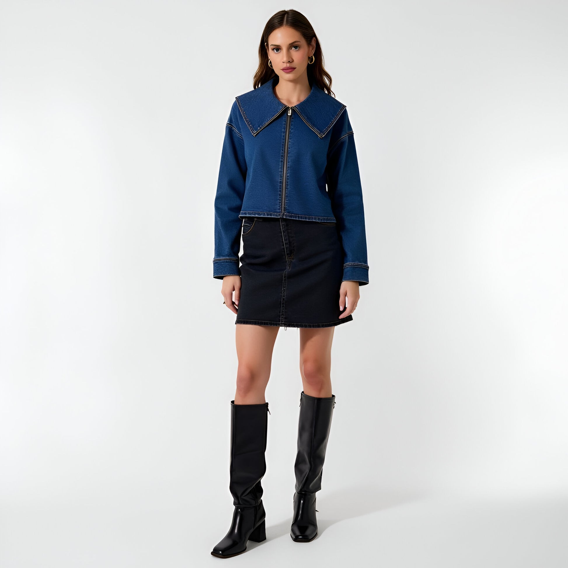 This cropped denim jacket stands out with its dramatic oversized point collar and sleek front zip closure. The structured silhouette and clean lines give it a distinctly modern feel, while topstitching adds subtle texture. Finished with cuffed long sleeves and a straight hem, it’s an easy piece to layer over tees or turtlenecks. Pair it with matching denim or tailored pants for a fresh, coordinated look.