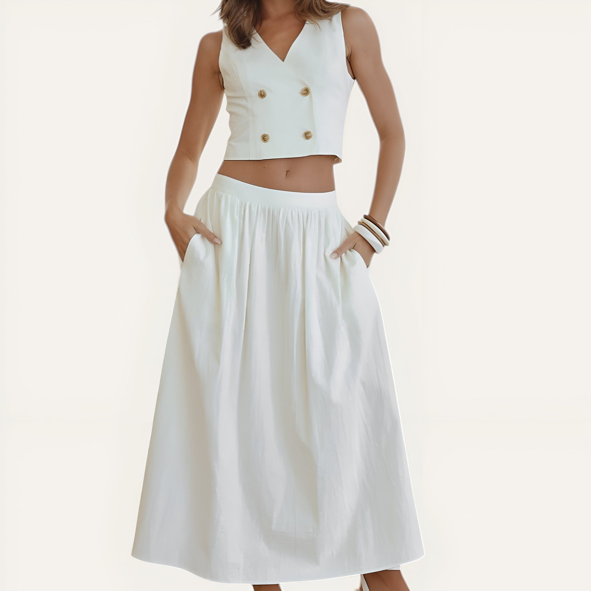 This two-piece set offers a refined yet relaxed silhouette with a tailored cropped vest top featuring a double-breasted button design and a deep V-neckline. The matching maxi skirt is crafted with an elastic waistband for all-day comfort and subtle side pockets for functionality. Perfect for pairing with sandals or wedges for a fresh, effortless look.