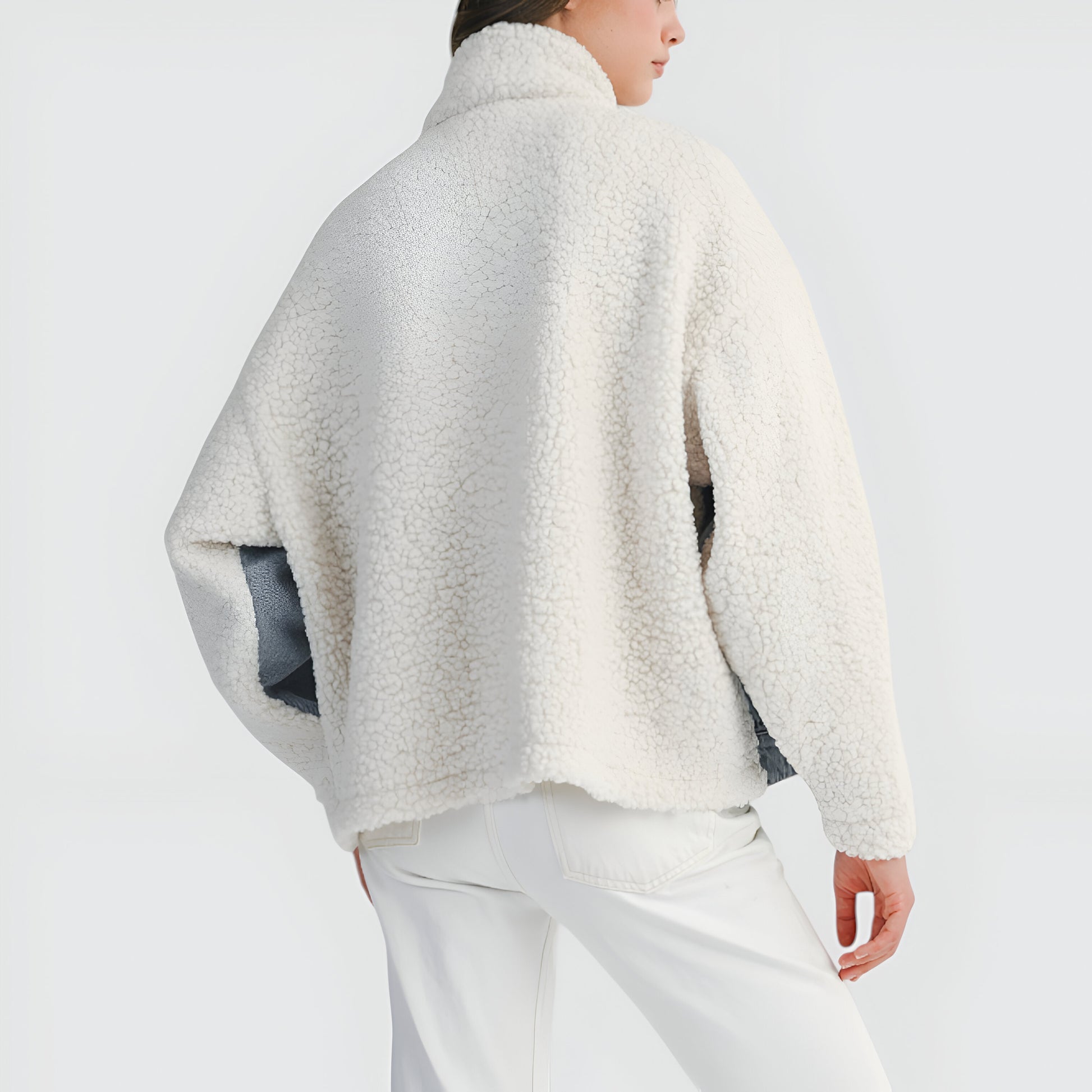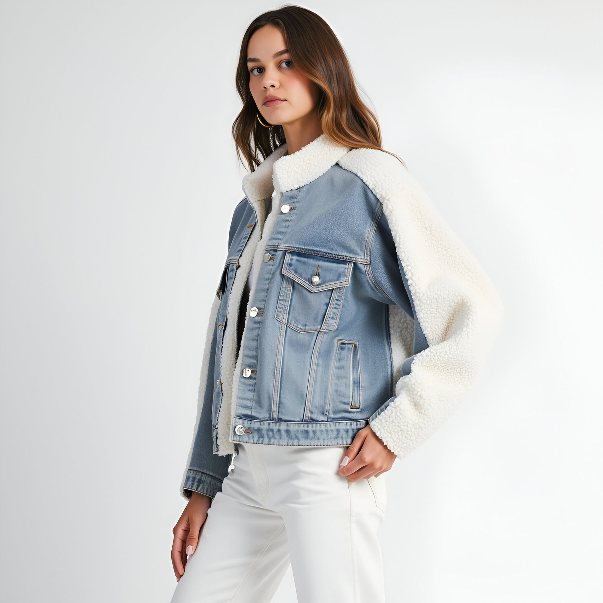 A fresh take on the classic jean jacket, this piece features soft faux shearling trim along the collar, sleeves, and seams for a cozy, textured look. The relaxed, slightly cropped fit pairs perfectly with everything from jeans to skirts, while the button-front closure and chest pockets add authentic denim details. Lined with plush faux shearling, it’s designed to keep you warm and stylish as temperatures drop. Throw it over your favorite basics for a modern twist on casual outerwear.