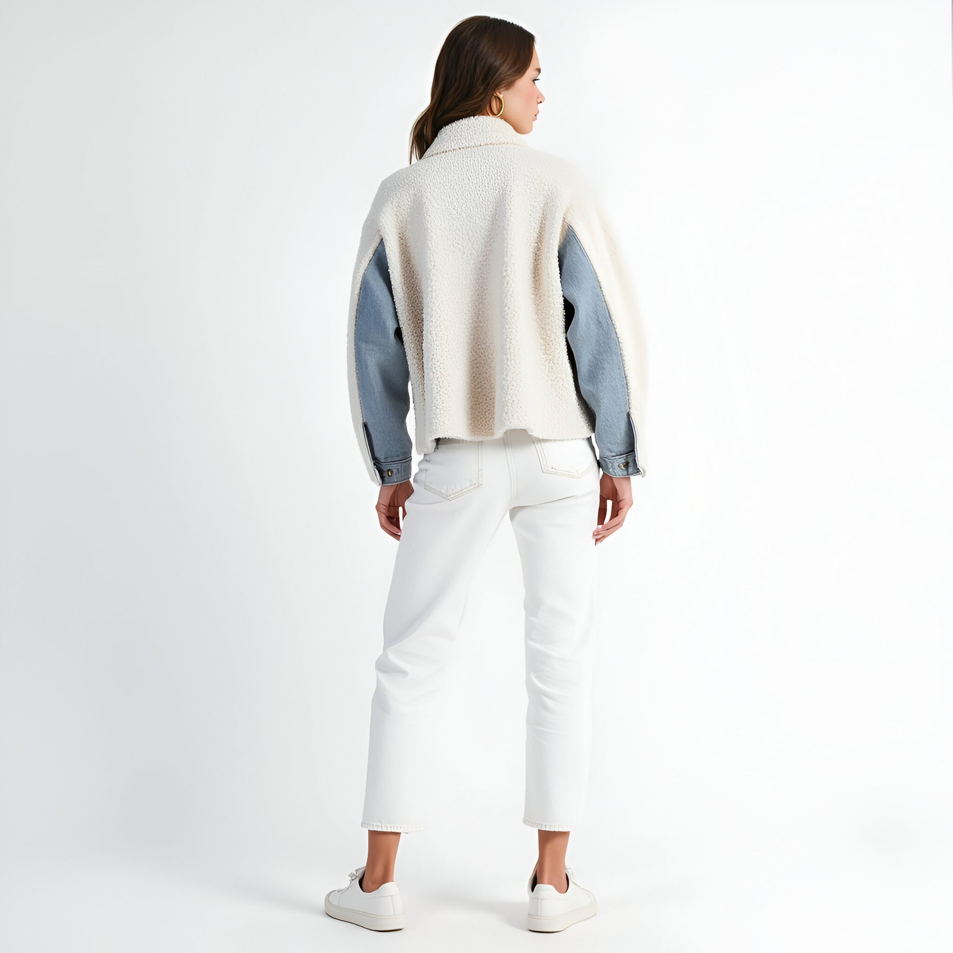 Denim Jacket with Faux Shearling Collar and Contrast Trim