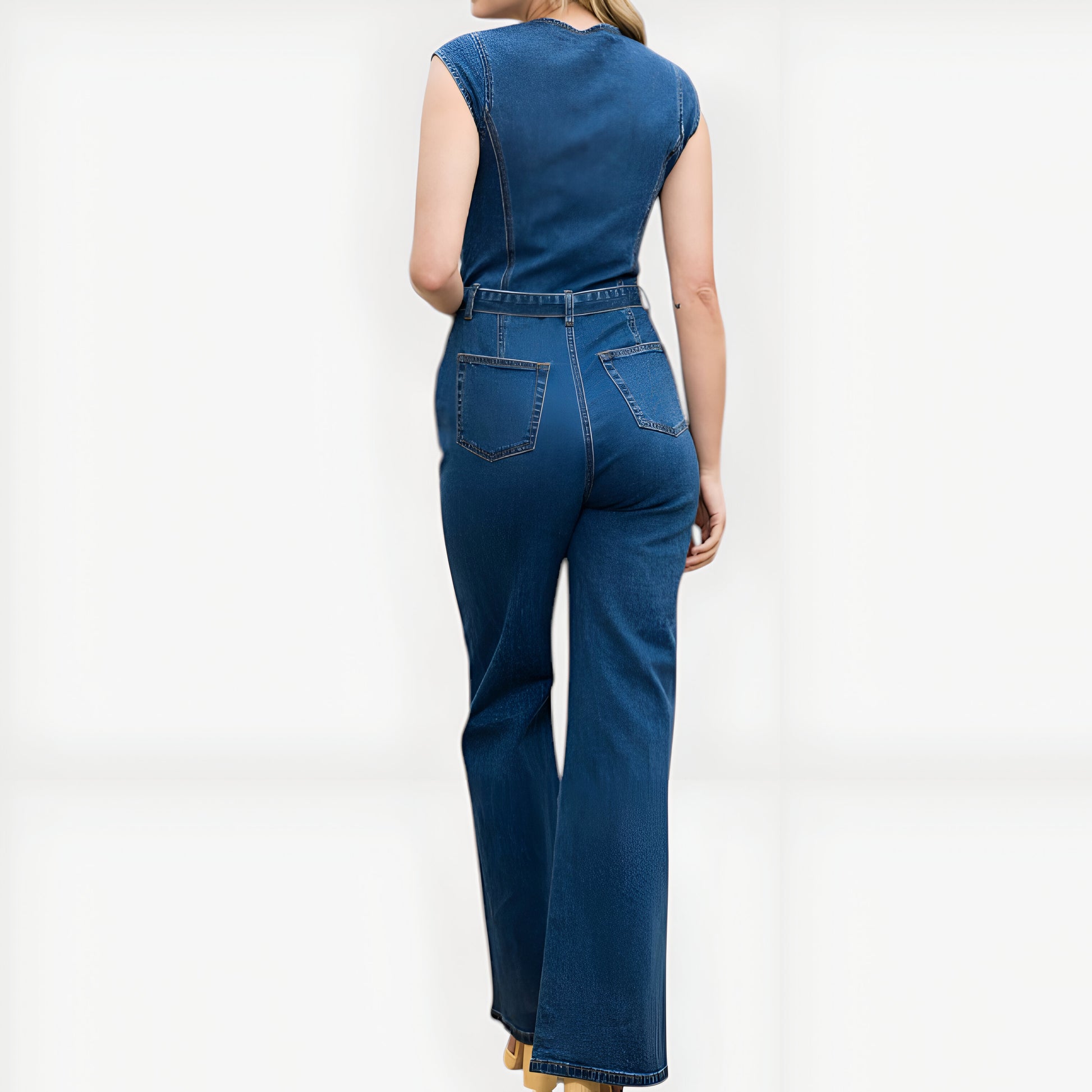 Make a bold statement with this denim jumpsuit featuring a flattering sweetheart neckline, a functional zip front, and a matching self-tie belt that defines the waist. Wide-leg pants create an effortlessly modern silhouette, while classic seaming and angled cap sleeves add vintage-inspired flair. The stretch denim ensures all-day comfort and a confident, curve-hugging fit. Perfect for dressing up or down, this one-piece is a standout for any wardrobe.