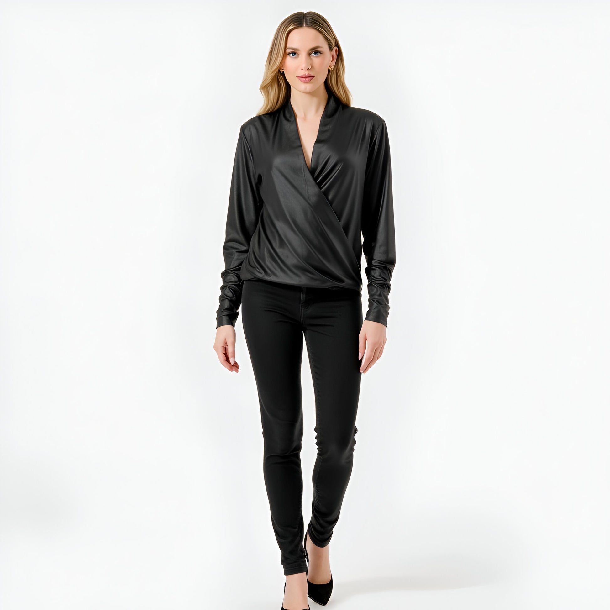 Sleek and sophisticated, this draped surplice blouse is crafted from soft satin with a luminous sheen. The deep V-neckline and wrap front design create a flattering silhouette, while long sleeves add a touch of elegance. Effortlessly pairs with everything from tailored trousers to denim for a modern, polished look.