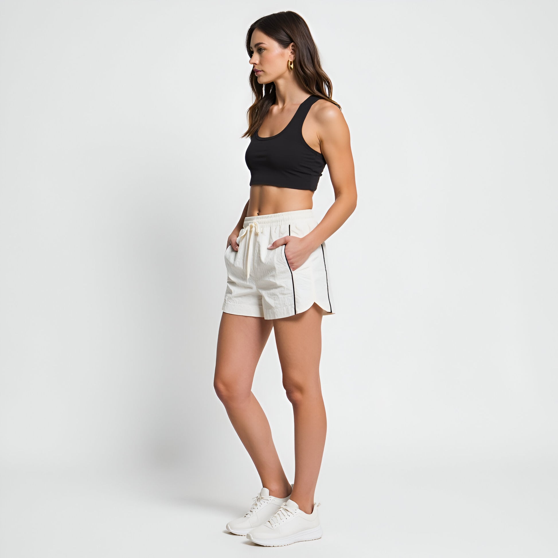 These lightweight, relaxed-fit shorts feature a comfortable elastic drawstring waistband for a customized fit. Sleek contrast piping at the sides adds a touch of sporty style, while deep side pockets provide everyday functionality. The easy-care woven fabric ensures breathability, making these shorts an effortless warm-weather staple for lounging, walking, or active days.