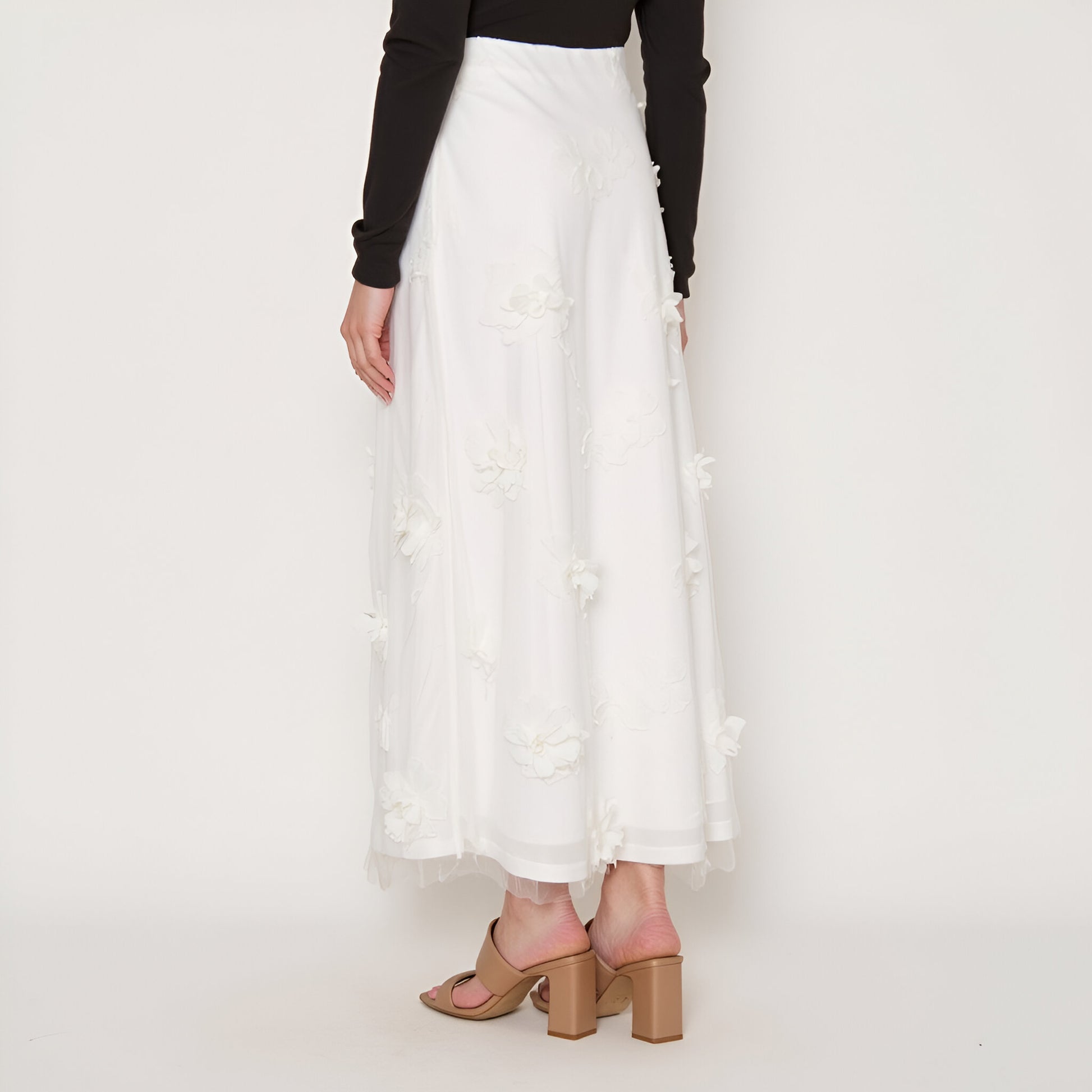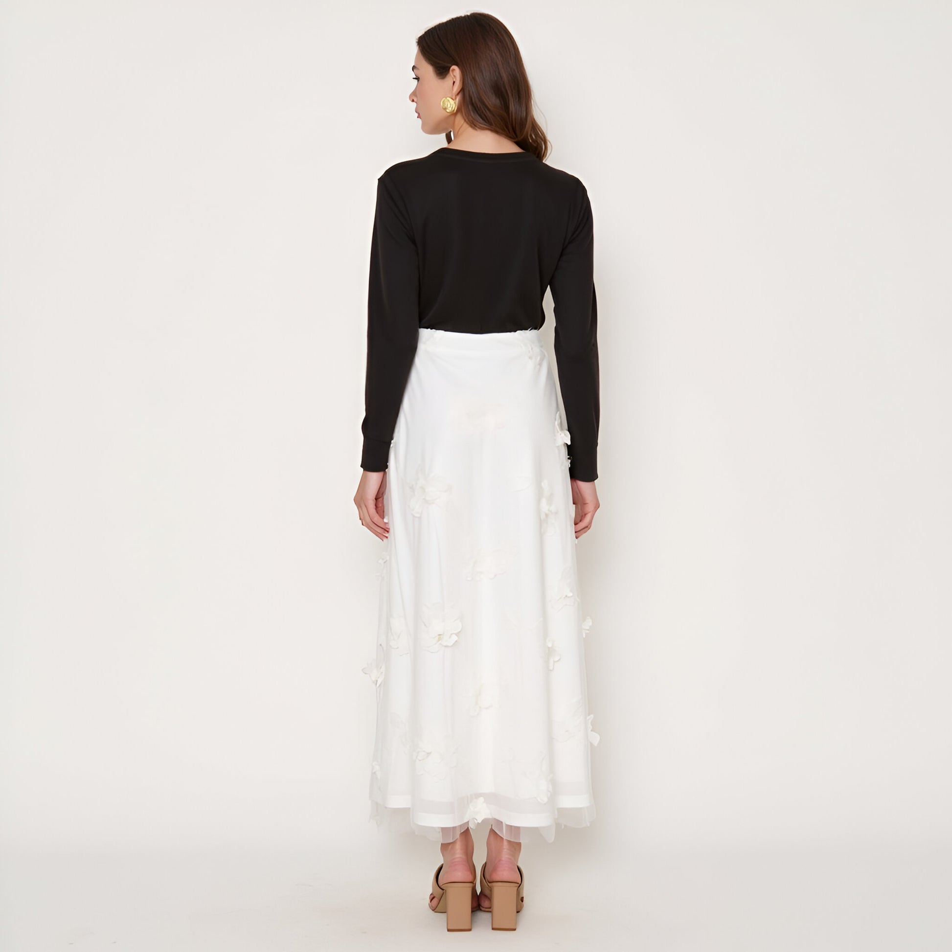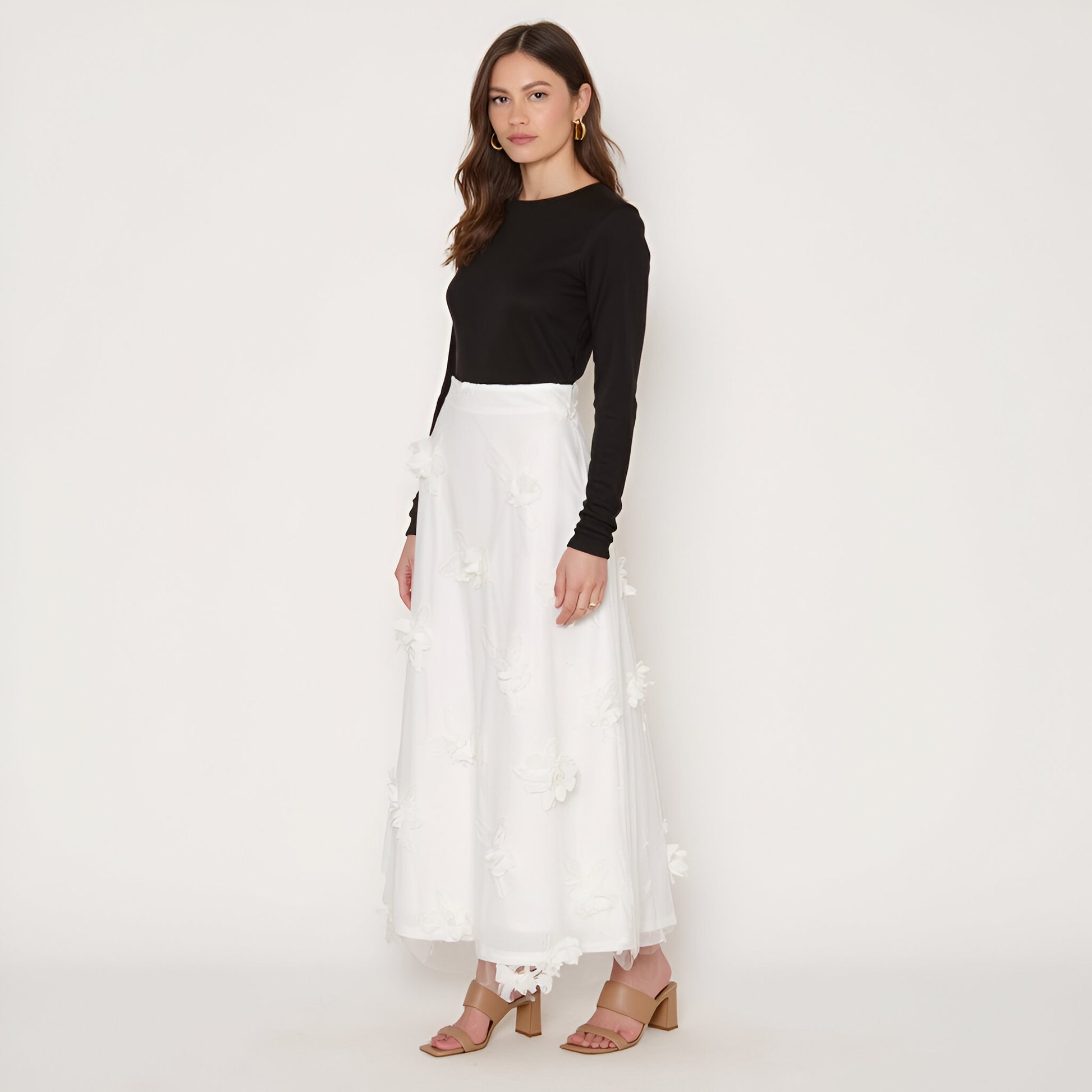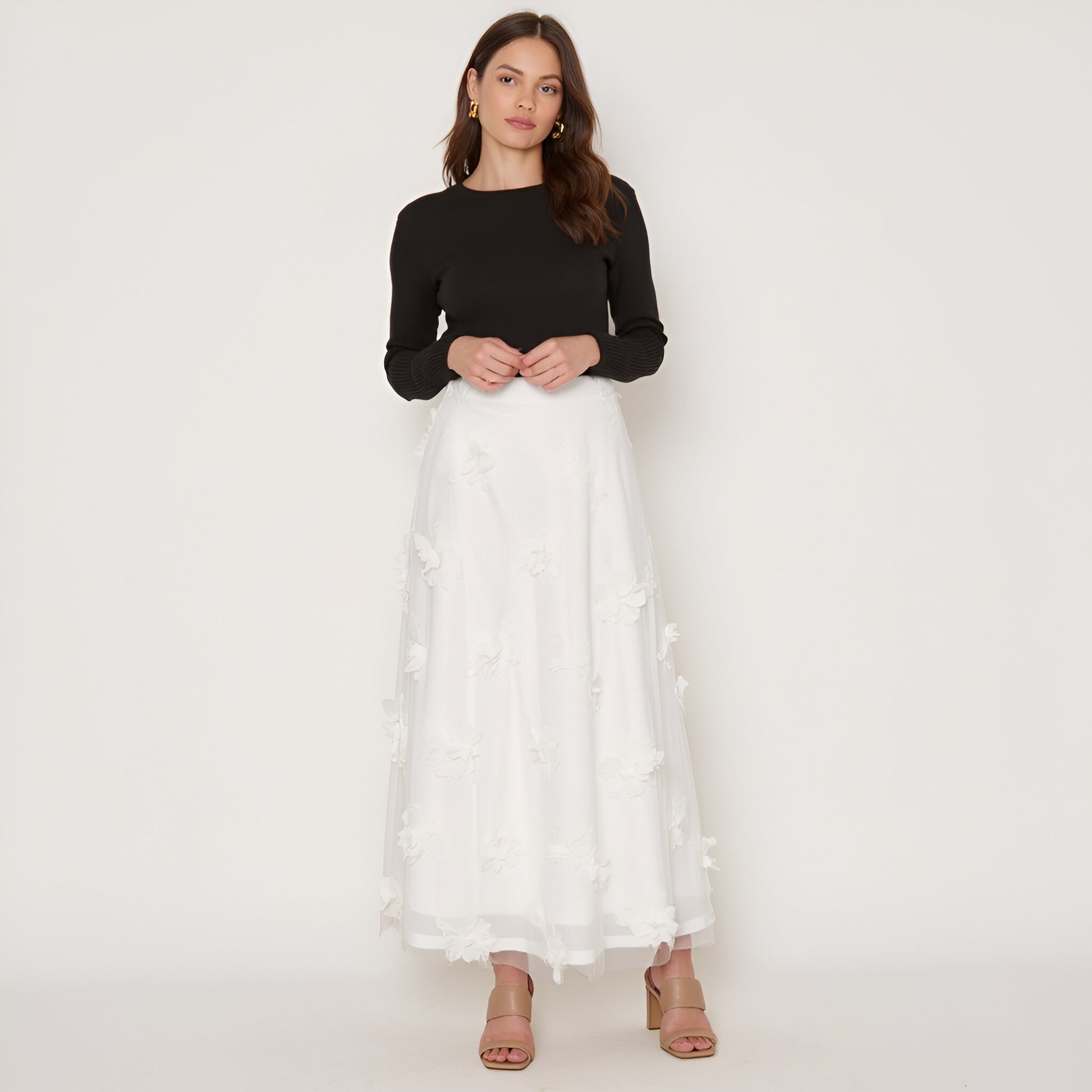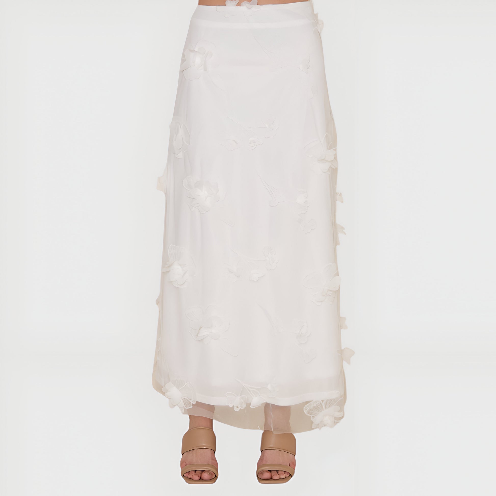 Delicate embroidered florals bring romantic dimension to this airy mesh maxi skirt. Designed with soft 3D appliqué detailing throughout, it creates a light, ethereal movement with every step. The flowy silhouette and sheer overlay balance elegance with comfort, making it easy to pair with sleek tops or fitted knits. A graceful choice that transitions effortlessly from day to evening.