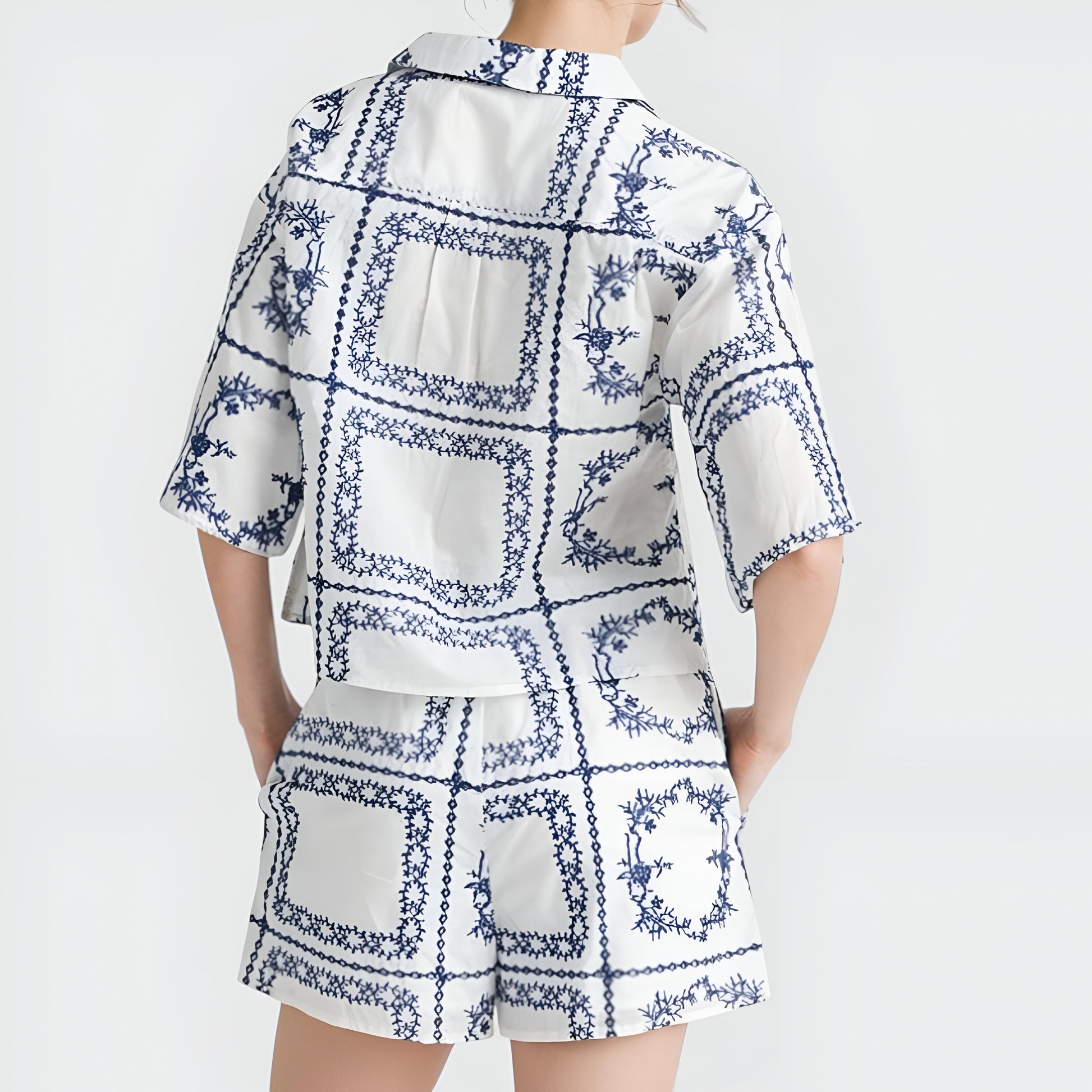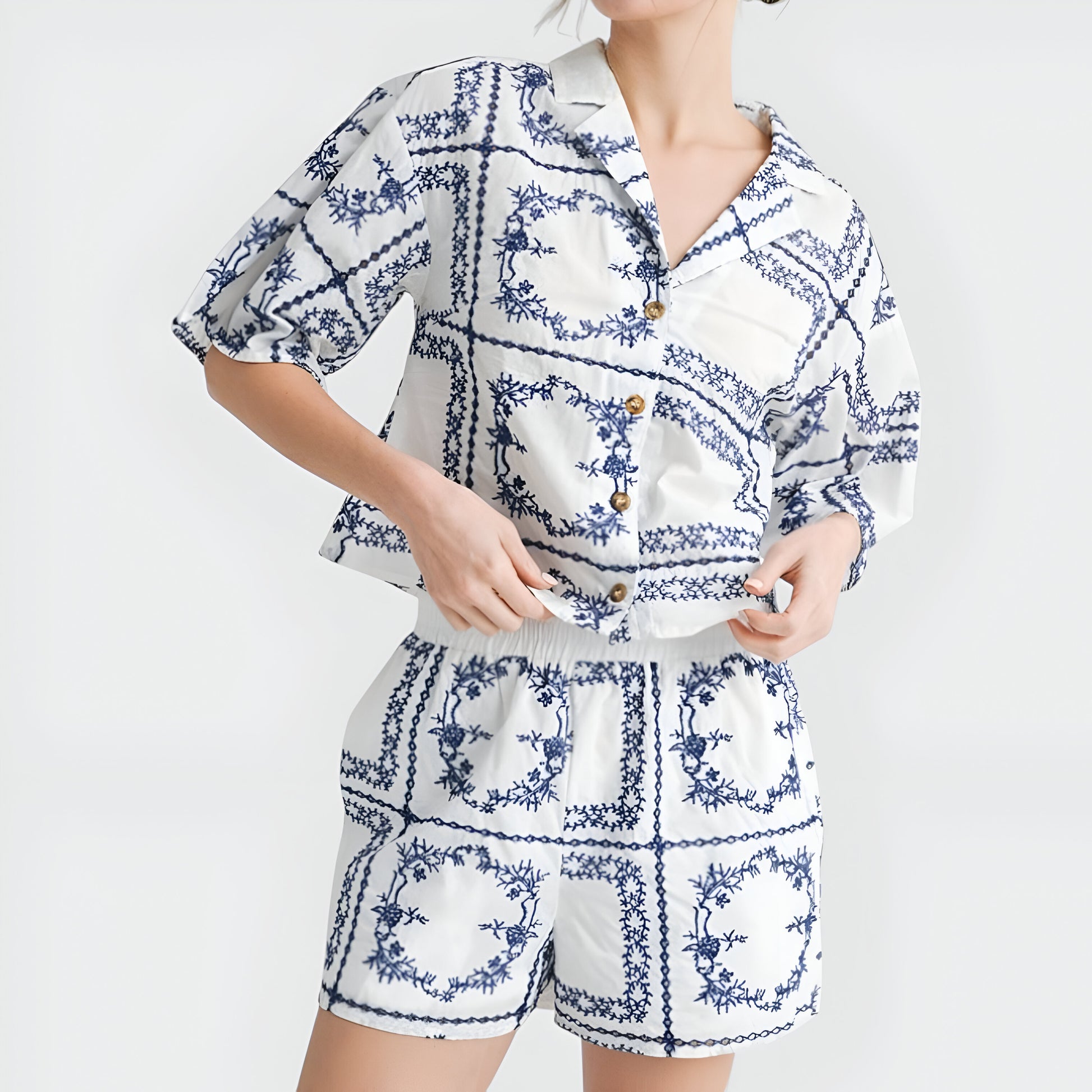 This set features a breezy button-up shirt with a striking blue embroidered tile print, paired with matching high-rise shorts for a coordinated warm-weather look. The relaxed fit and soft fabric make this duo perfect for staying stylish and comfortable, whether lounging or on the go. Tortoise buttons and notched collar add a tailored touch, while the shorts’ elastic waistband ensures easy, effortless wear.