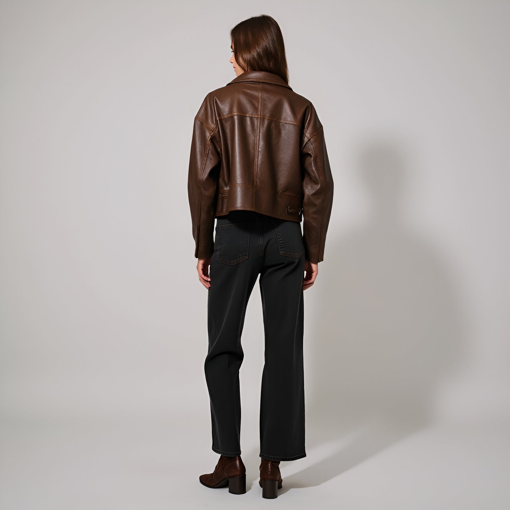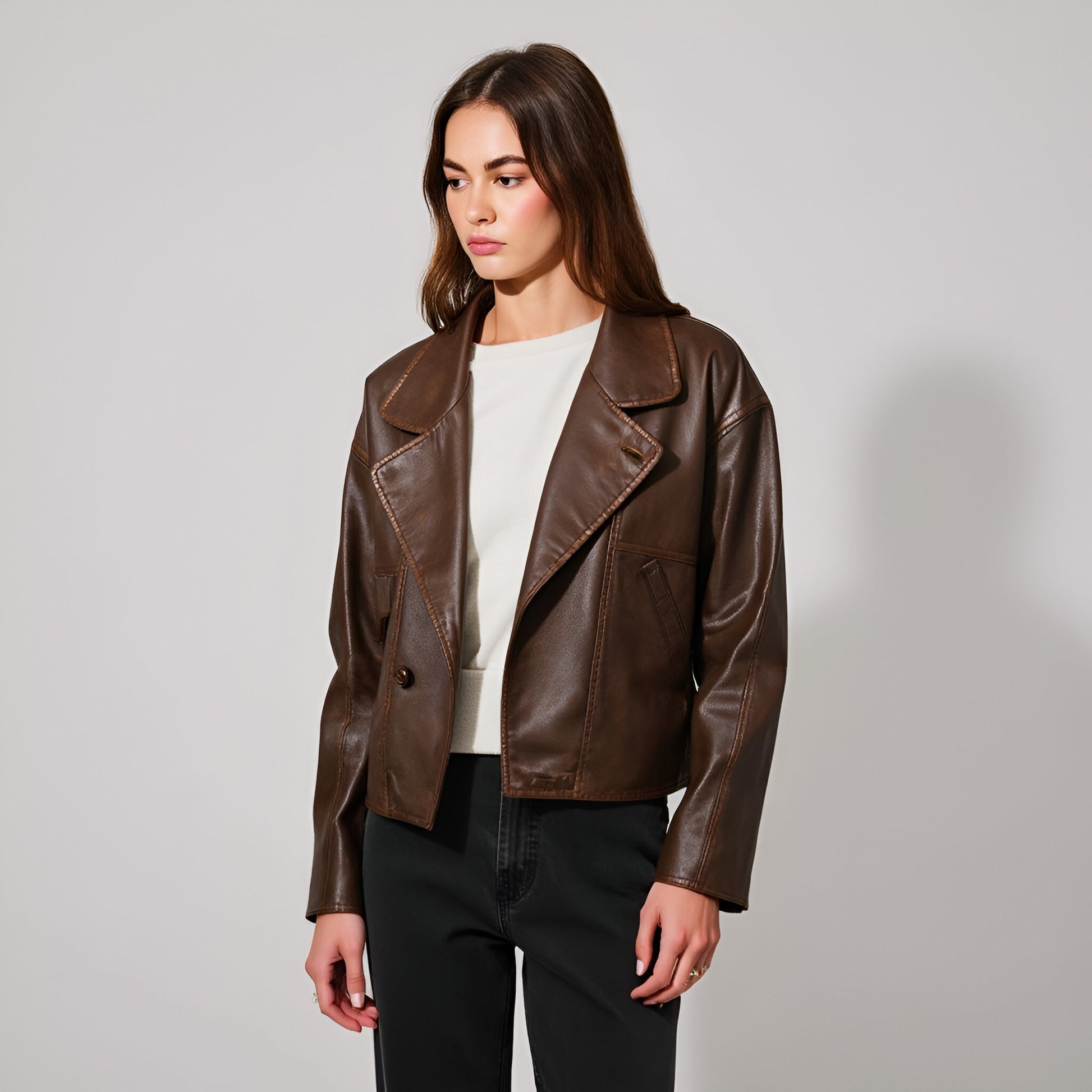 Faux Leather Cropped Jacket with Notched Lapels and Single-Breasted Closure