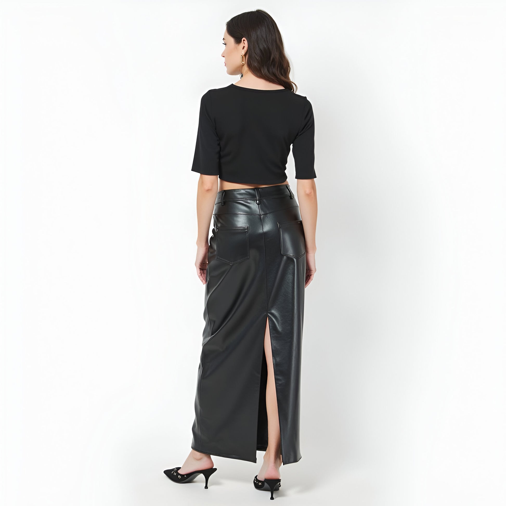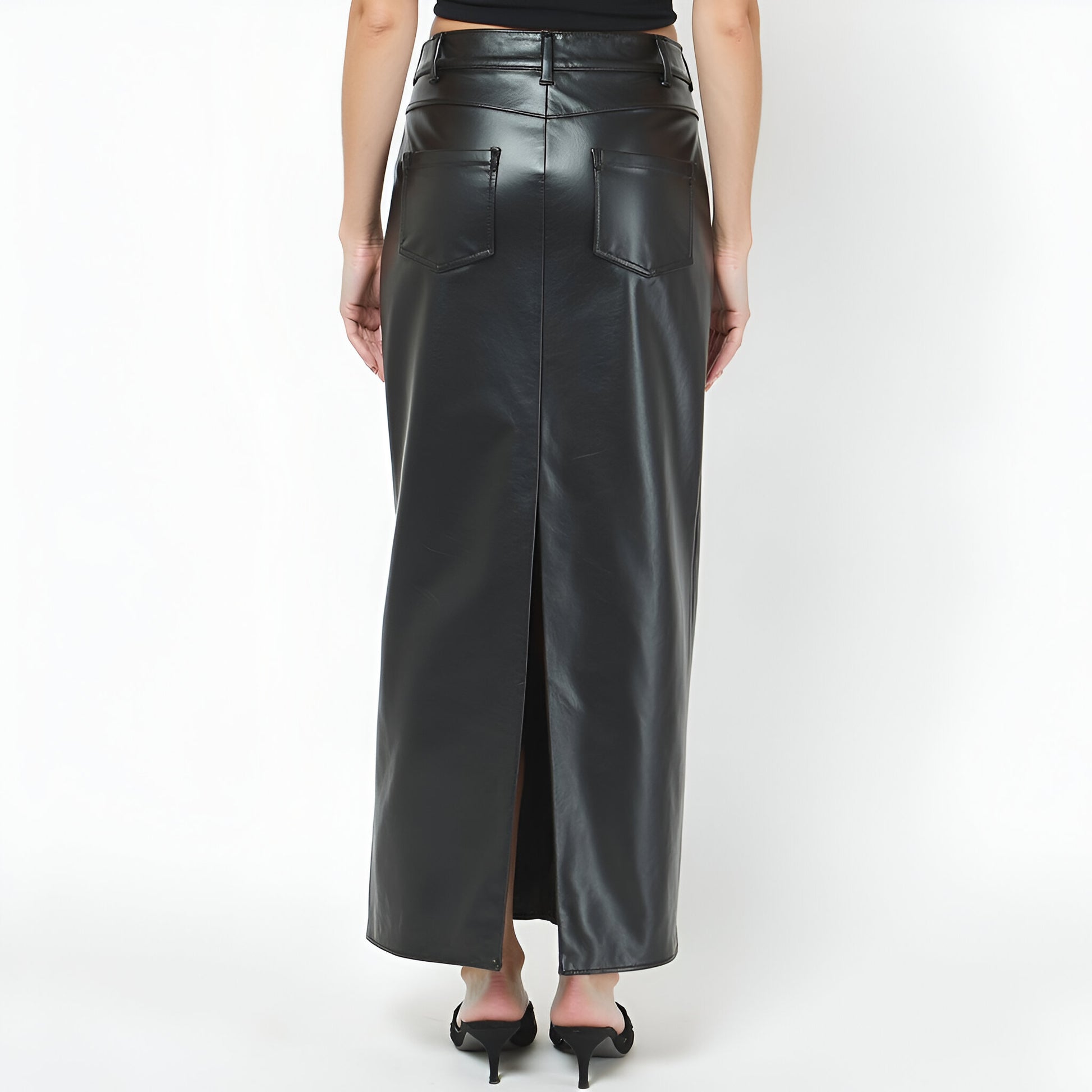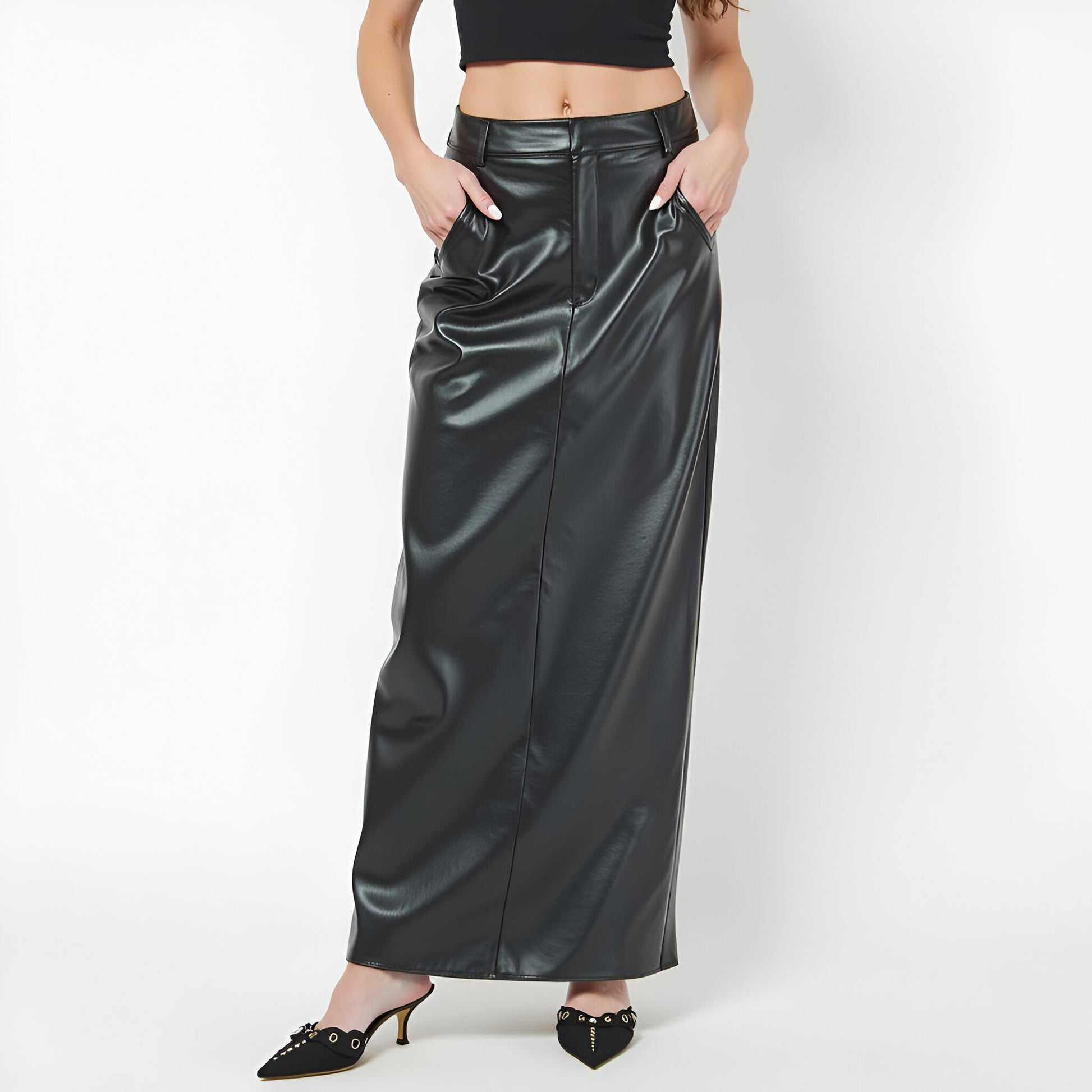 Faux Leather Maxi Skirt with Back Slit, Patch Pockets and High Waistband