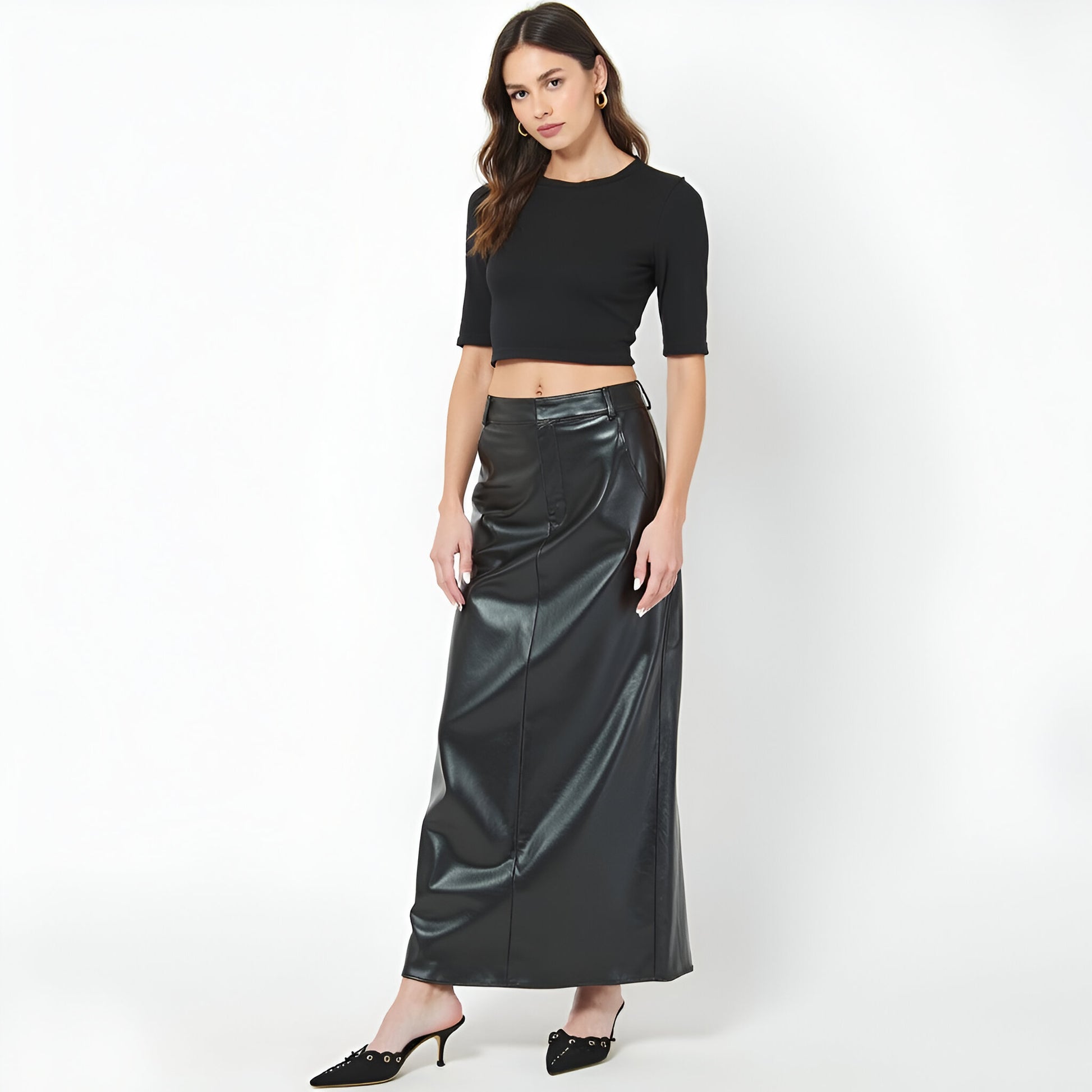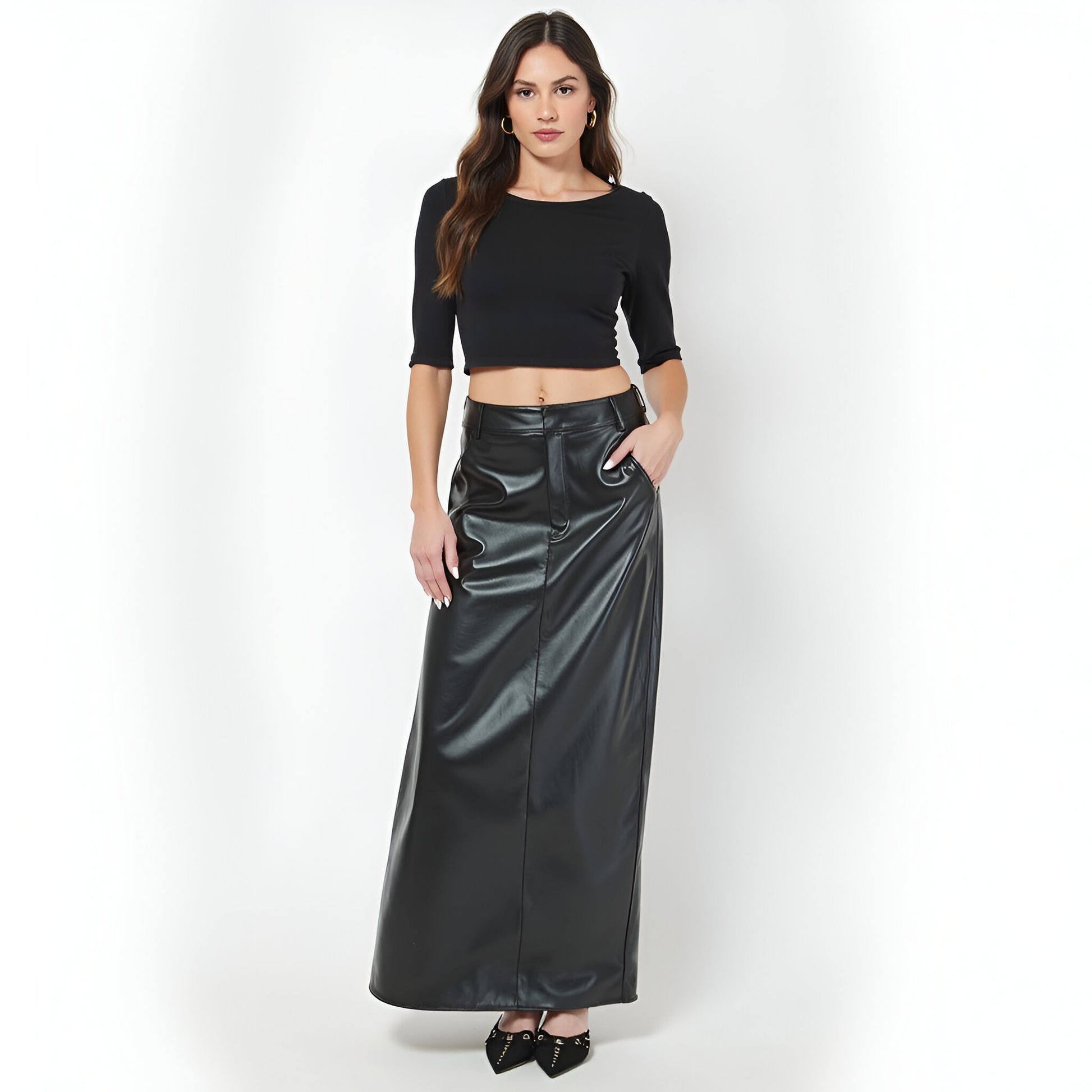 This sleek faux leather maxi skirt brings a modern edge to your wardrobe with its glossy finish and structured silhouette. Designed with a high waistband, convenient front and back patch pockets, and a dramatic back slit for easy movement, this skirt balances style and practicality. The full-length cut elongates the legs, while the soft, supple material ensures a comfortable fit. Pair it with heels or boots for a versatile look that transitions seamlessly from day to night.
