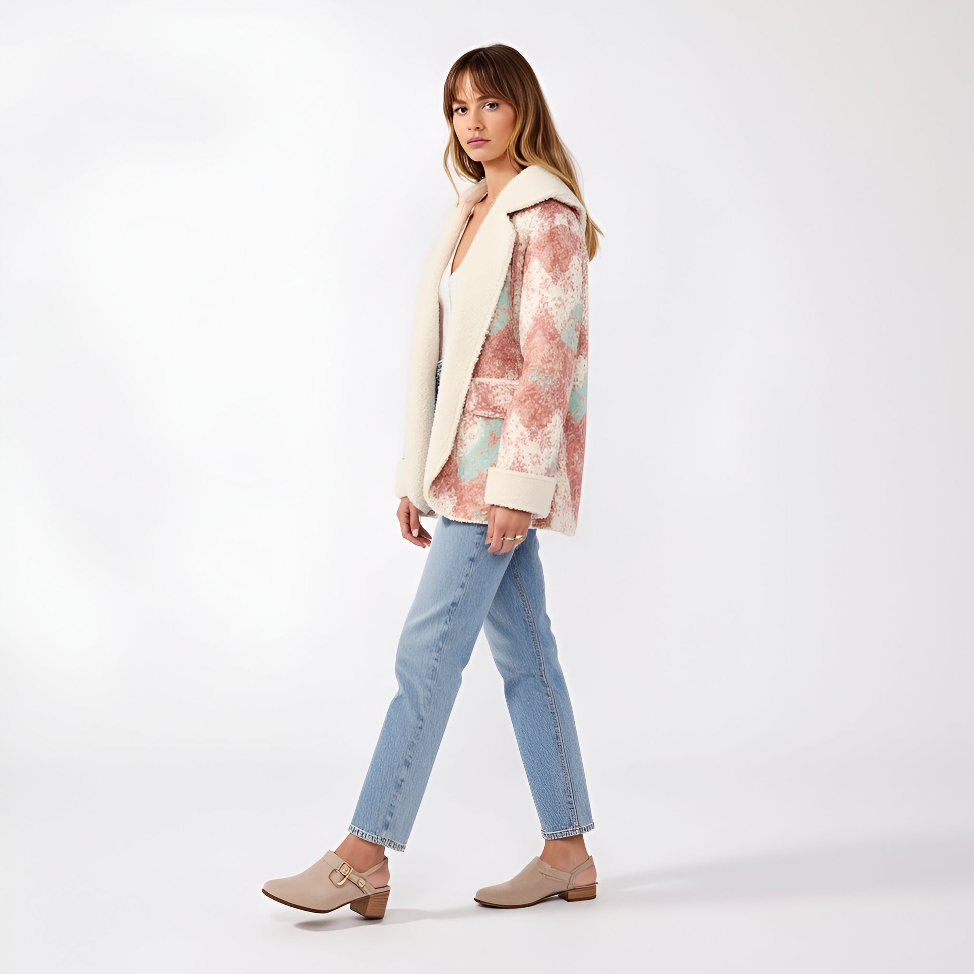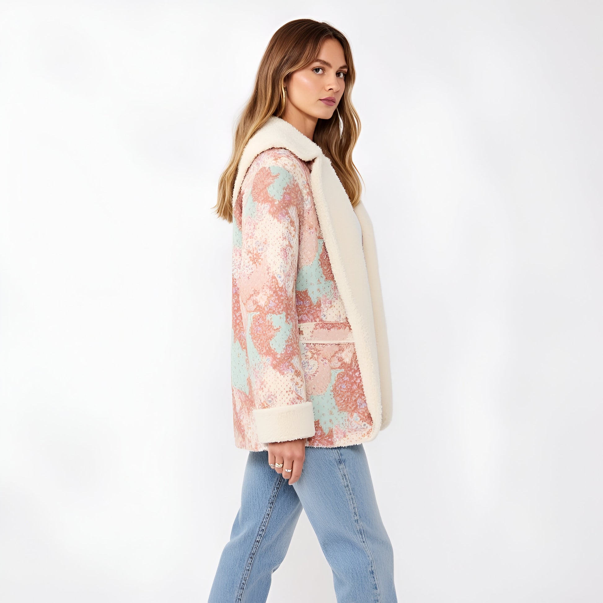 This cozy jacket features a vintage-inspired floral patchwork print, elevated with plush sherpa trim along the collar, cuffs, and front opening. The oversized hood and roomy fit add extra warmth and comfort, while the relaxed silhouette makes for easy layering. Front patch pockets complete the look, blending charm with everyday practicality. Perfect for adding a touch of softness and personality to your cool-weather wardrobe.