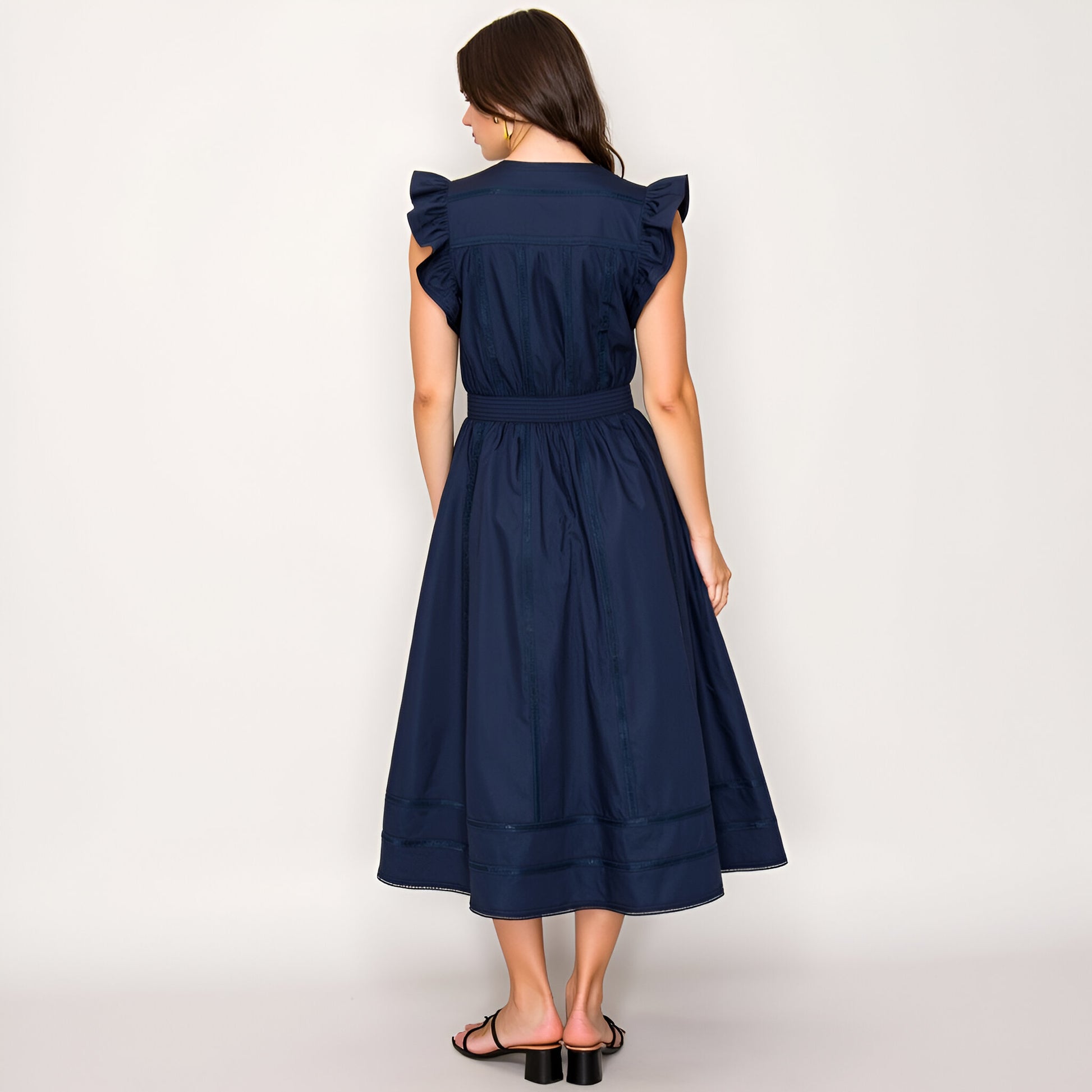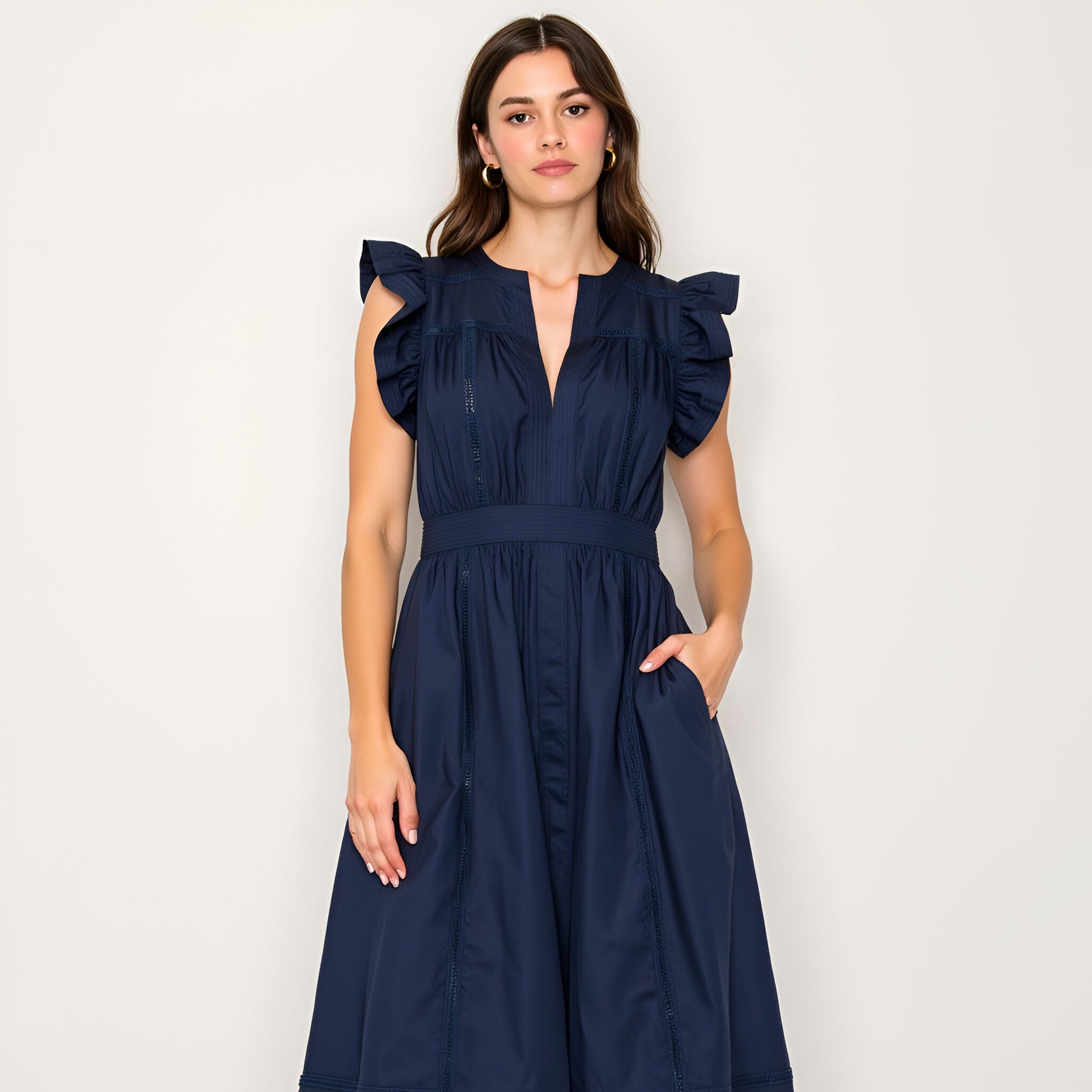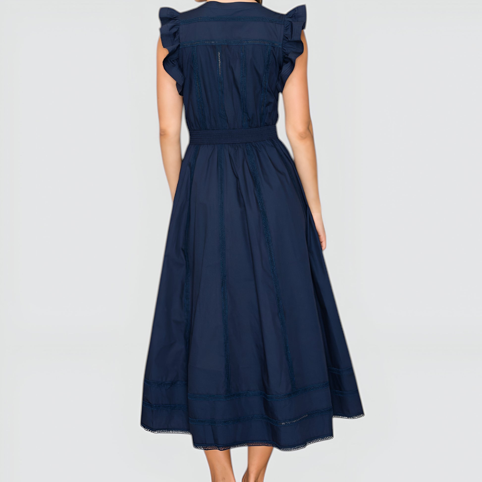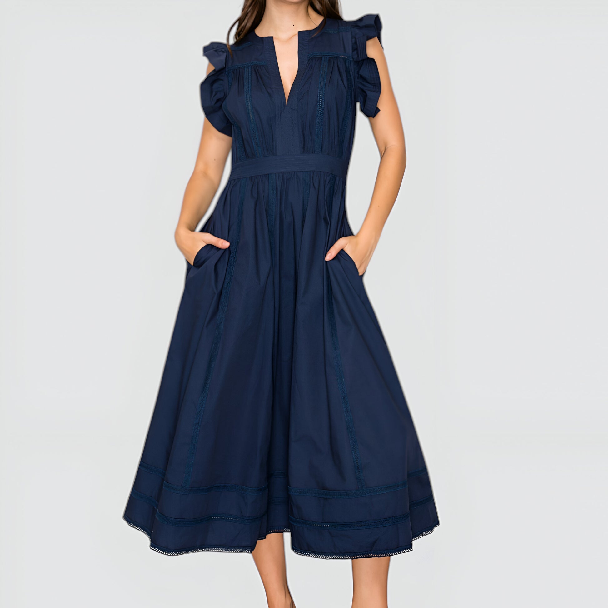 This elegant midi dress features flutter sleeves and a flattering deep V-neckline for a feminine touch. Intricate seaming and a defined waistband create a beautifully tailored silhouette, while the tiered skirt adds movement and charm. Crafted from a lightweight woven fabric, it’s finished with subtle lace insets at the hem for extra detail. Dress it up with strappy heels or keep it casual with flats for versatile day-to-evening style.