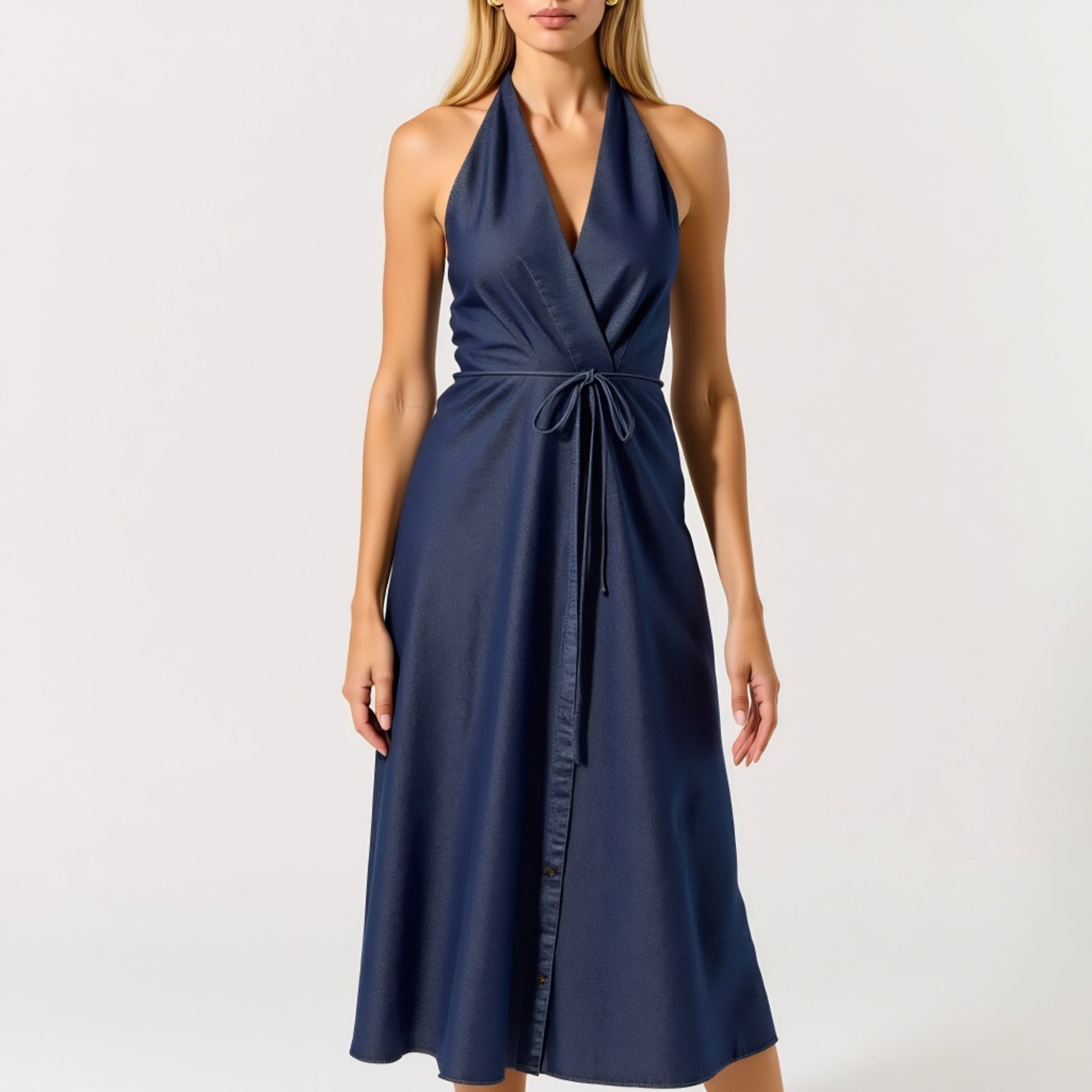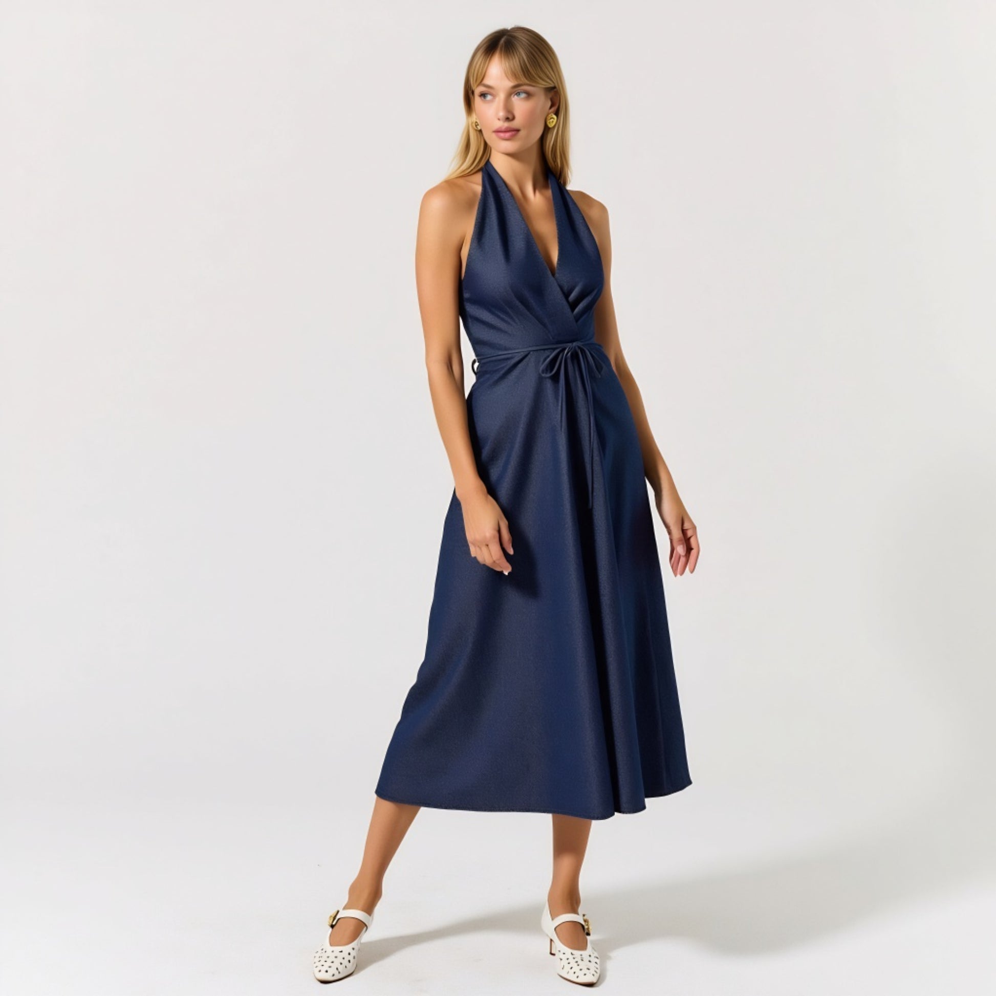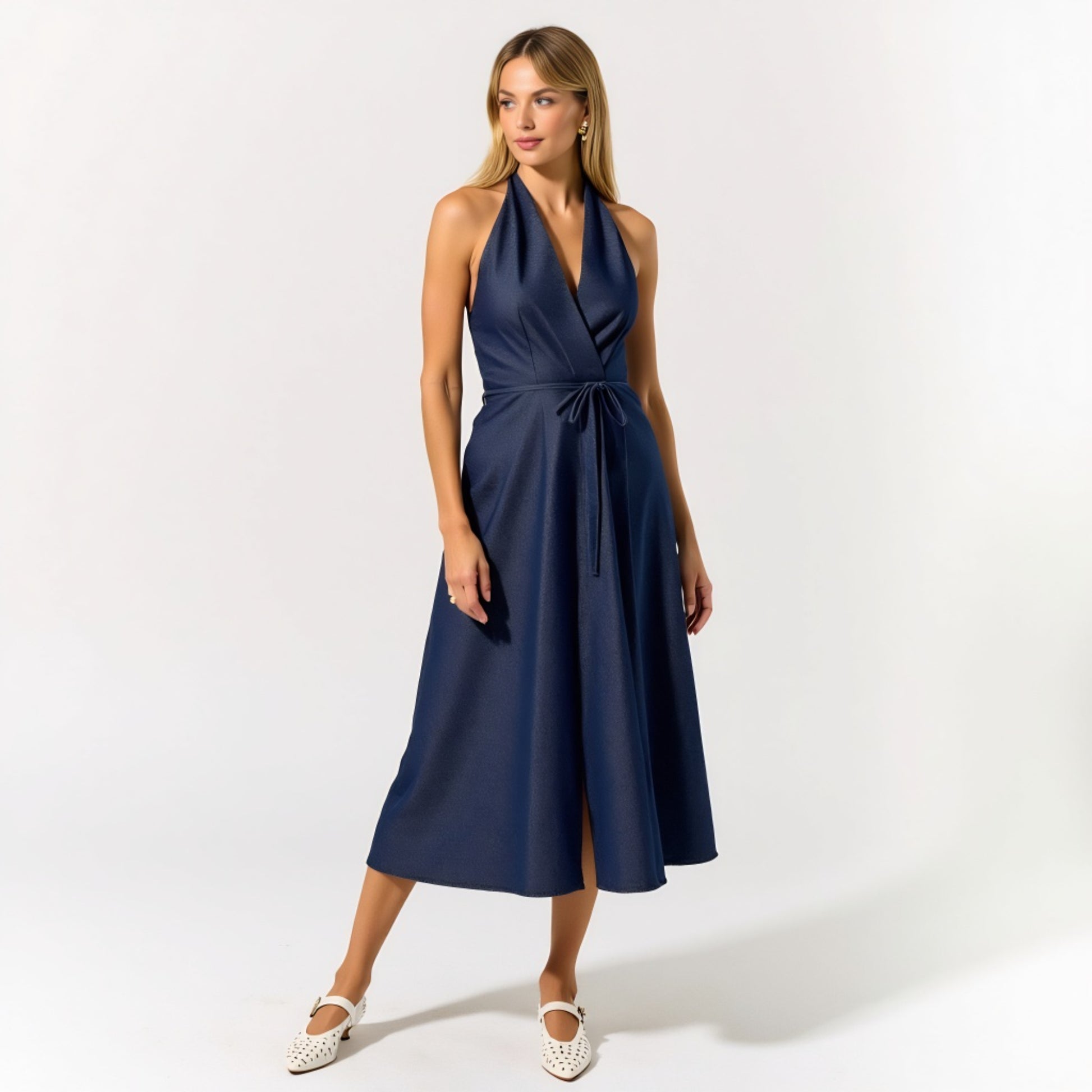 Halter Midi Dress with Wrap Front and Adjustable Waist Tie