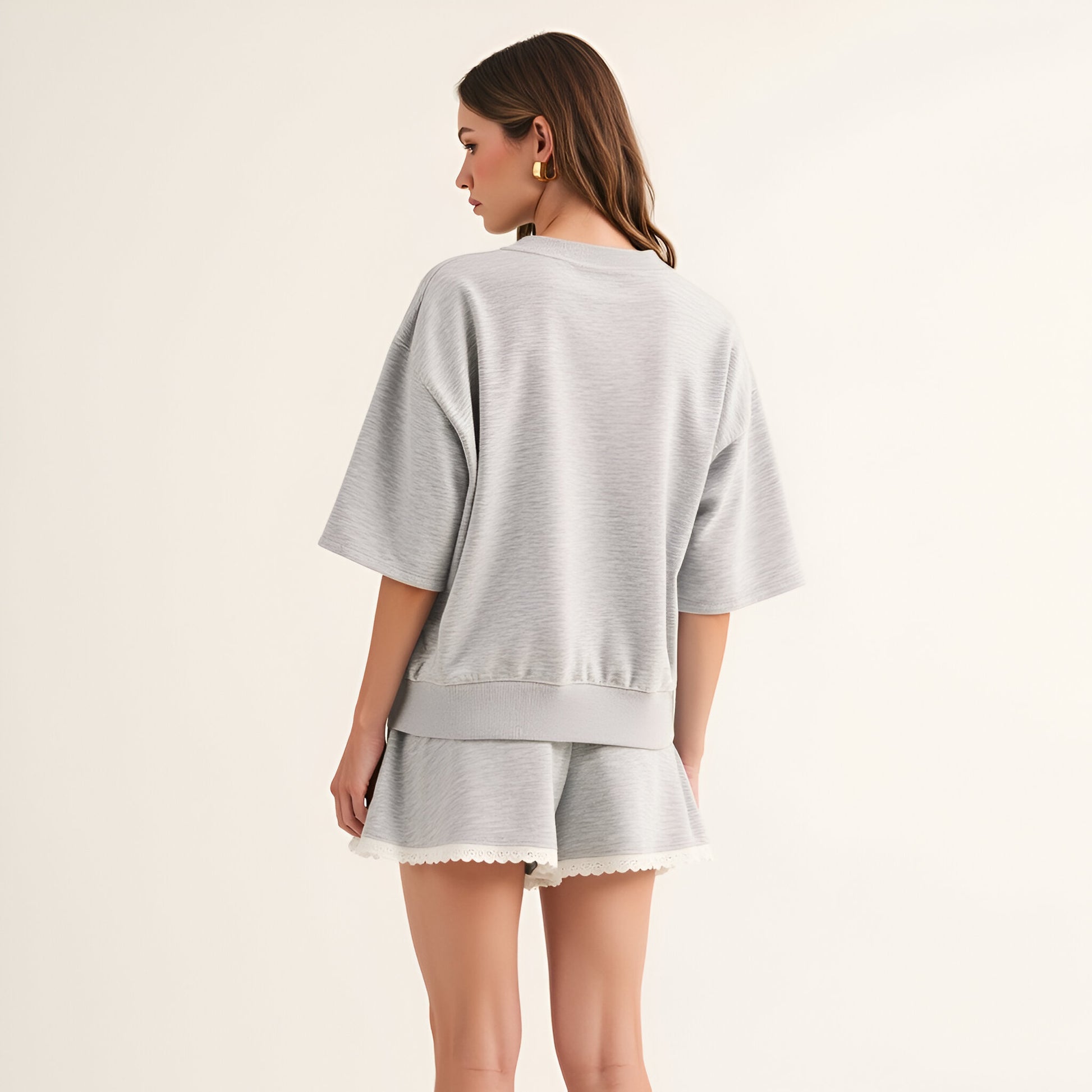 Lace Trim French Terry Lounge Set with Boxy Short Sleeve Top and Shorts