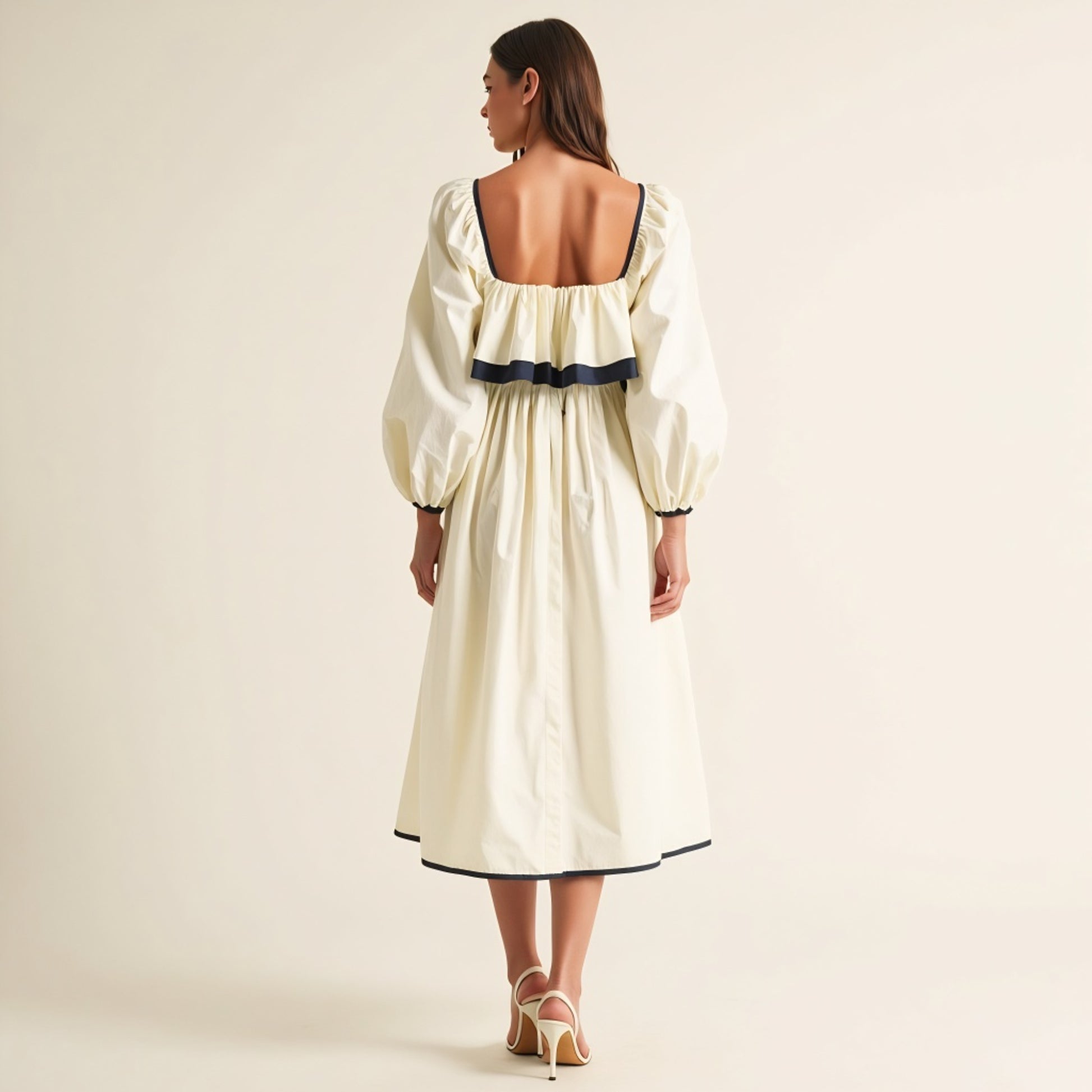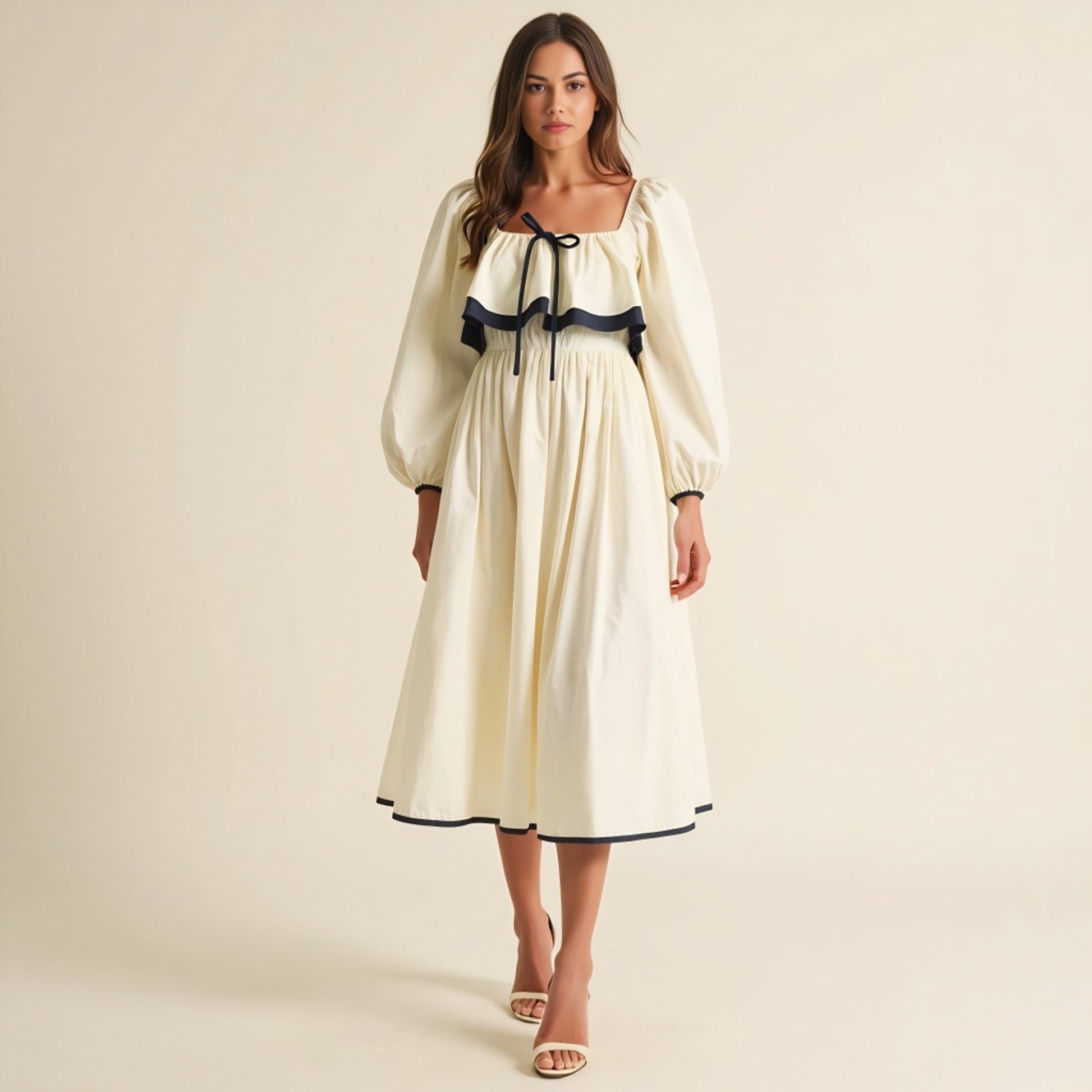 Romantic and timeless, this midi dress features voluminous long sleeves, a square neckline, and a charming ruffle-trimmed bodice accented with a dainty tie-front detail. The elastic waistband cinches at the waist for a flattering fit, while the flowy A-line skirt falls gracefully to mid-calf. Contrasting trim adds a touch of elegance to the cuffs, neckline, and hem, giving it a refined finish. Perfect for brunches, garden parties, or afternoon strolls, this dress delivers graceful femininity with every step.