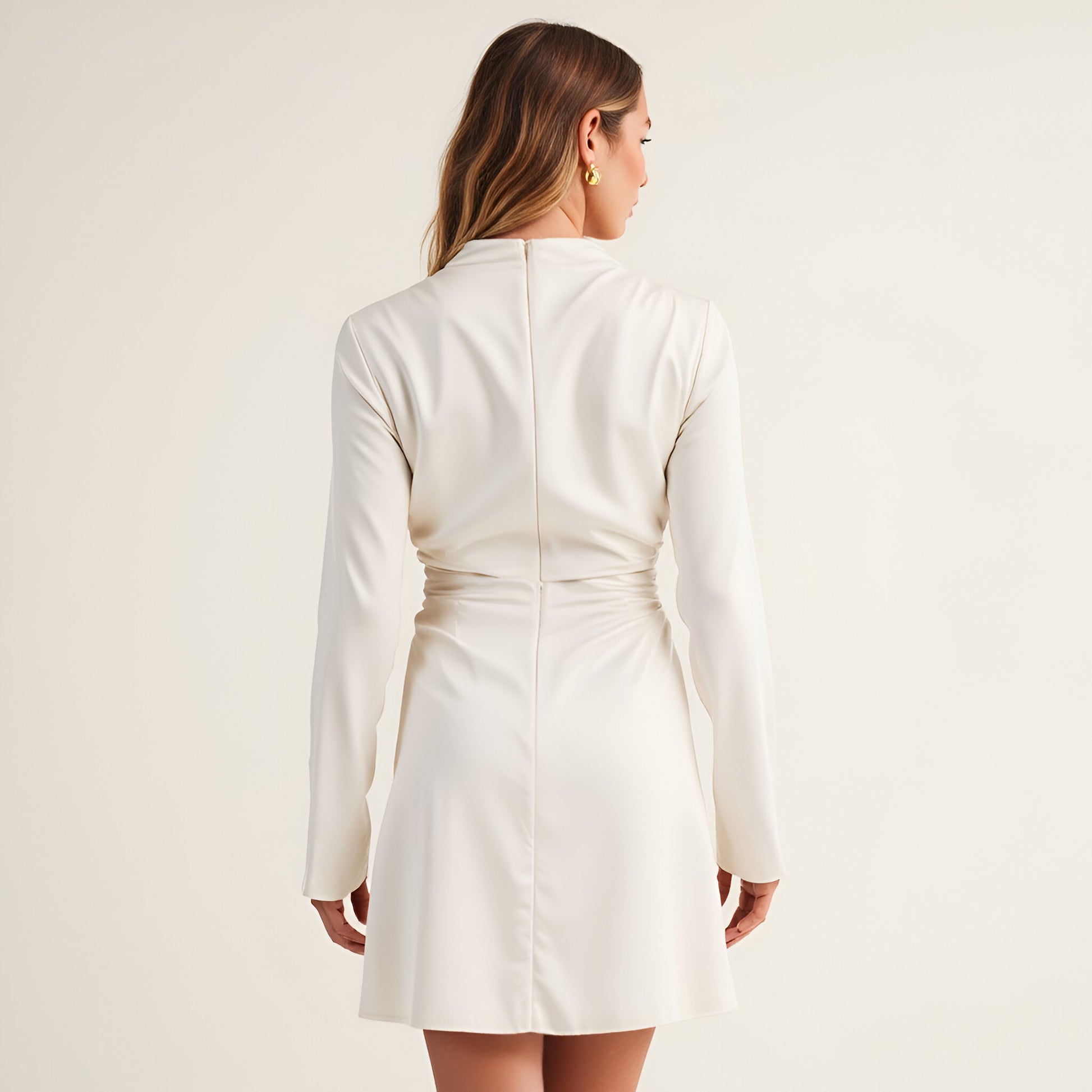 This satin mini dress embodies modern elegance with its smooth, lustrous fabric and refined drape. The high, softly draped neckline adds a sophisticated touch, while the fitted waist creates a flattering, feminine shape. Long sleeves provide a sleek balance to the short hemline, offering a chic and polished silhouette. Perfect for evening events or elevated occasions.
