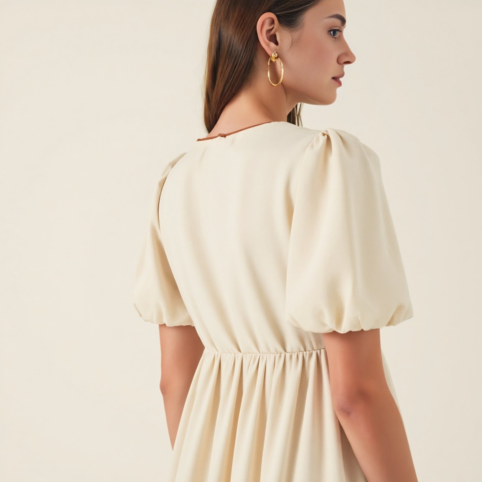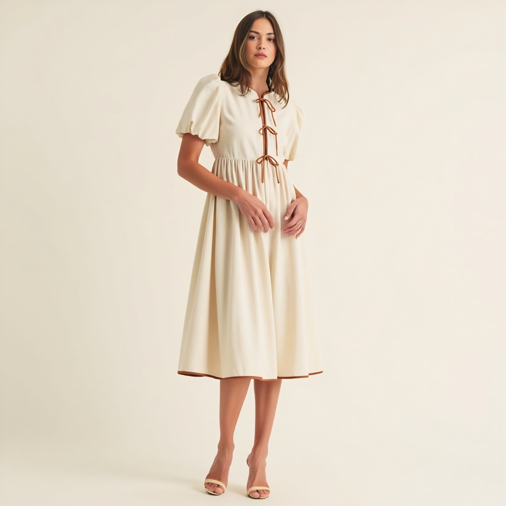 Elegant yet playful, this midi dress features voluminous puff sleeves and a trio of contrasting front bow ties that bring a delicate statement to the neckline. Designed with a softly gathered waist, the silhouette falls into a breezy A-line skirt finished with contrast piping at the hem for a polished touch. The combination of structured details and feminine accents makes this style perfect for brunches, picnics, or casual daytime outings with a refined flair.