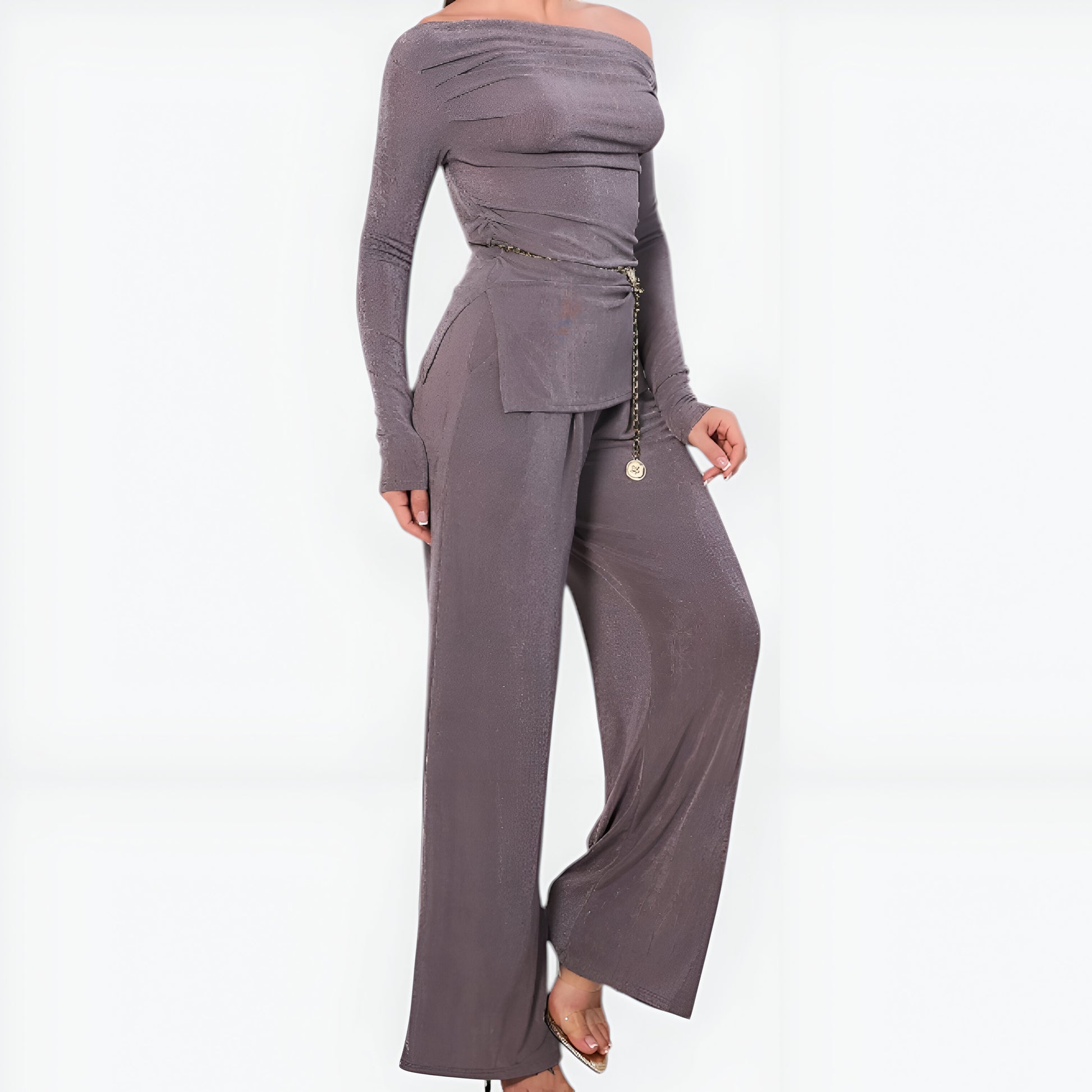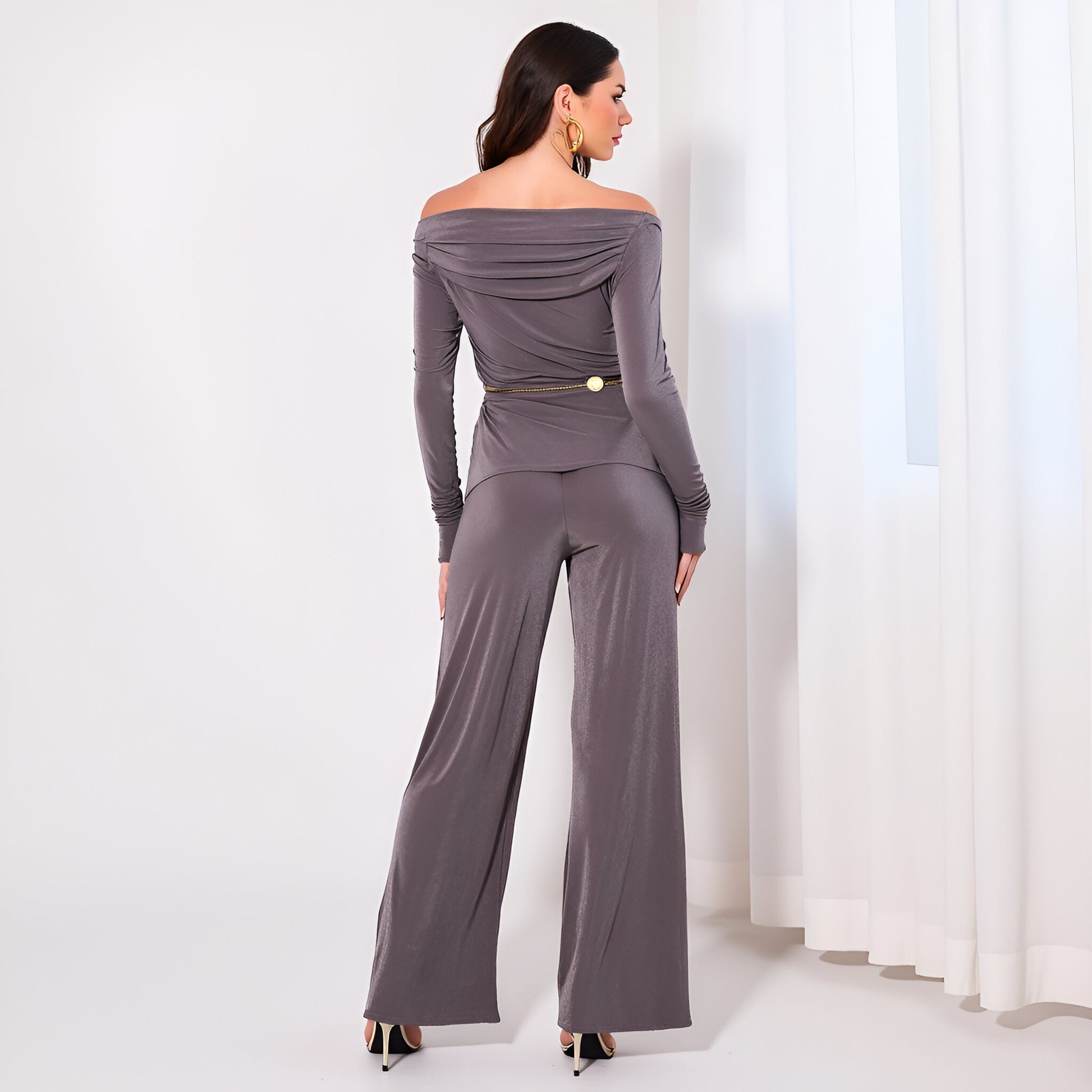 This sophisticated set features an off-shoulder draped knit top with elegant pleating and a fitted waist for a modern, sculpted silhouette. The coordinating wide leg pants flow effortlessly for a look that’s both relaxed and refined. The soft, stretch-infused fabric ensures a comfortable feel from day to night, making this set a standout choice for any elevated occasion. The chain belt is not included.