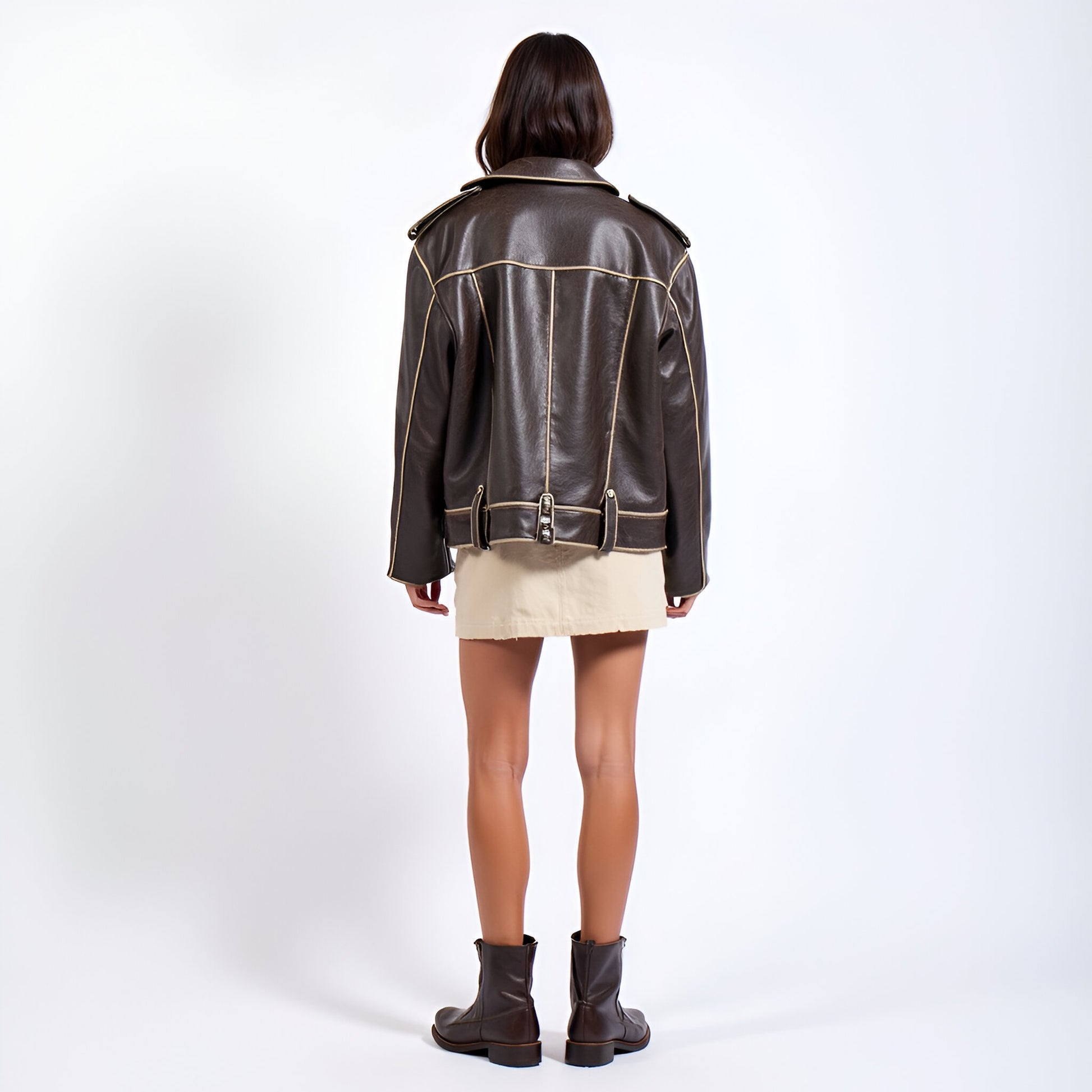 Oversized Faux Leather Moto Jacket with Contrast Piping and Zip Detail
