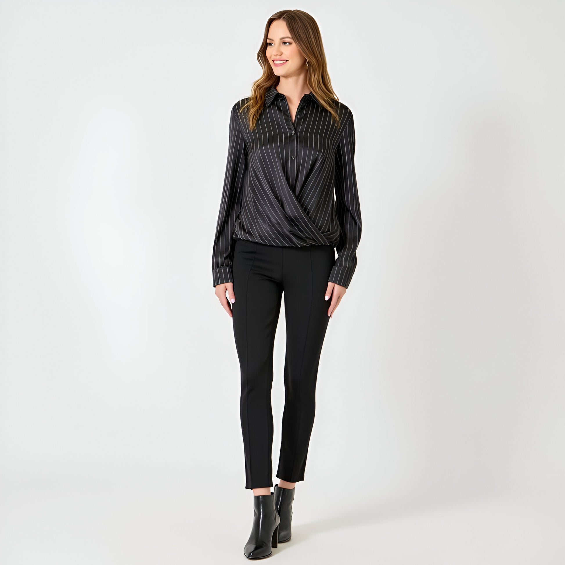 Pinstripe Satin Blouse with Wrap Front and Collared Neckline